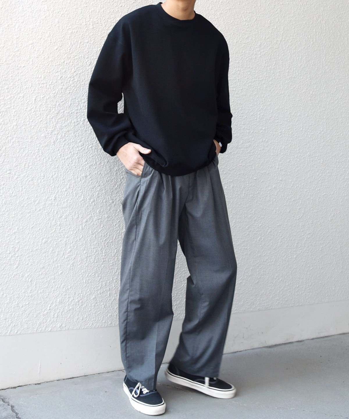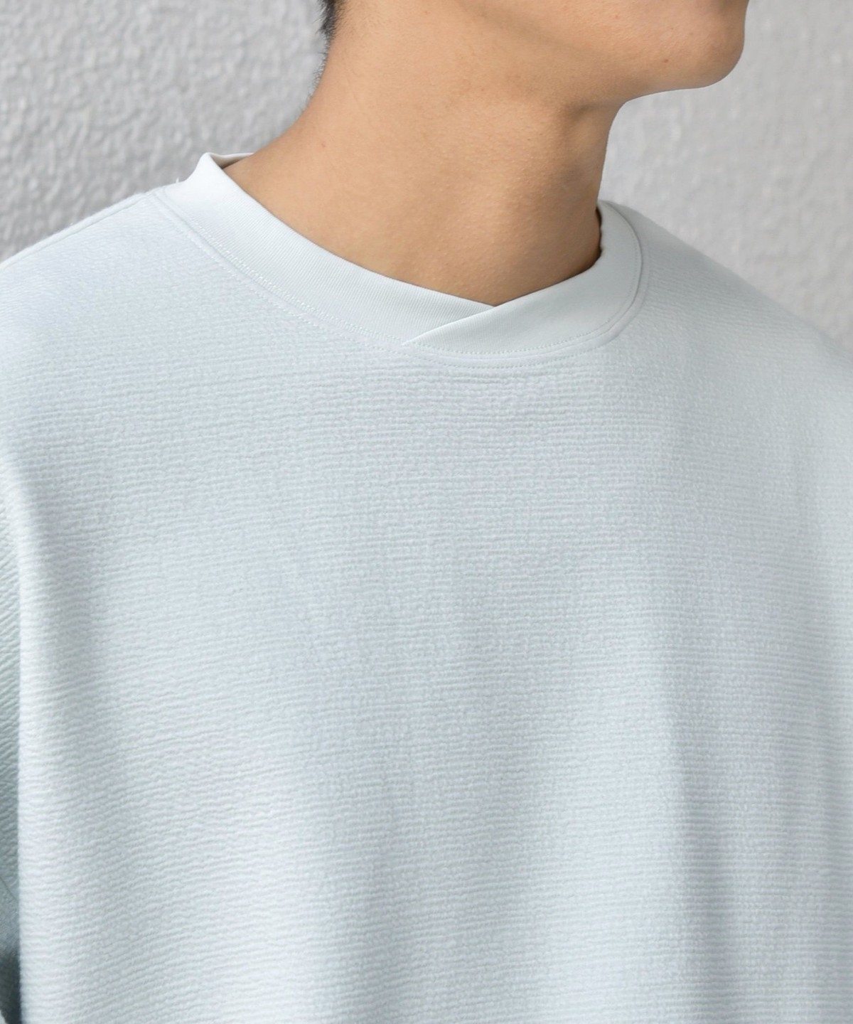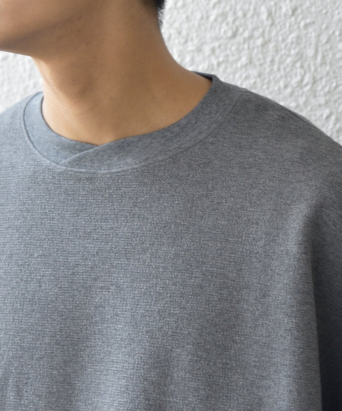 首元は、リブが前中心で重なるデザインでクルーネックよりも立体感がありシンプルながらアクセントの効いた表情に仕上がっています。