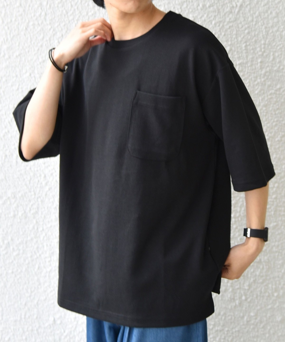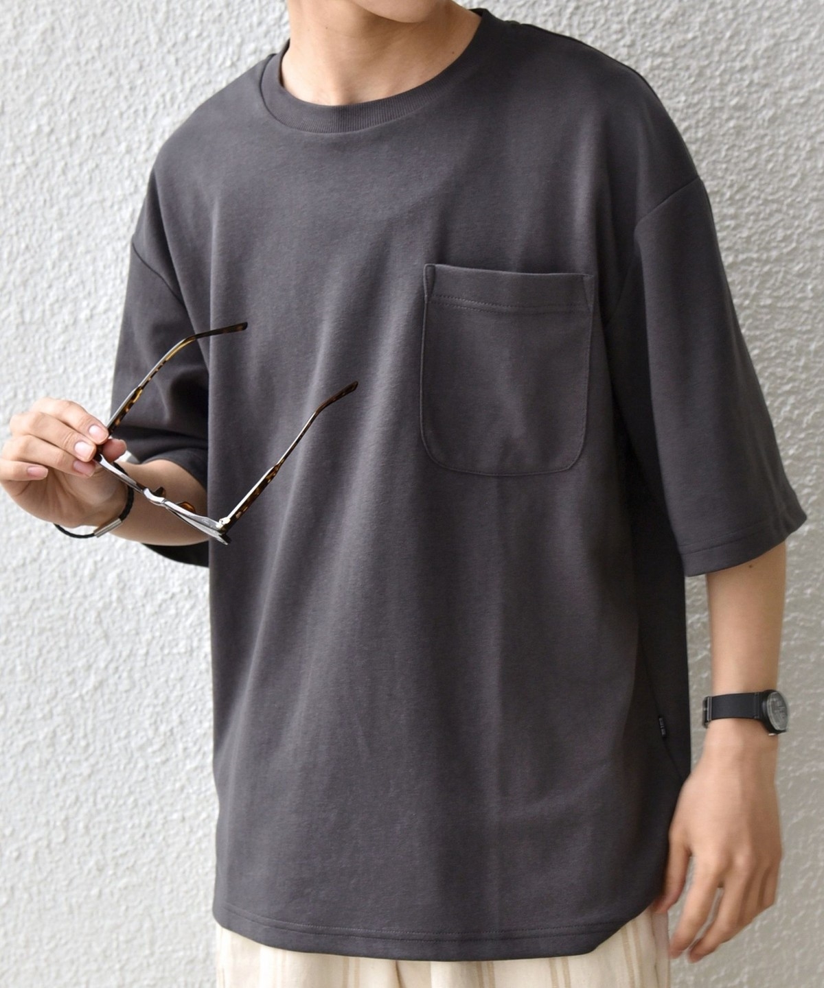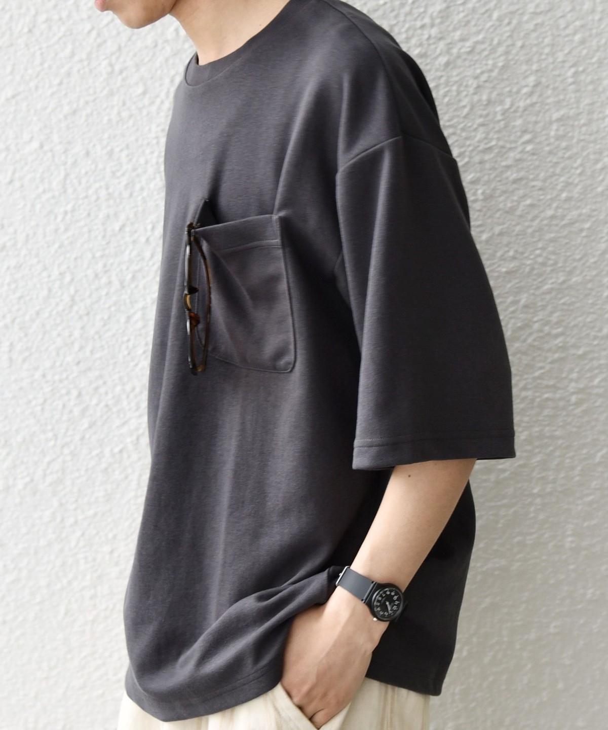 ゆったりとしたシルエットのシンプルなポケットTシャツ。