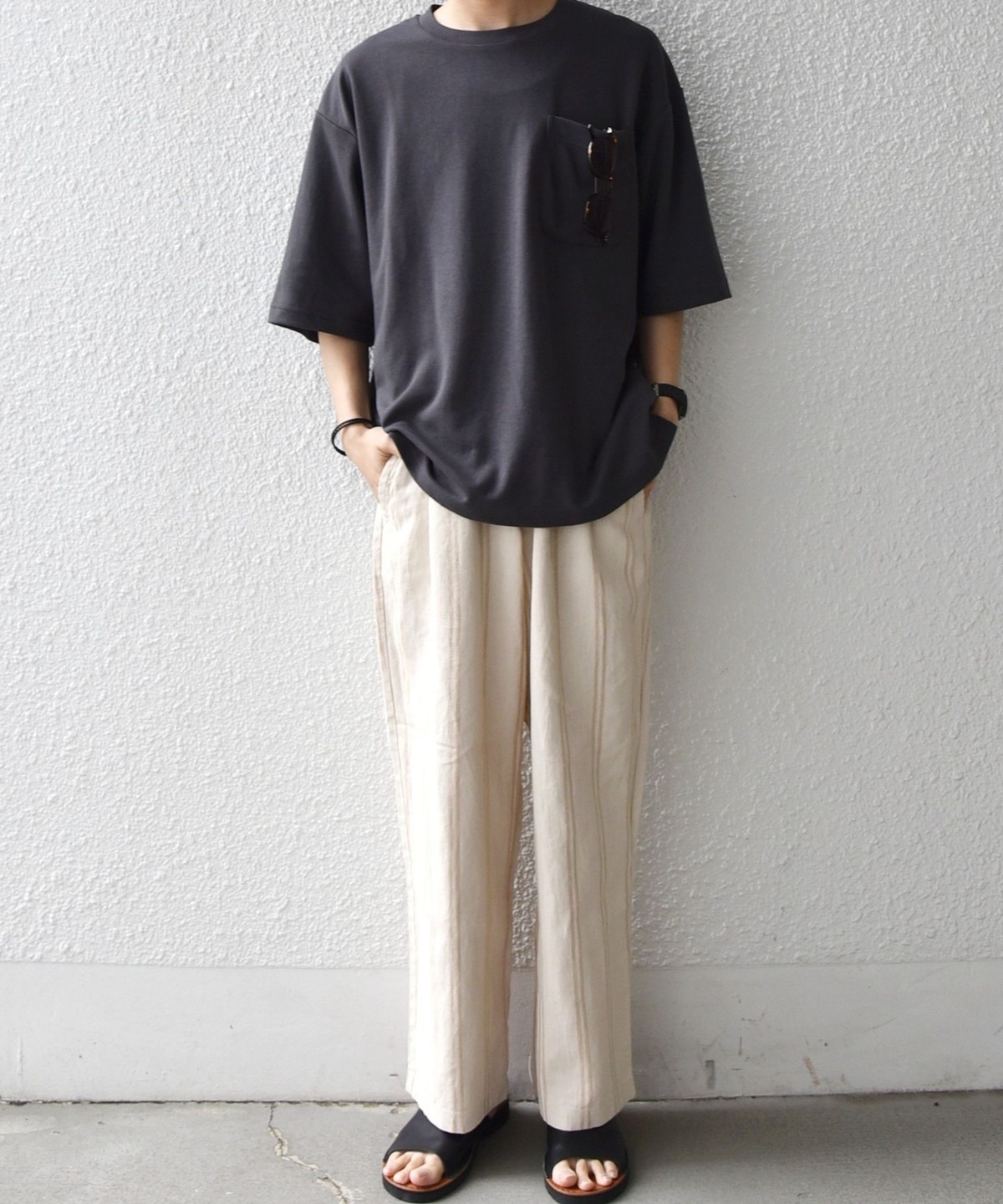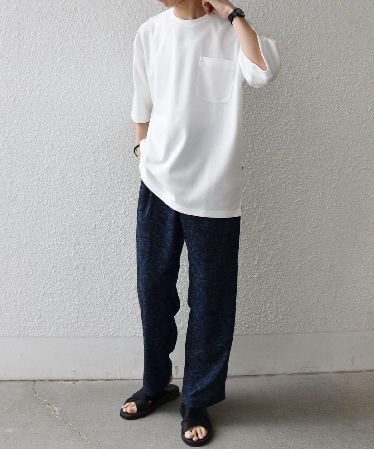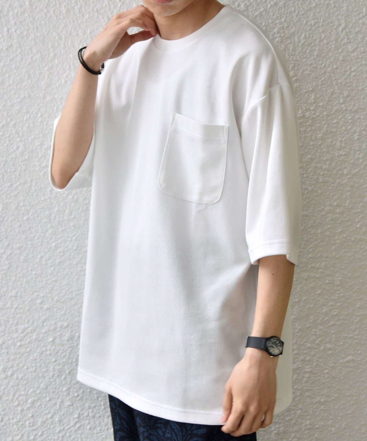 ゆったりとしたシルエットのシンプルなポケットTシャツ。