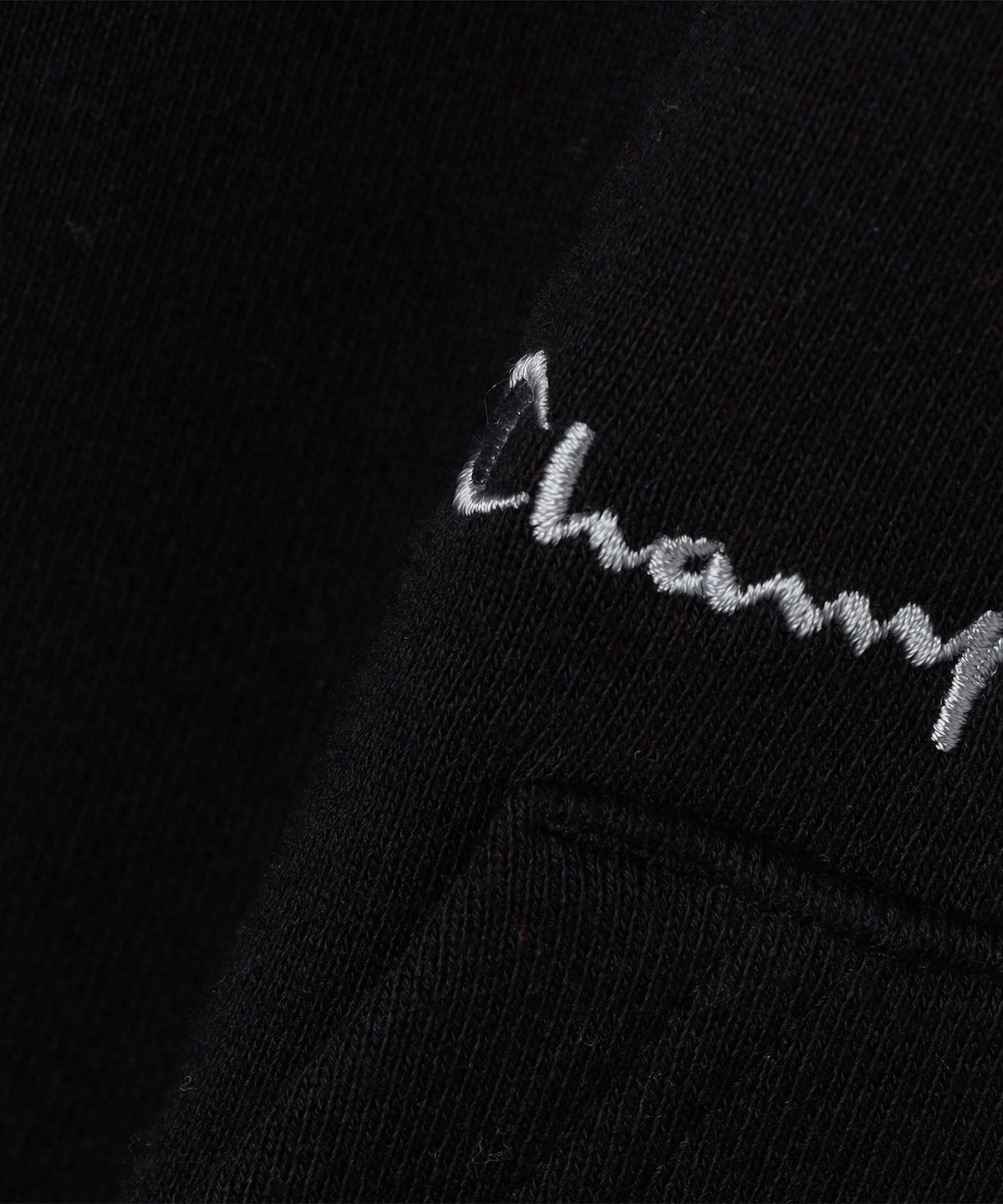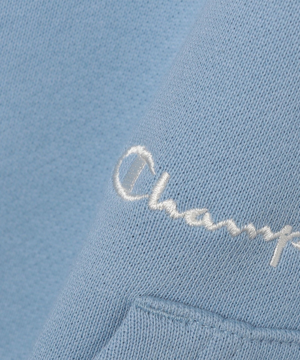左袖のロゴマークに加え、カンガルーポケット上部にドローコードと同色でチャンピオンのスクリプトロゴ刺繍を追加。