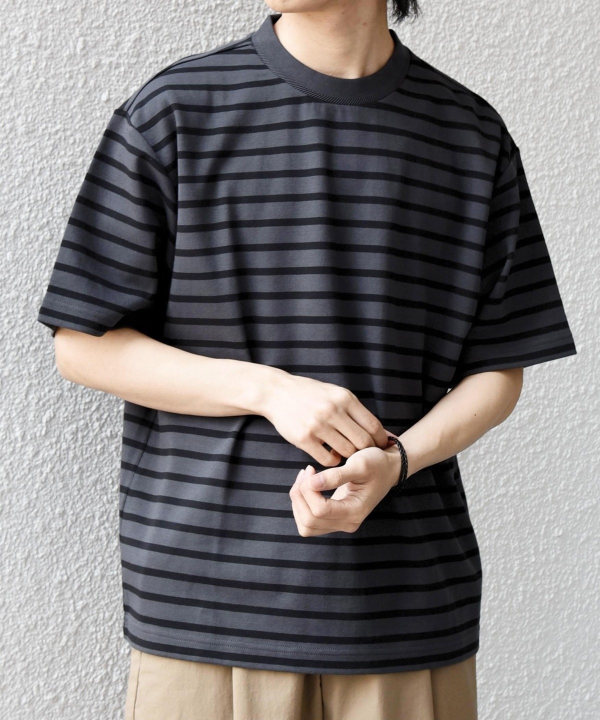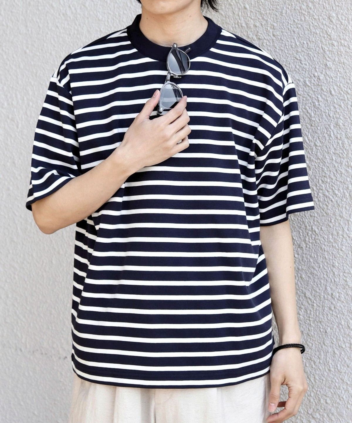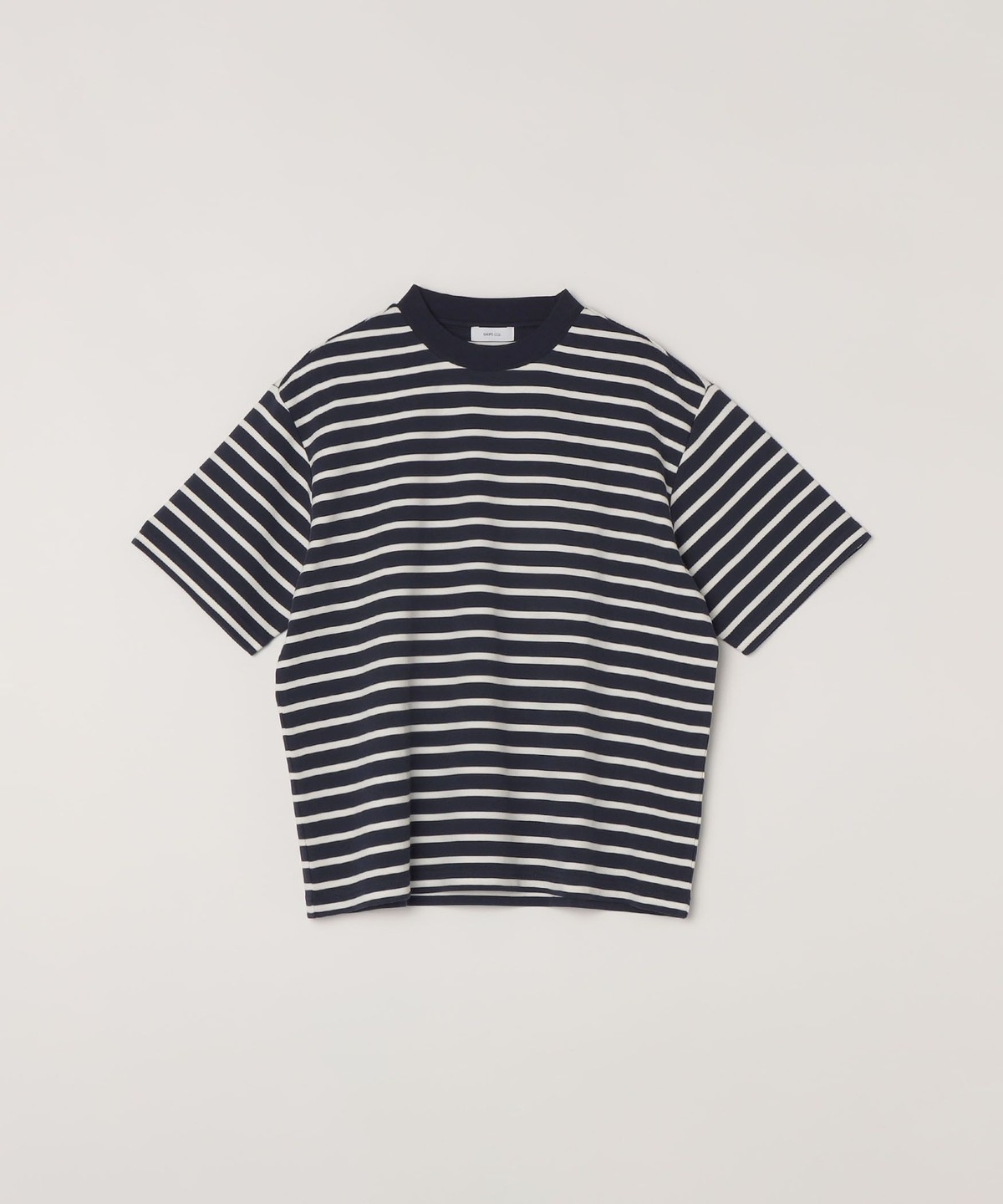 襟リブ部分に編みで柄を表現し、さりげないアクセントをプラスしたボーダーTEE。