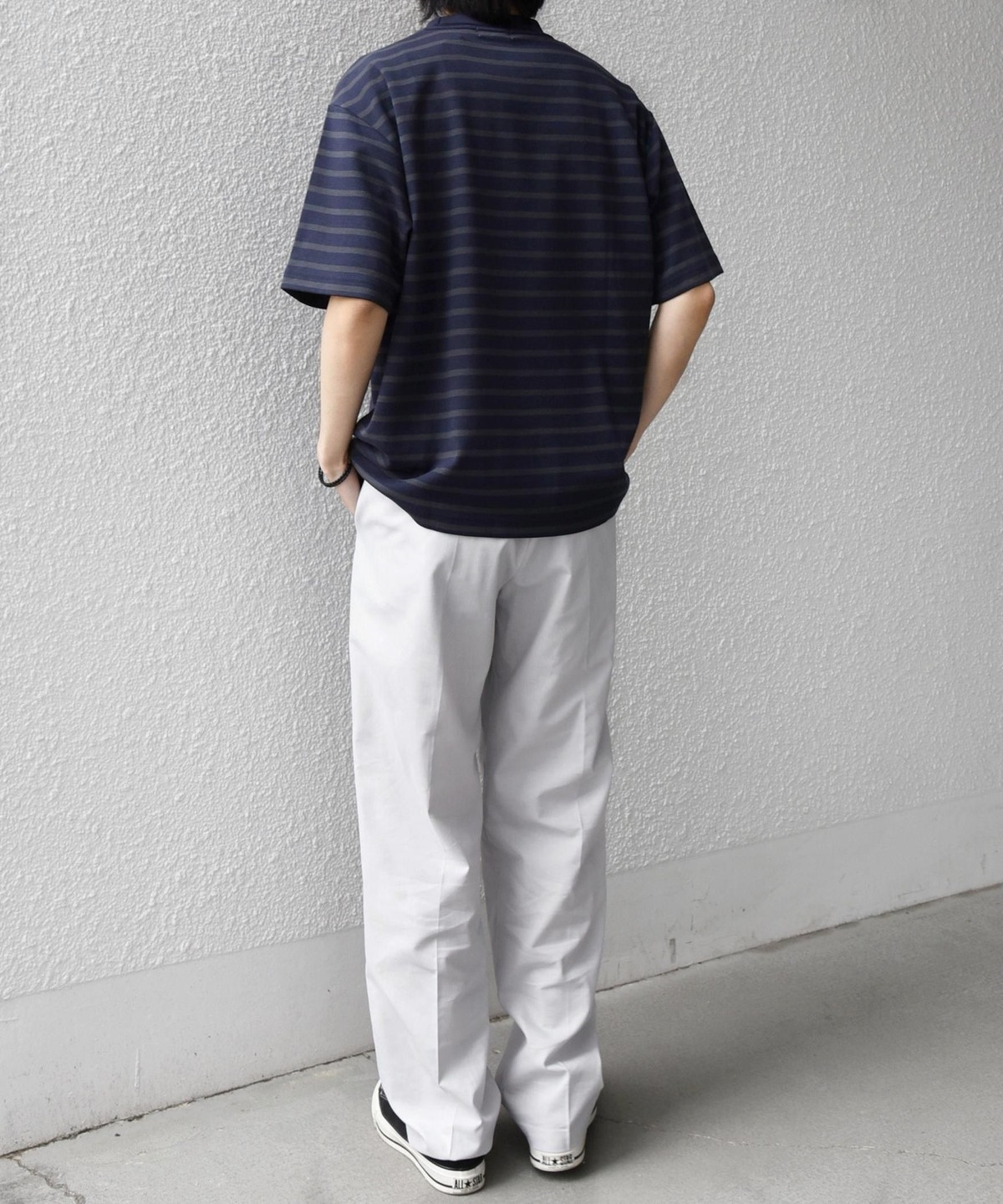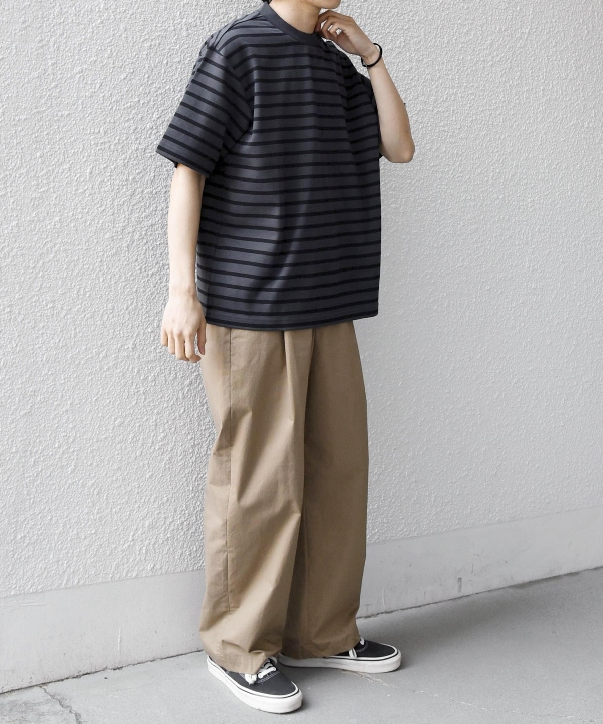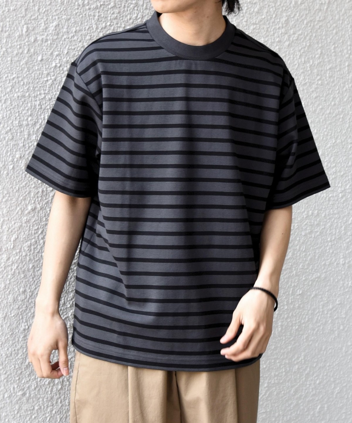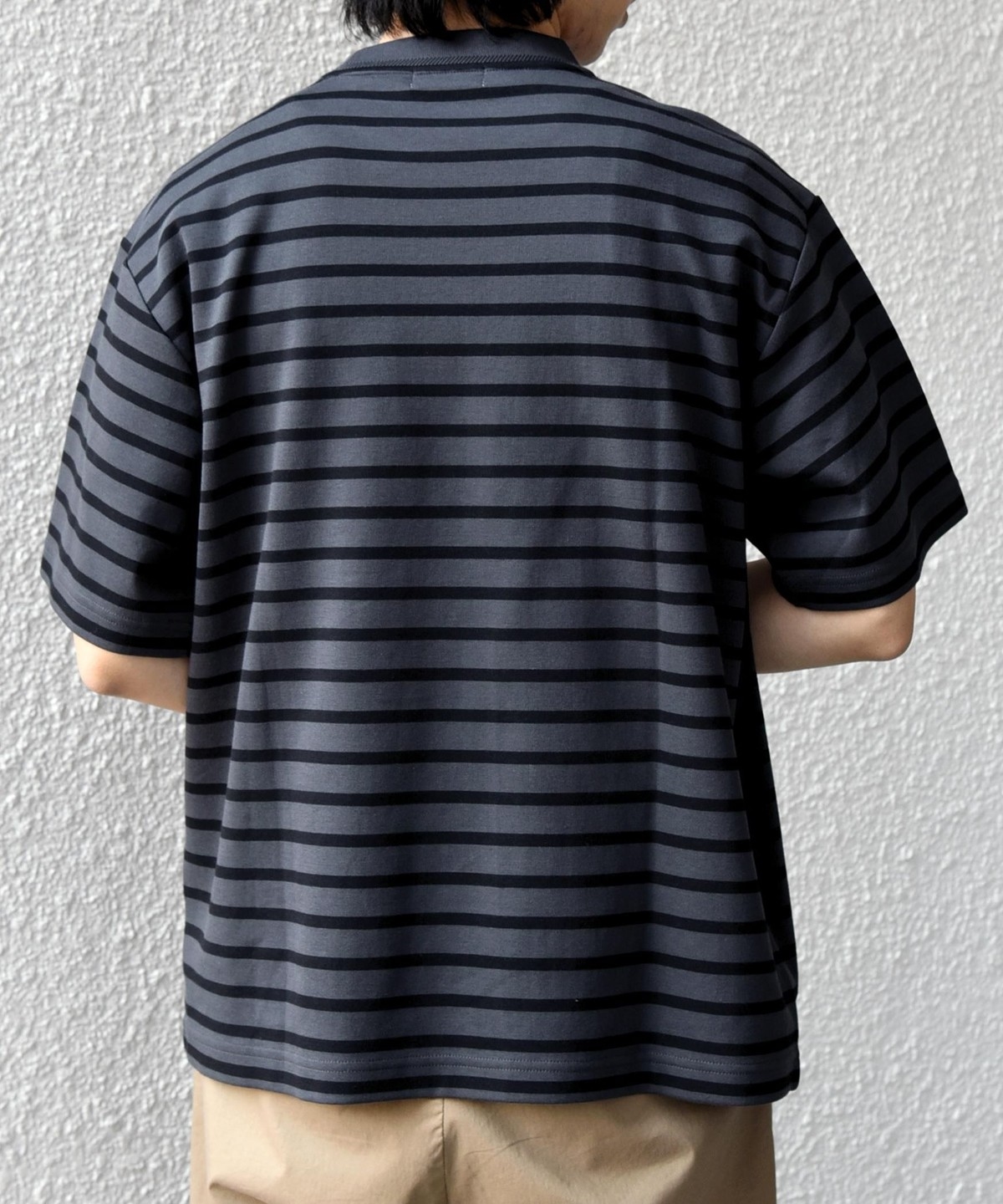 襟リブ部分に編みで柄を表現し、さりげないアクセントをプラスしたボーダーTEE。