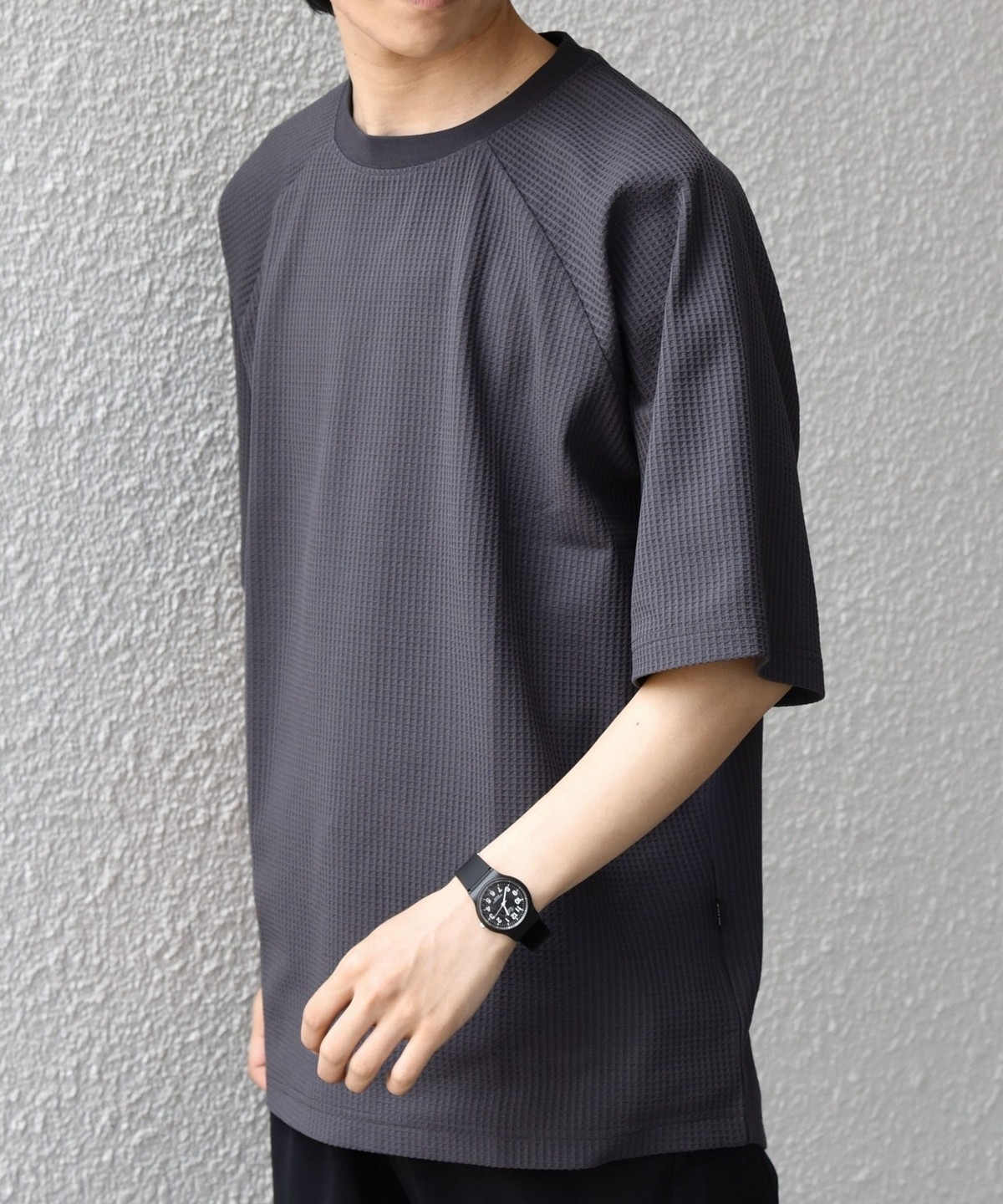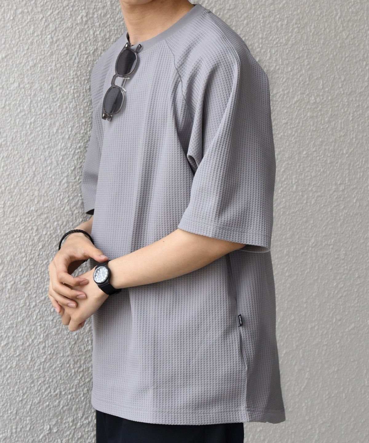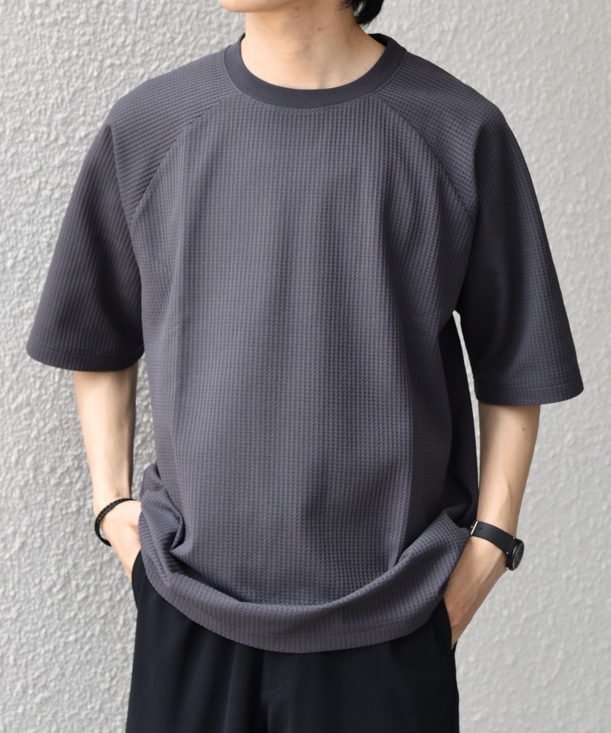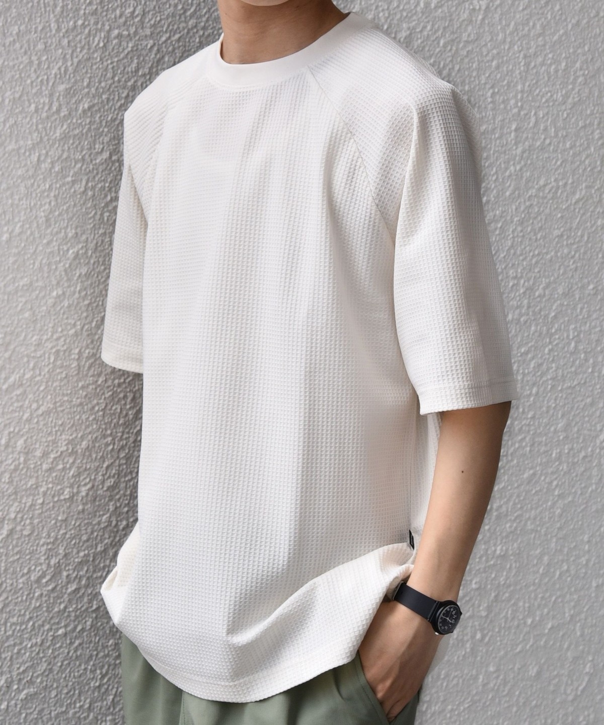 さらっとした着心地のワッフル素材を使用した、シンプルなTシャツ
