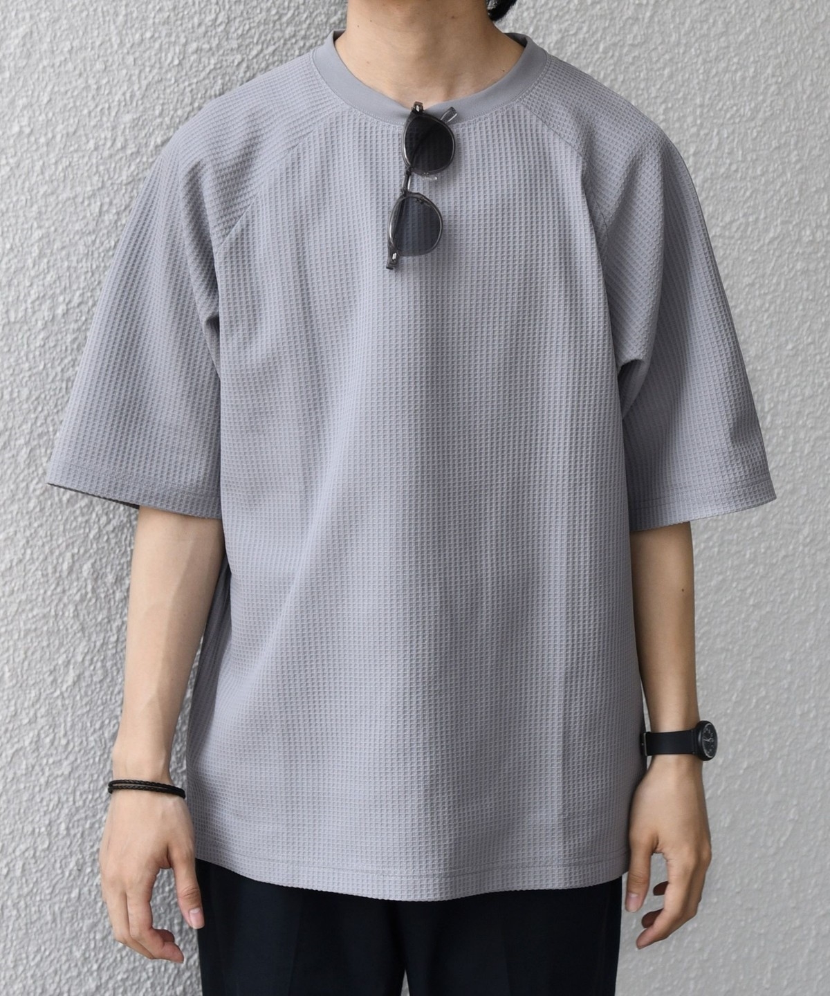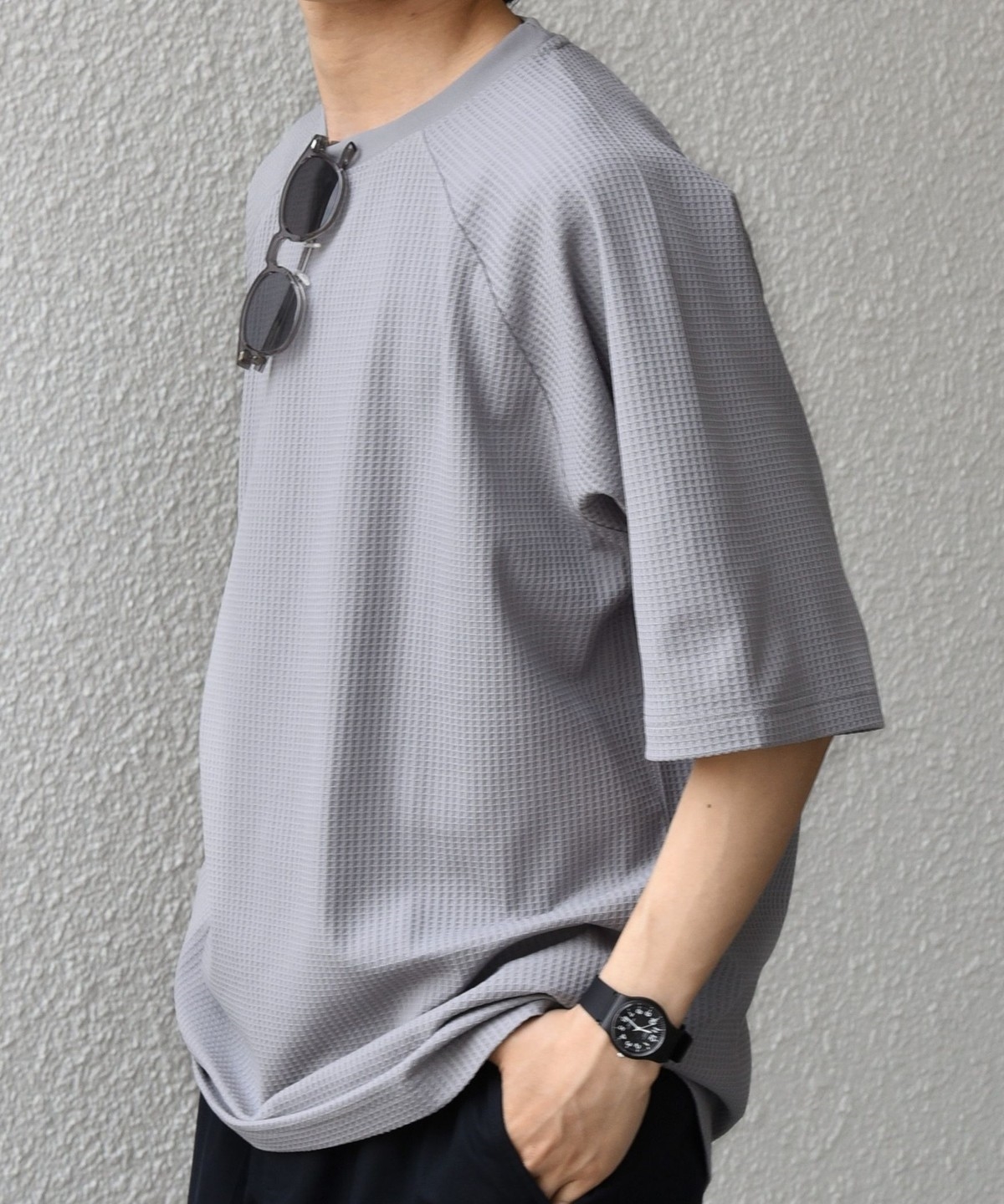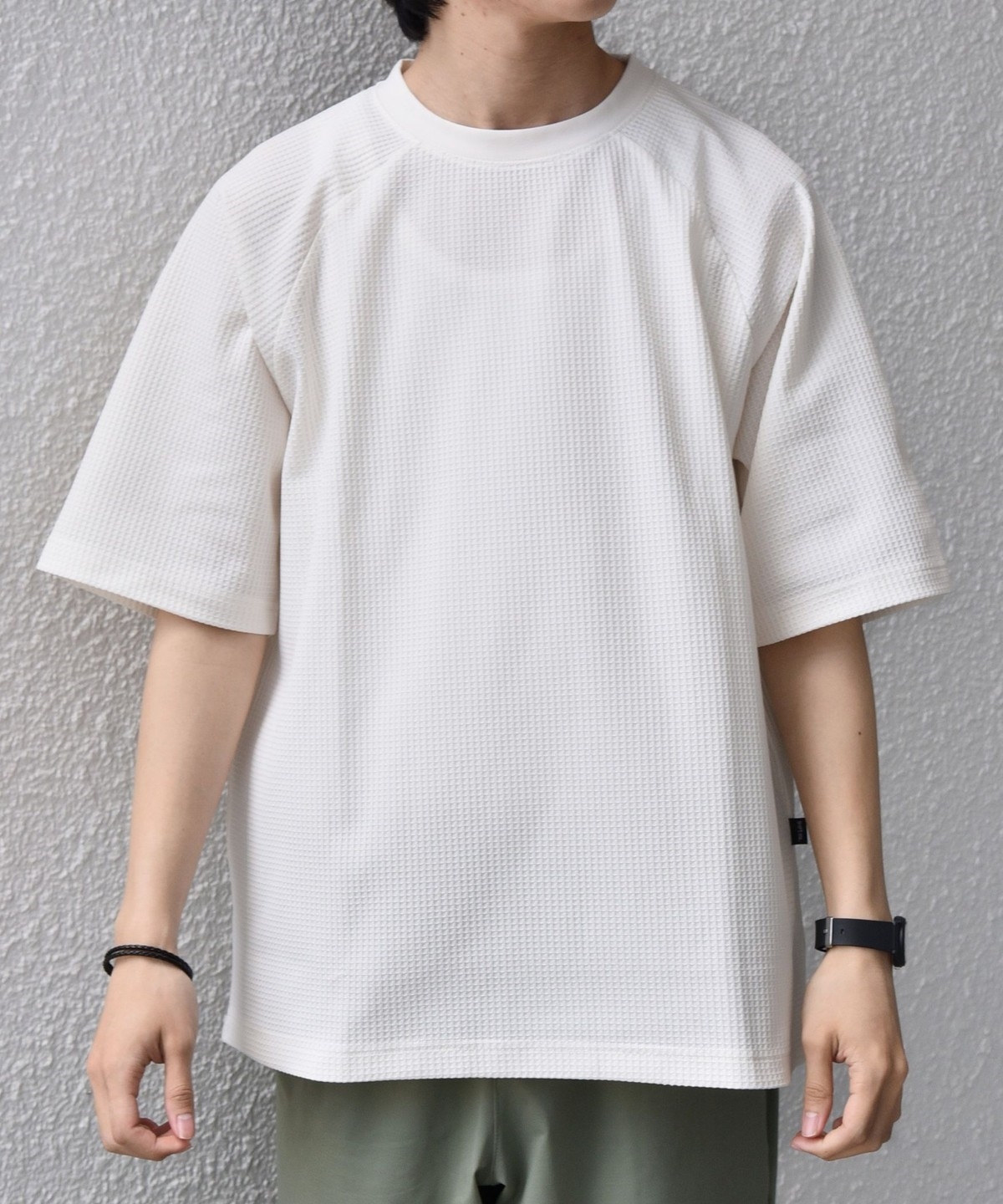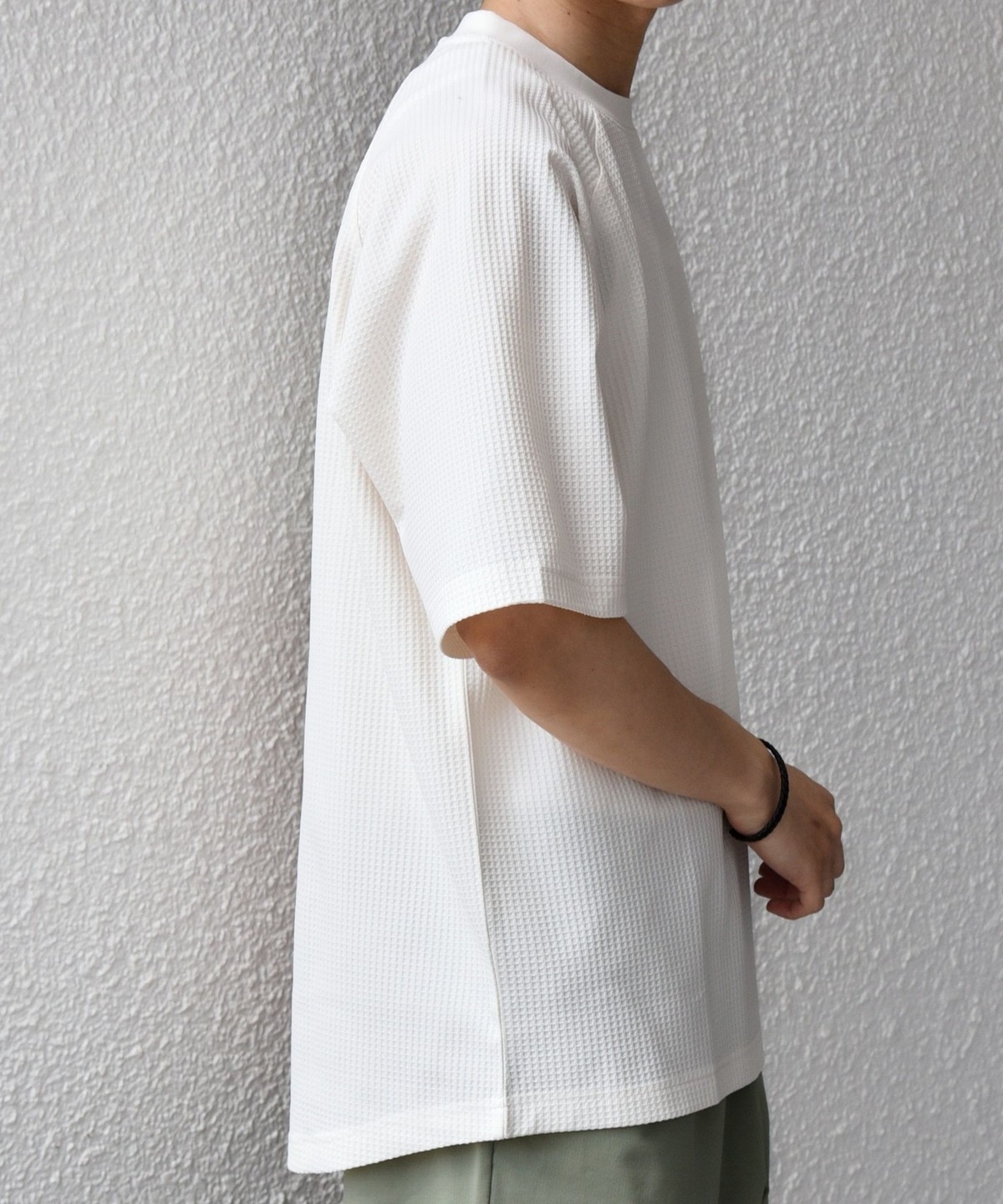 さらっとした着心地のワッフル素材を使用した、シンプルなTシャツ