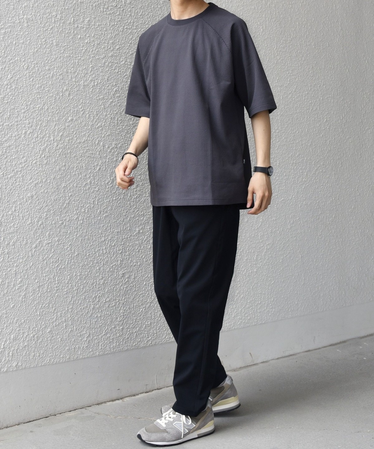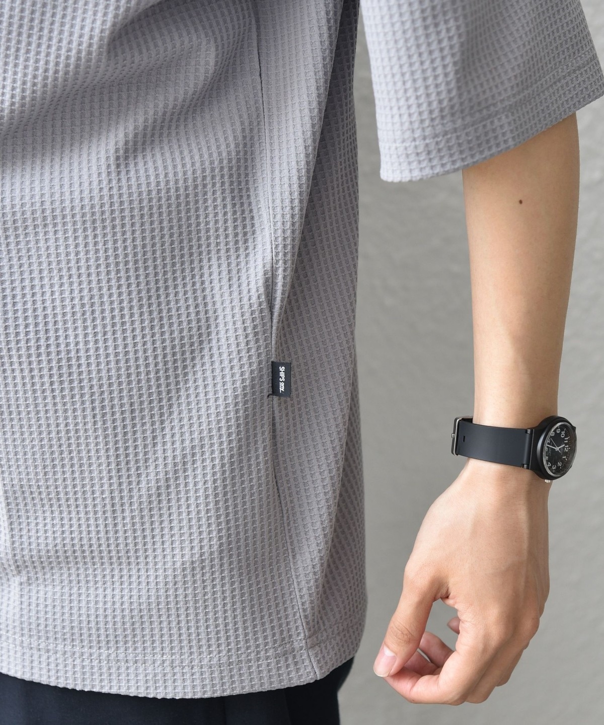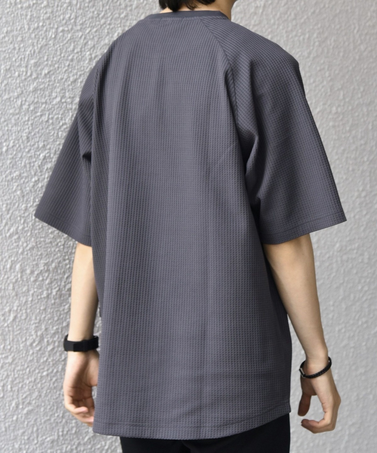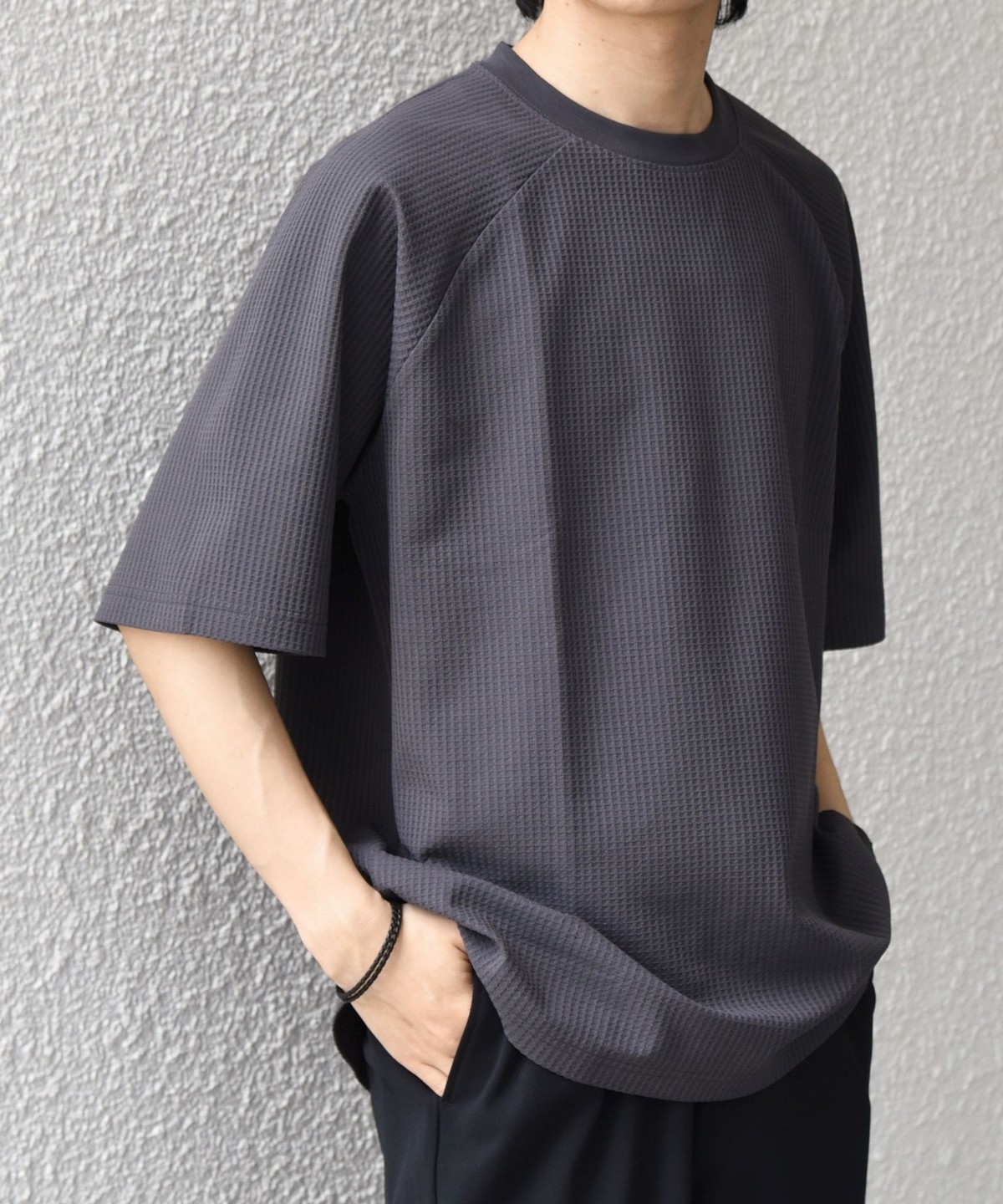 さらっとした着心地のワッフル素材を使用した、シンプルなTシャツ
