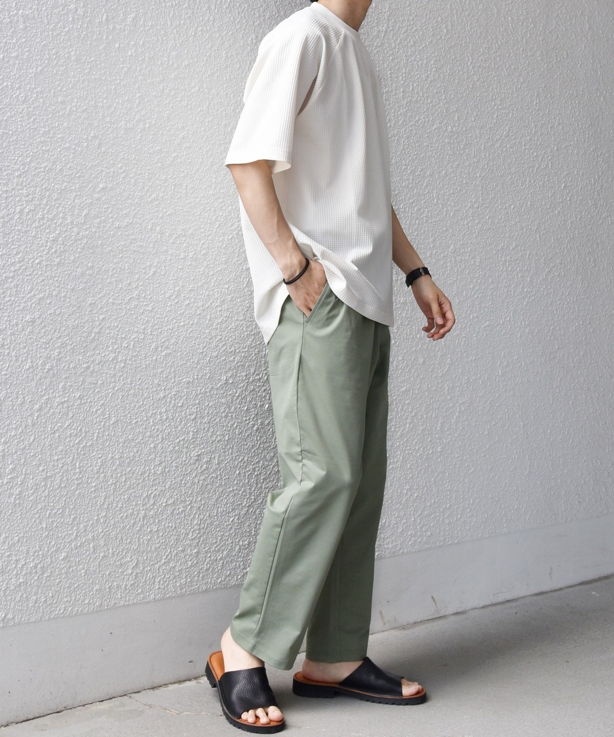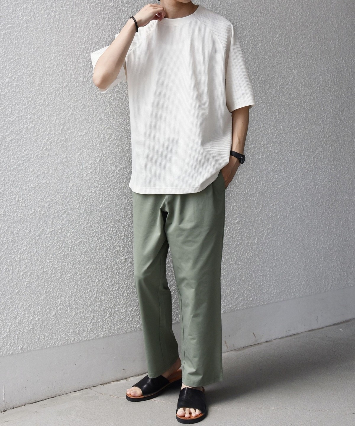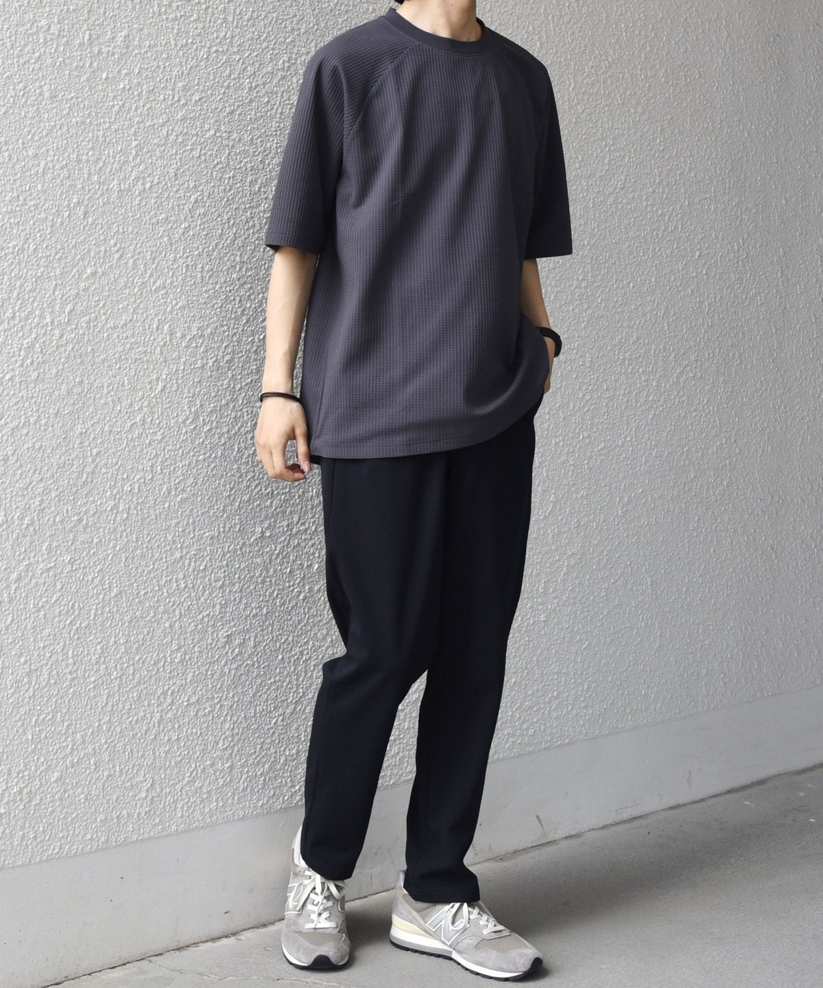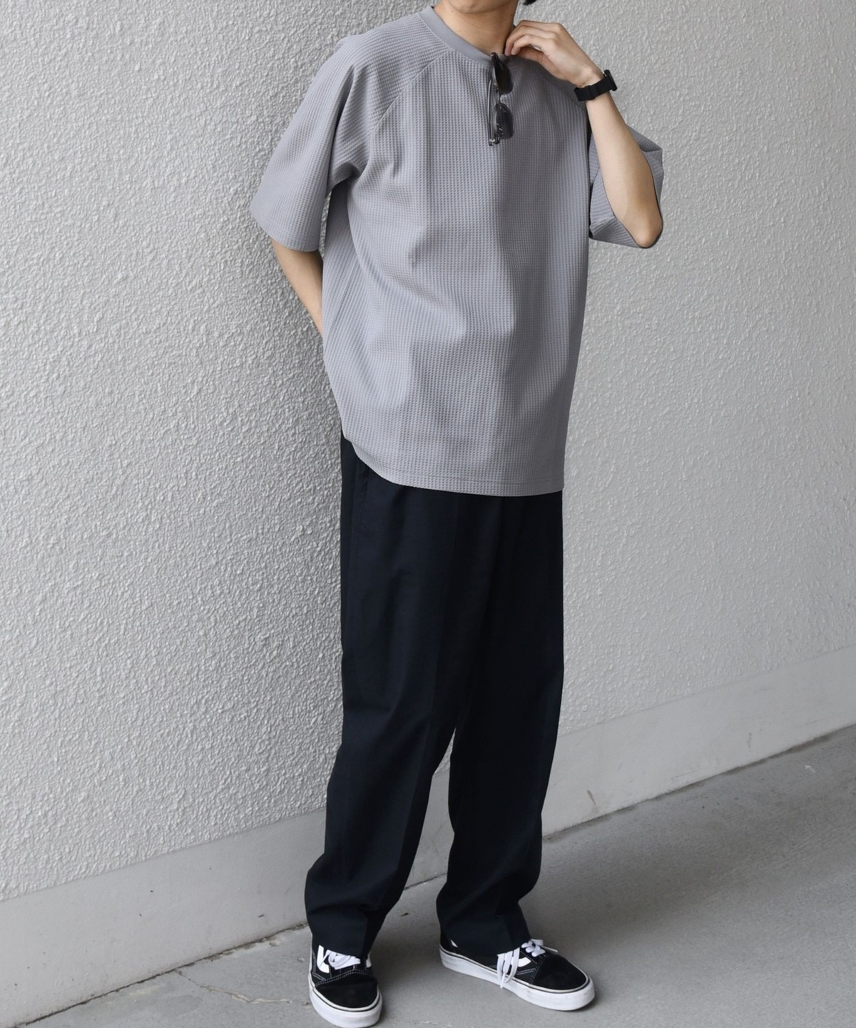 さらっとした着心地のワッフル素材を使用した、シンプルなTシャツ
