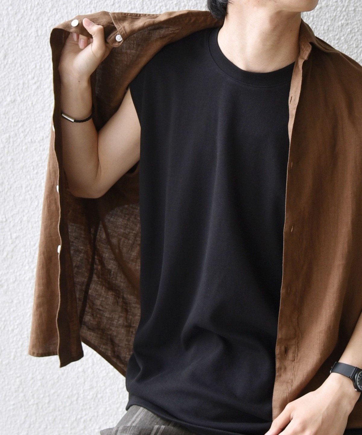 ジャケットやシャツなどのインナーとしても合わせやすく、Tシャツとのレイヤードとしても活躍します。