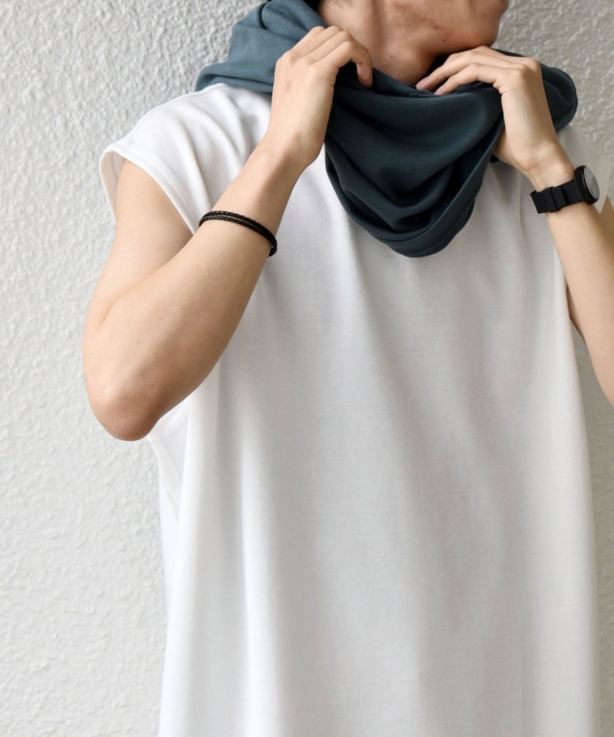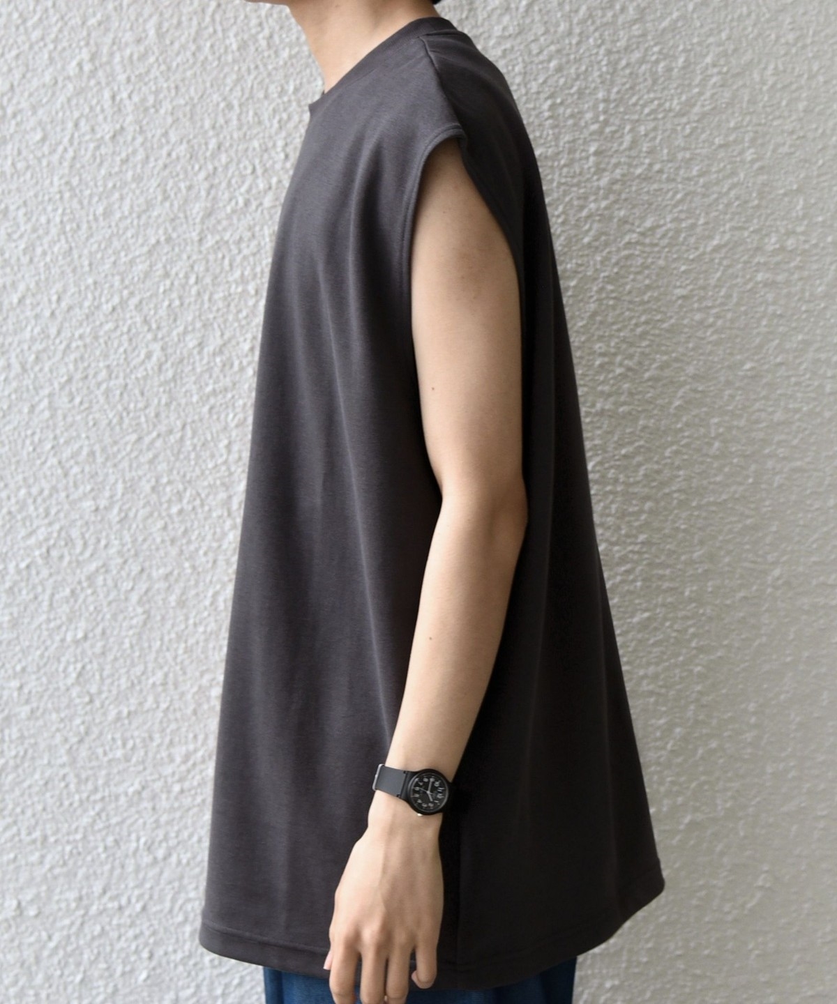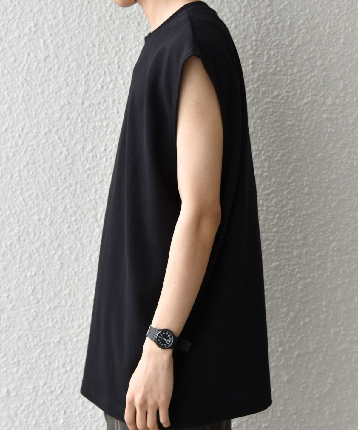 程よくゆとりを持たせたリラックスフィットのノースリーブデザイン。