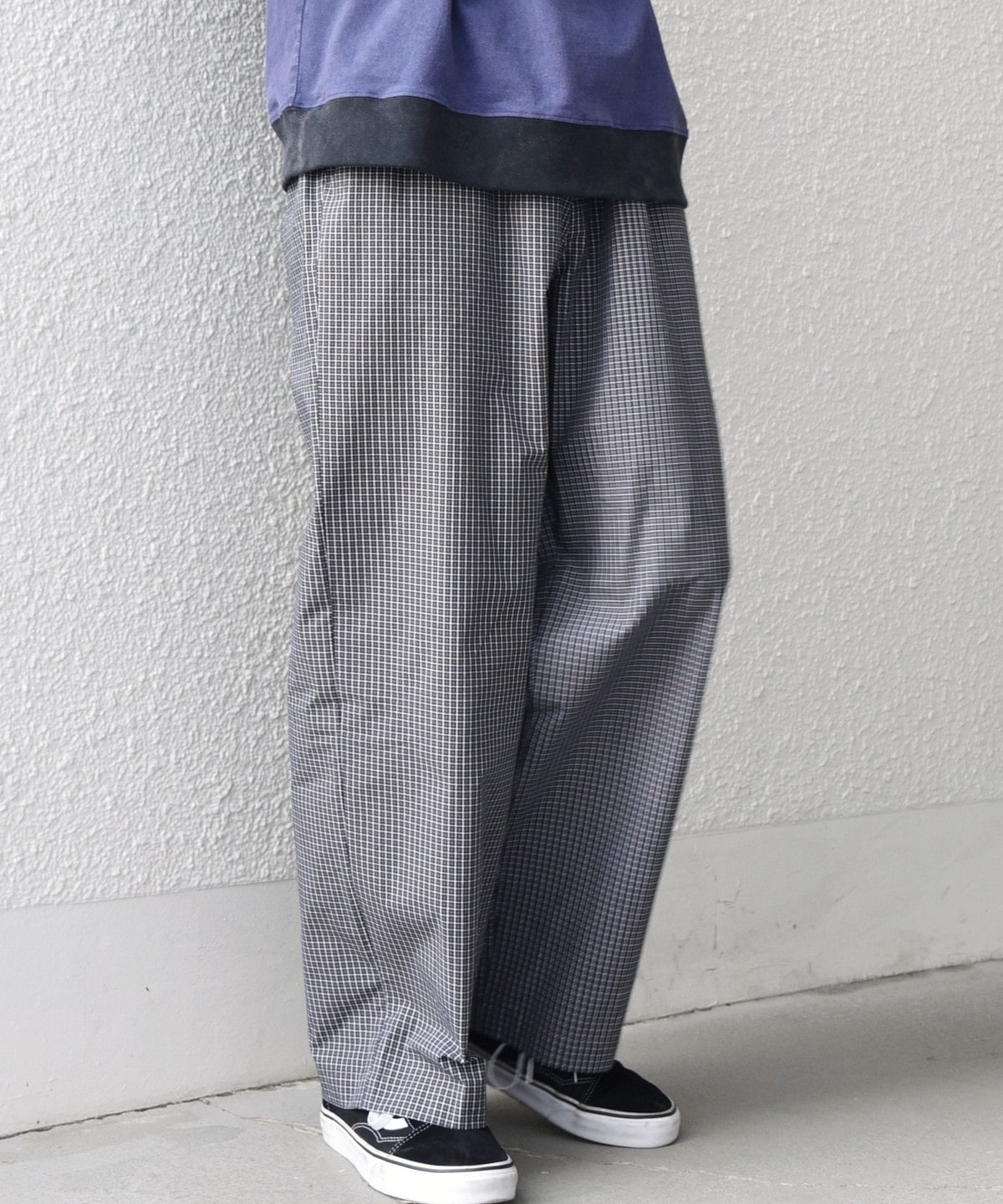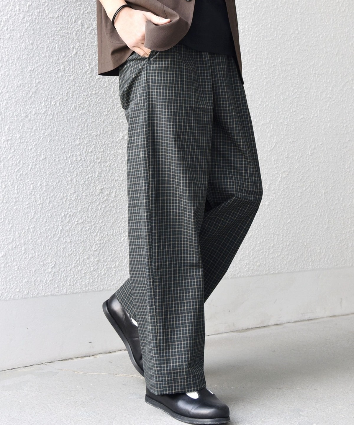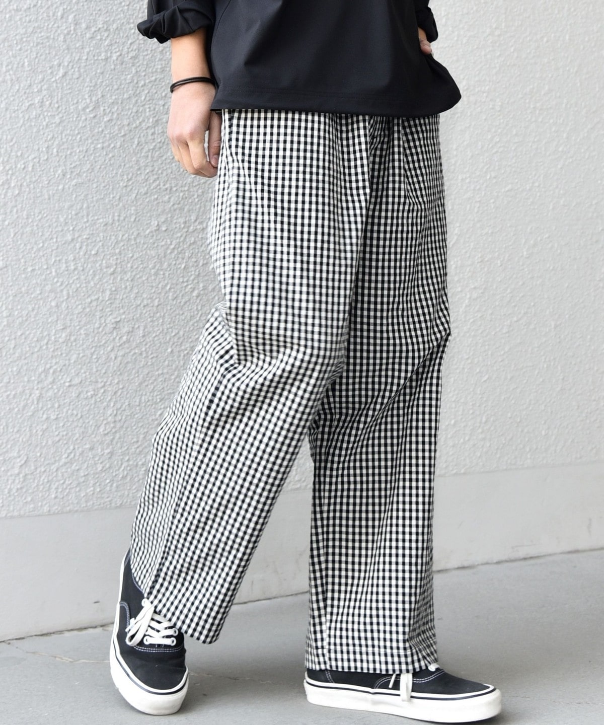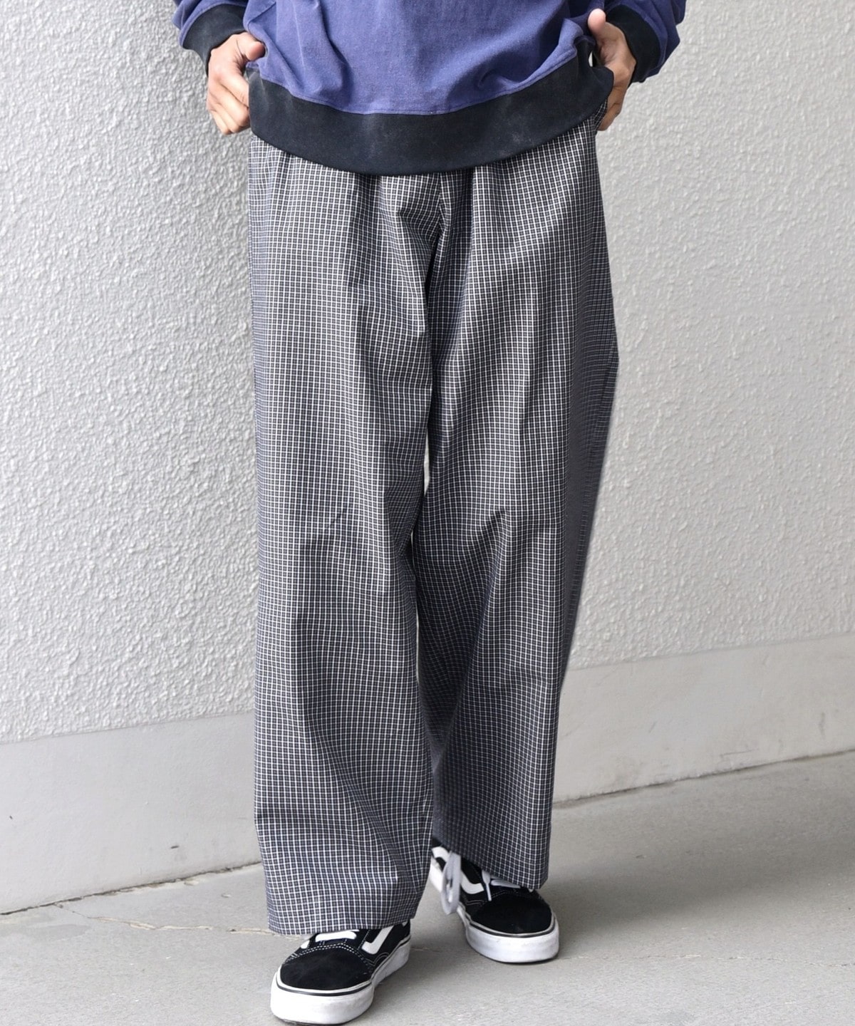 細かいチェック柄がポイント!ハリ感のある生地を使用したイージーパンツ