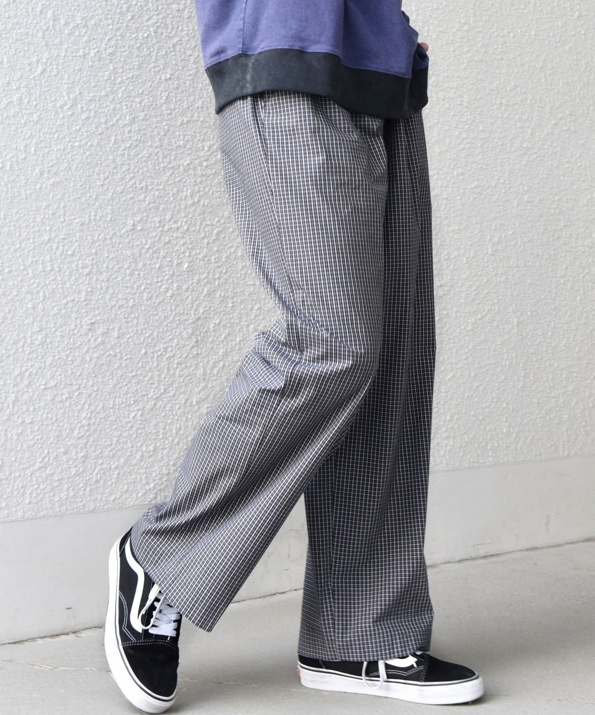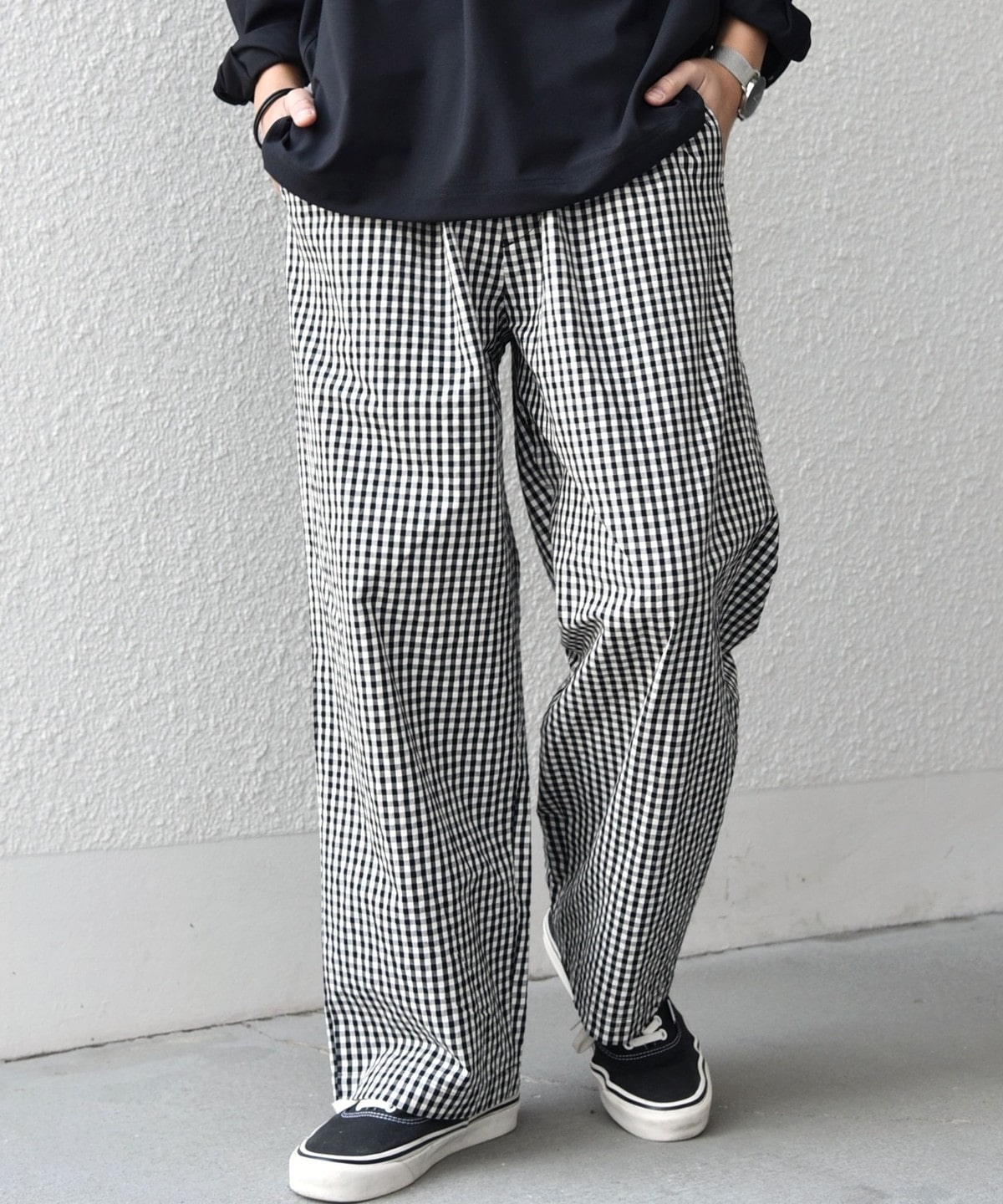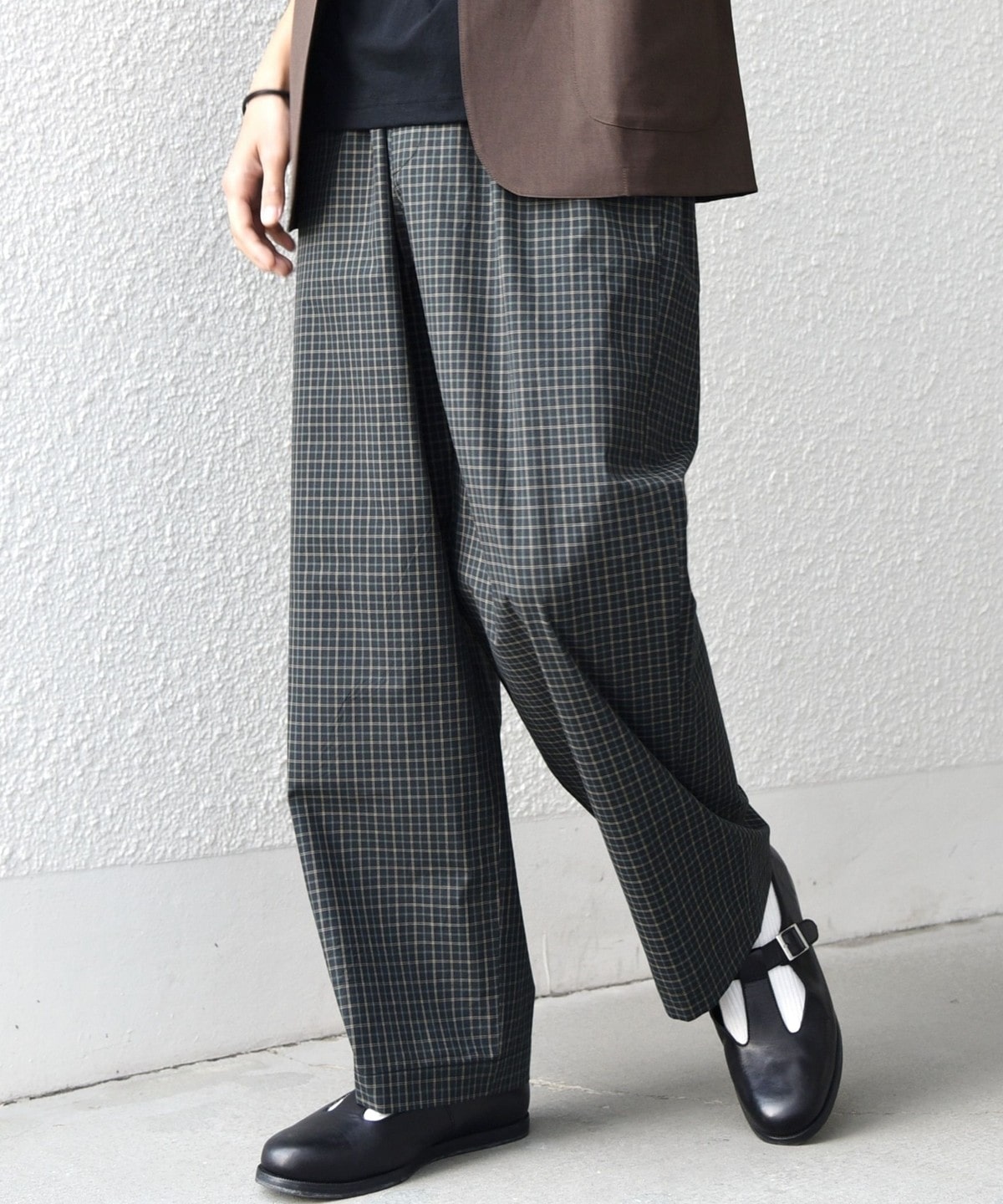 細かいチェック柄がポイント!ハリ感のある生地を使用したイージーパンツ