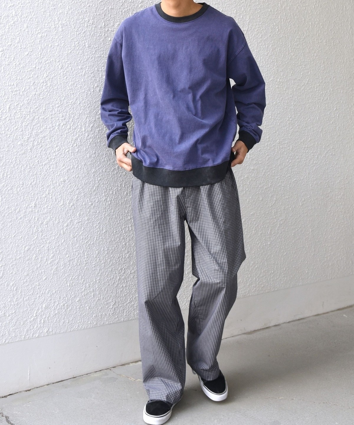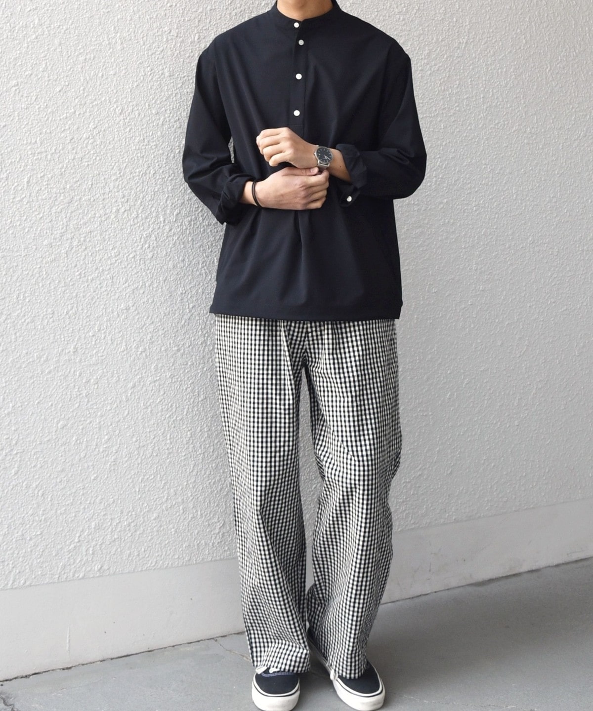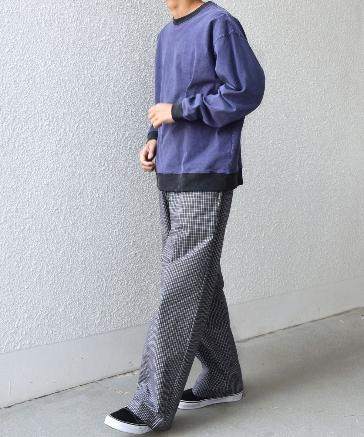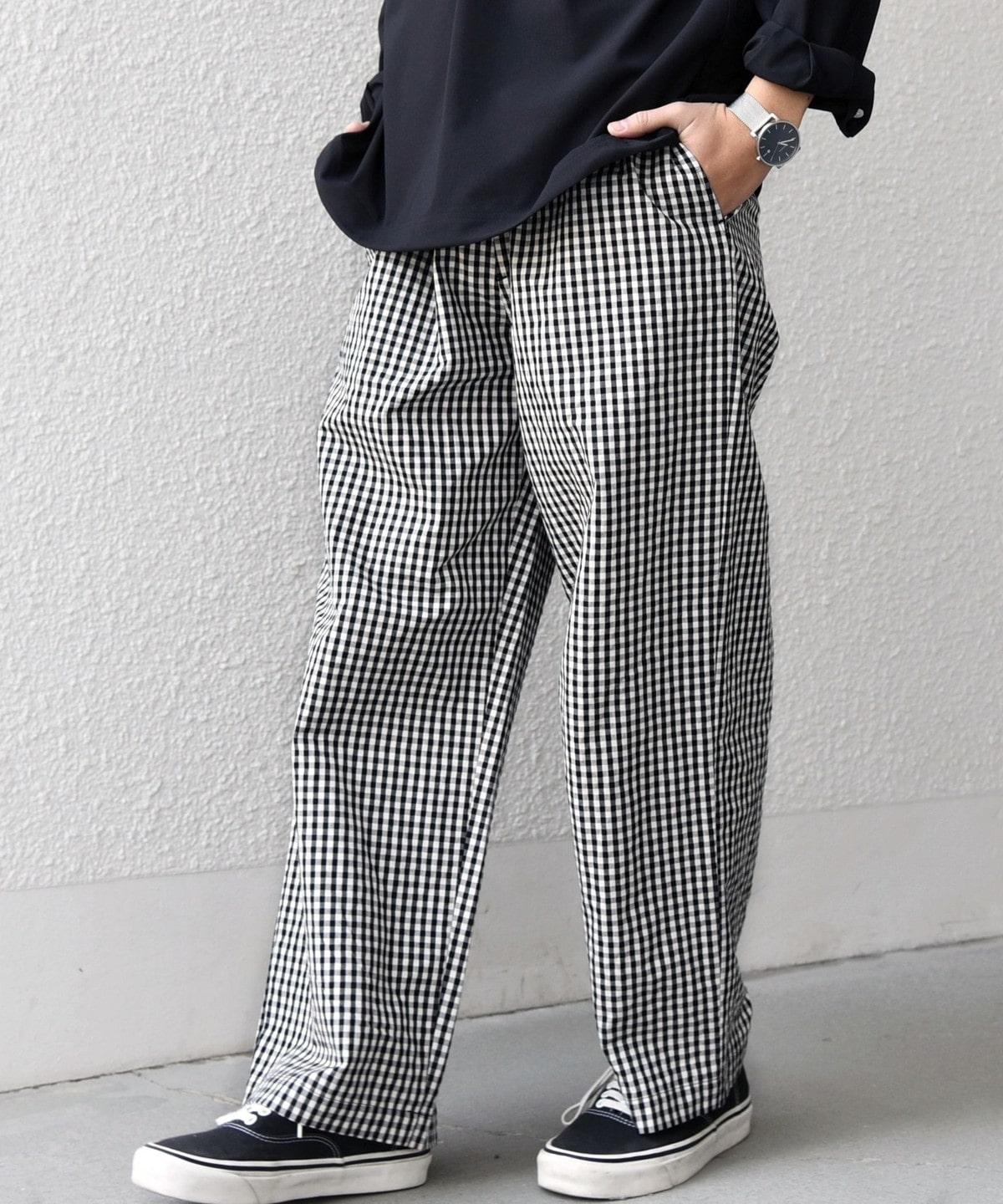 細かいチェック柄がポイント!ハリ感のある生地を使用したイージーパンツ