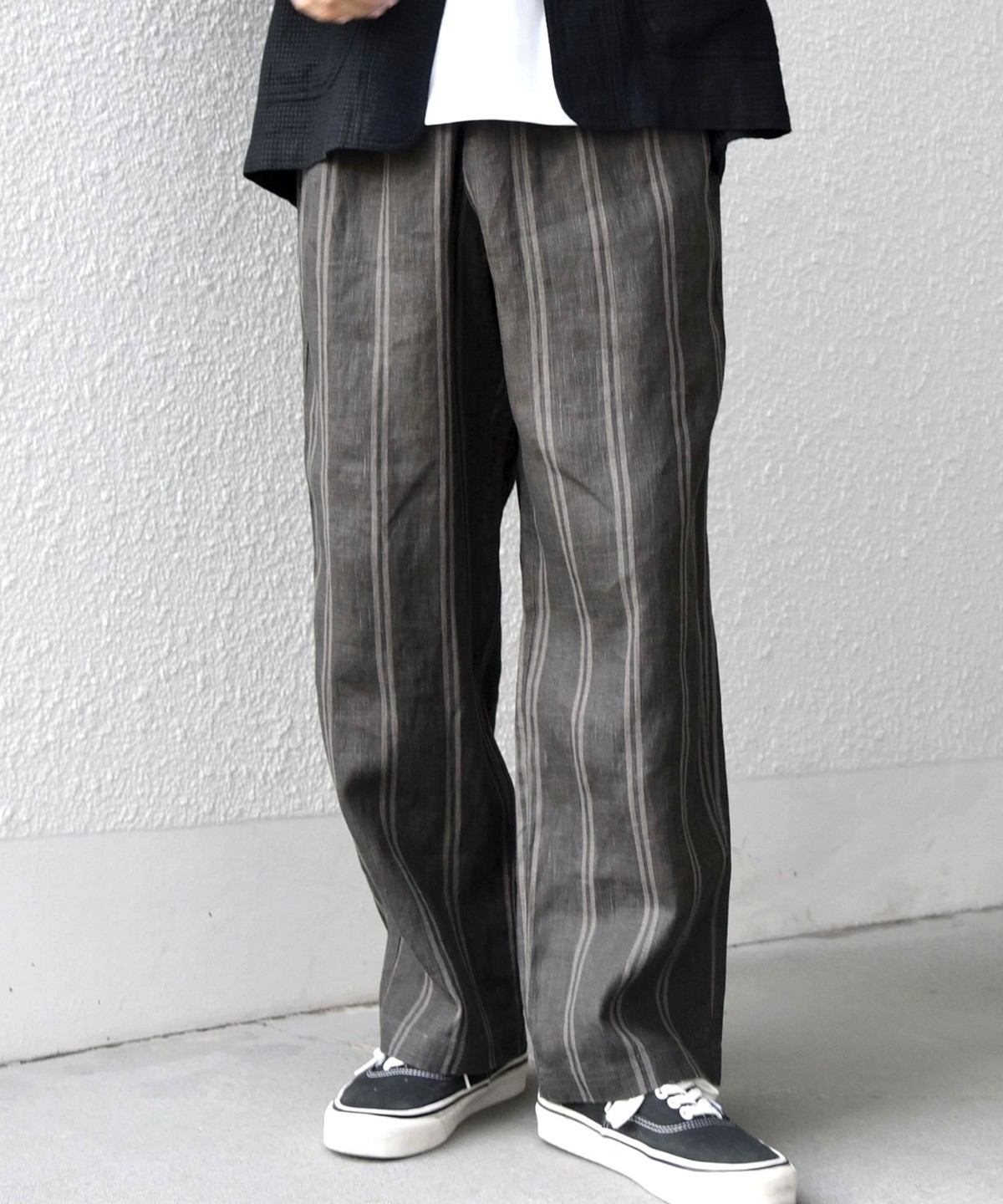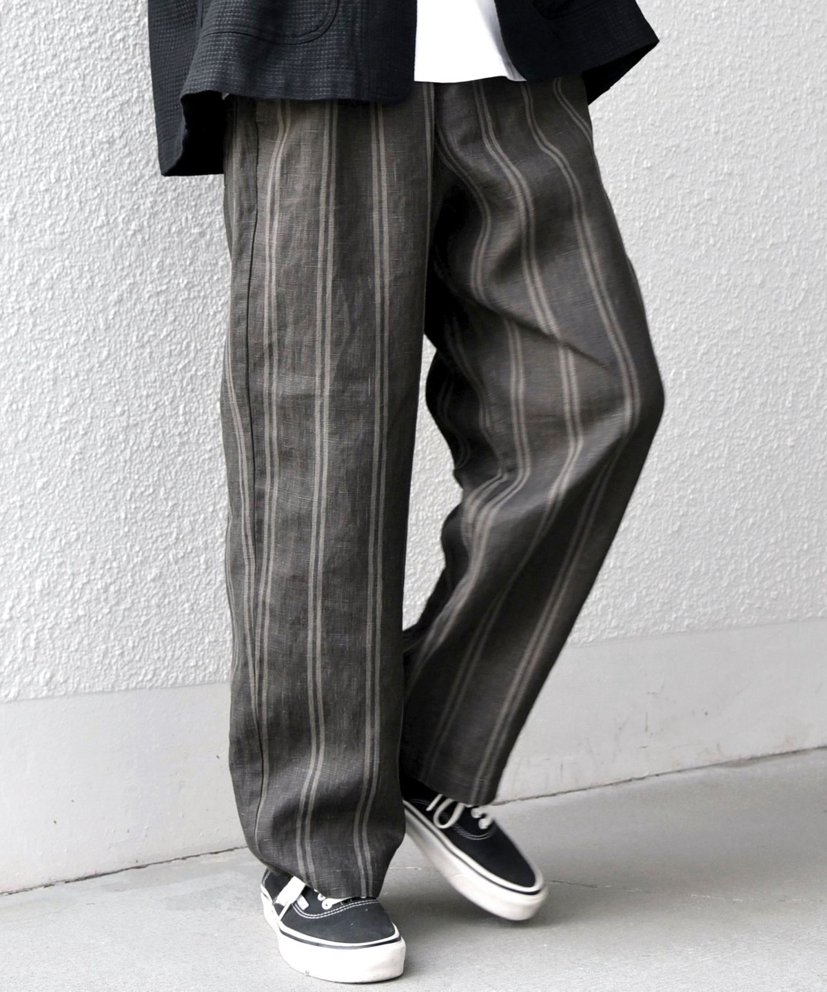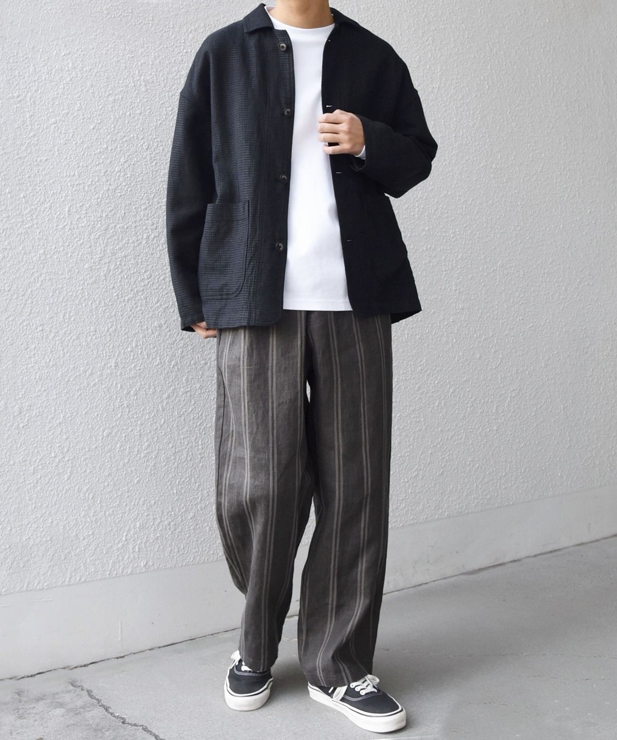 ストライプの縦ラインがすっきりとした印象を与え、リラックスシルエットながらも大人っぽい雰囲気に。