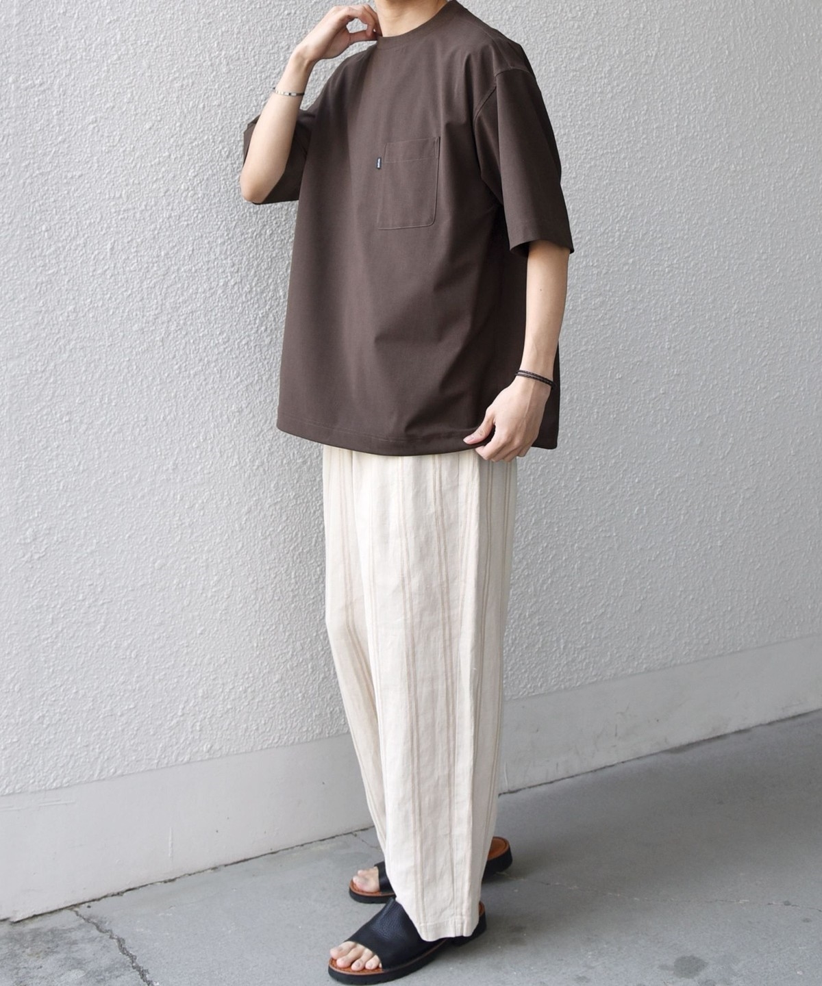 程よいゆとりを持たせつつ、カジュアルになりすぎない大人でも着用しやすいサイズ感が特徴です。