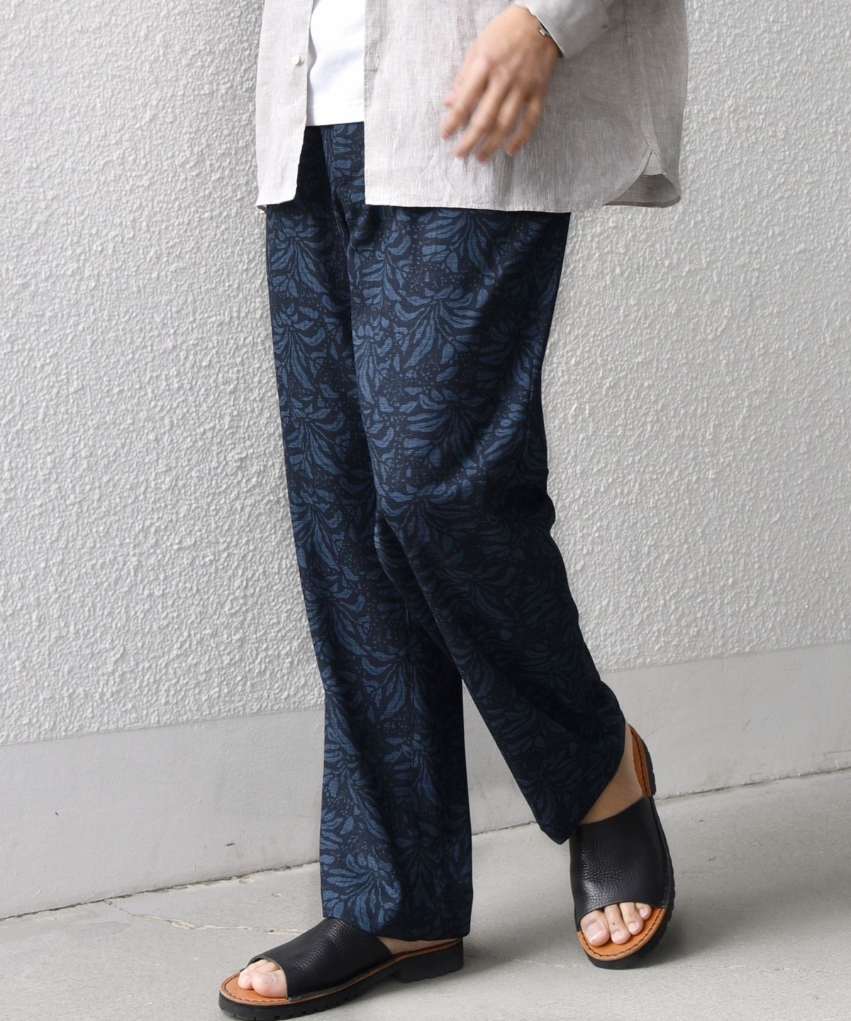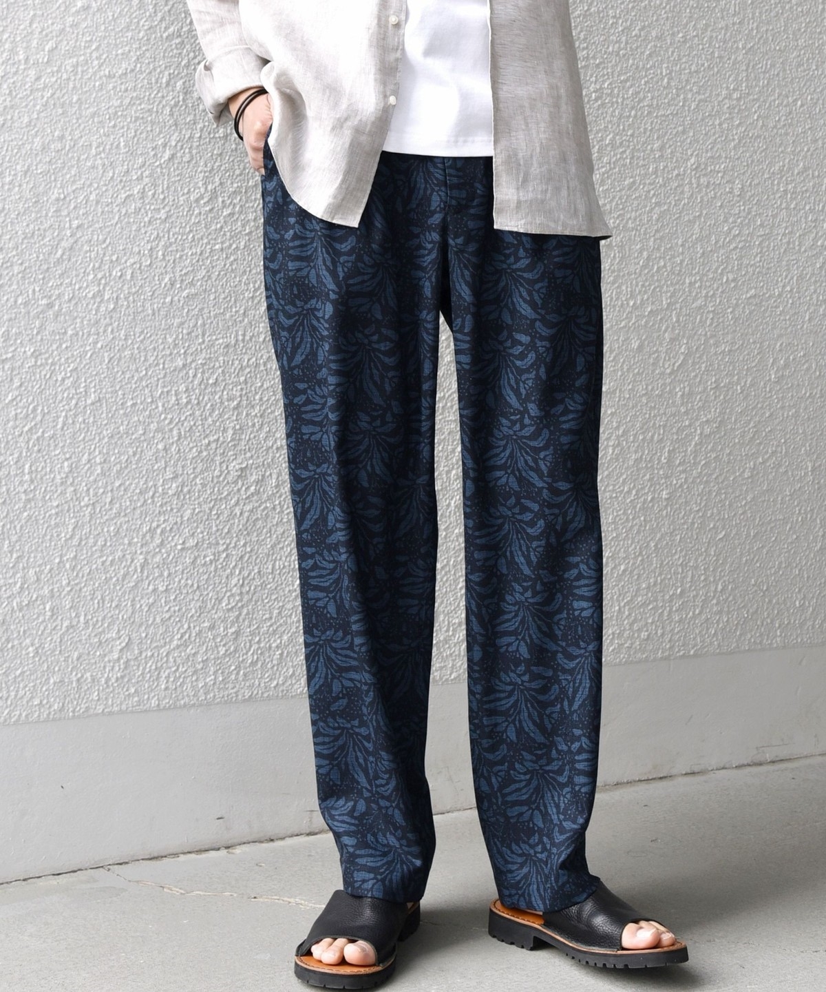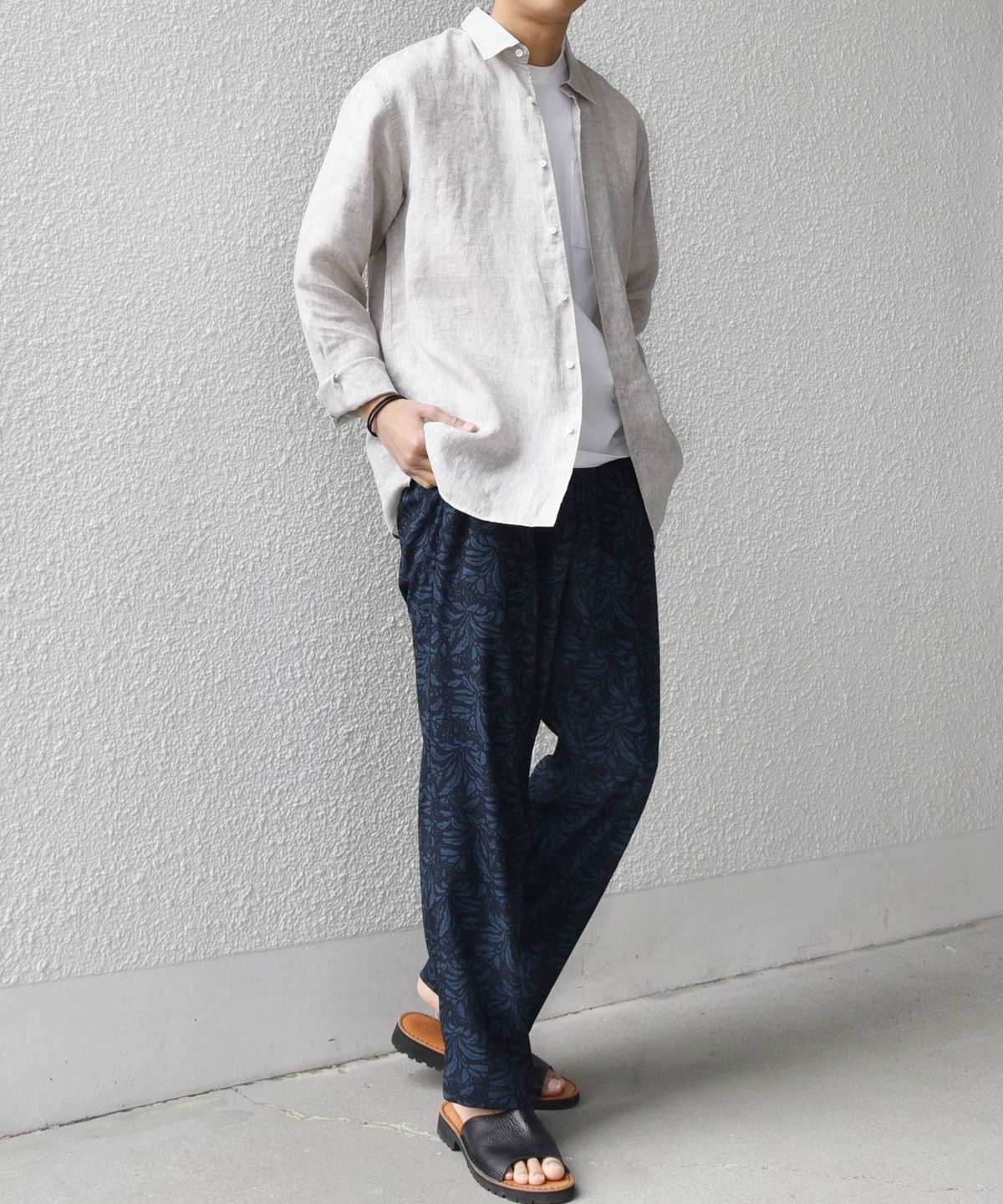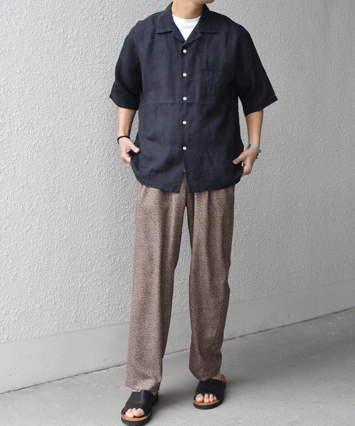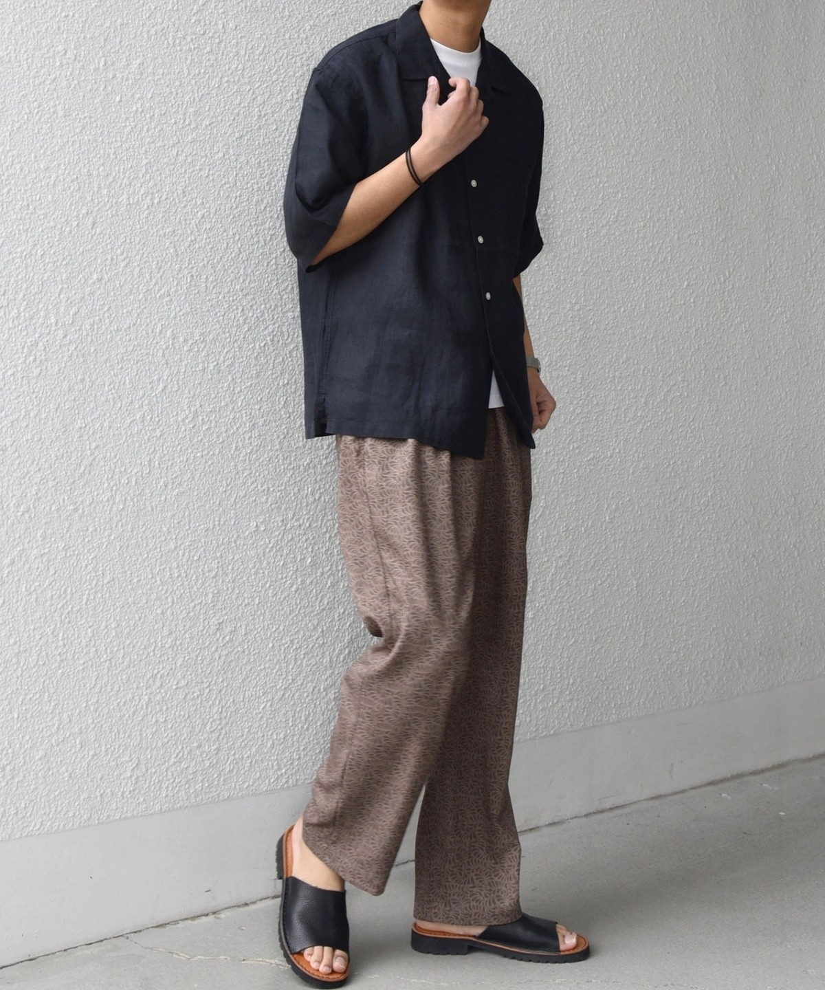 夏らしい素材感は、オープンカラーシャツやカットソーなどの抜け感のあるアイテムとの相性◎