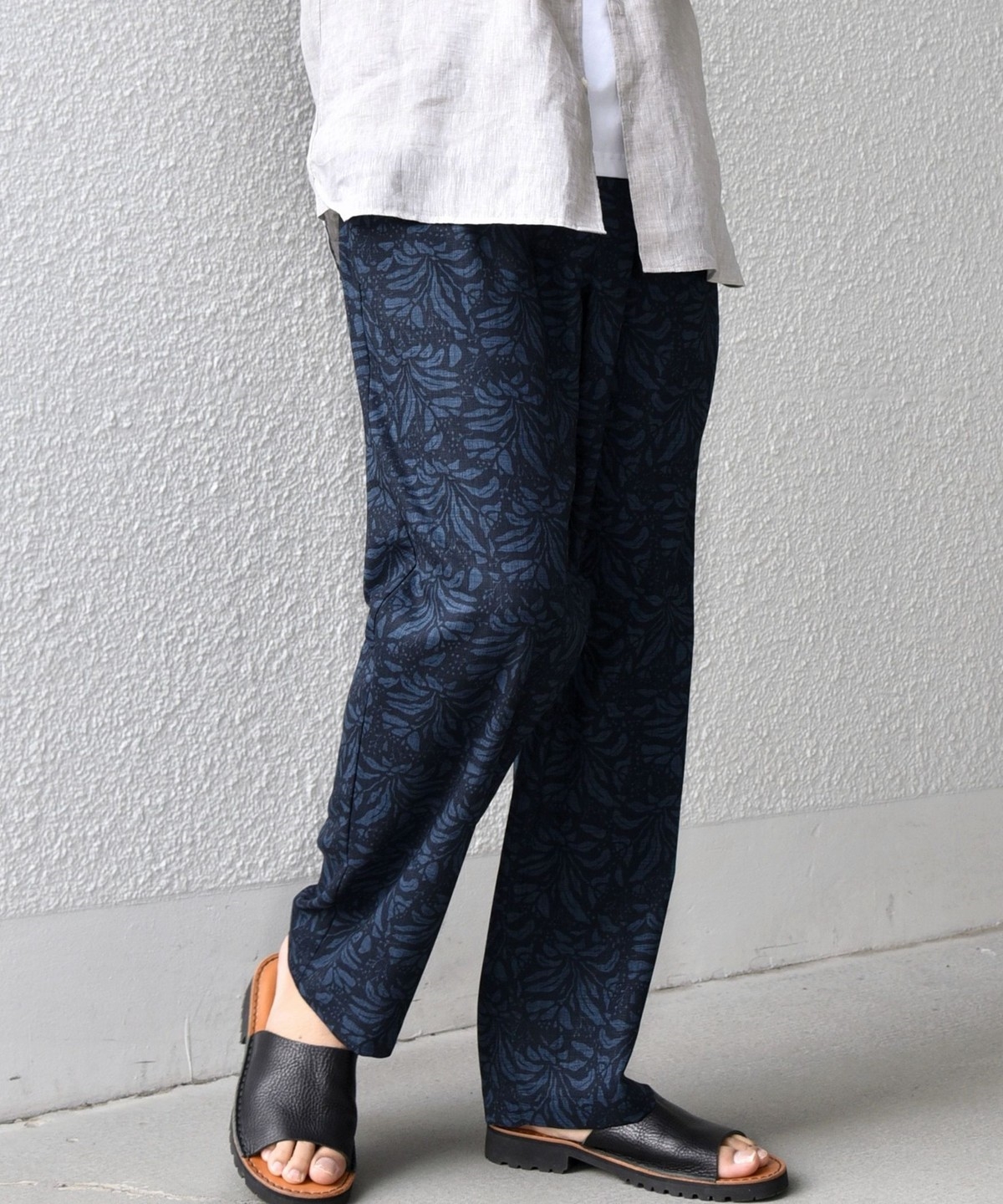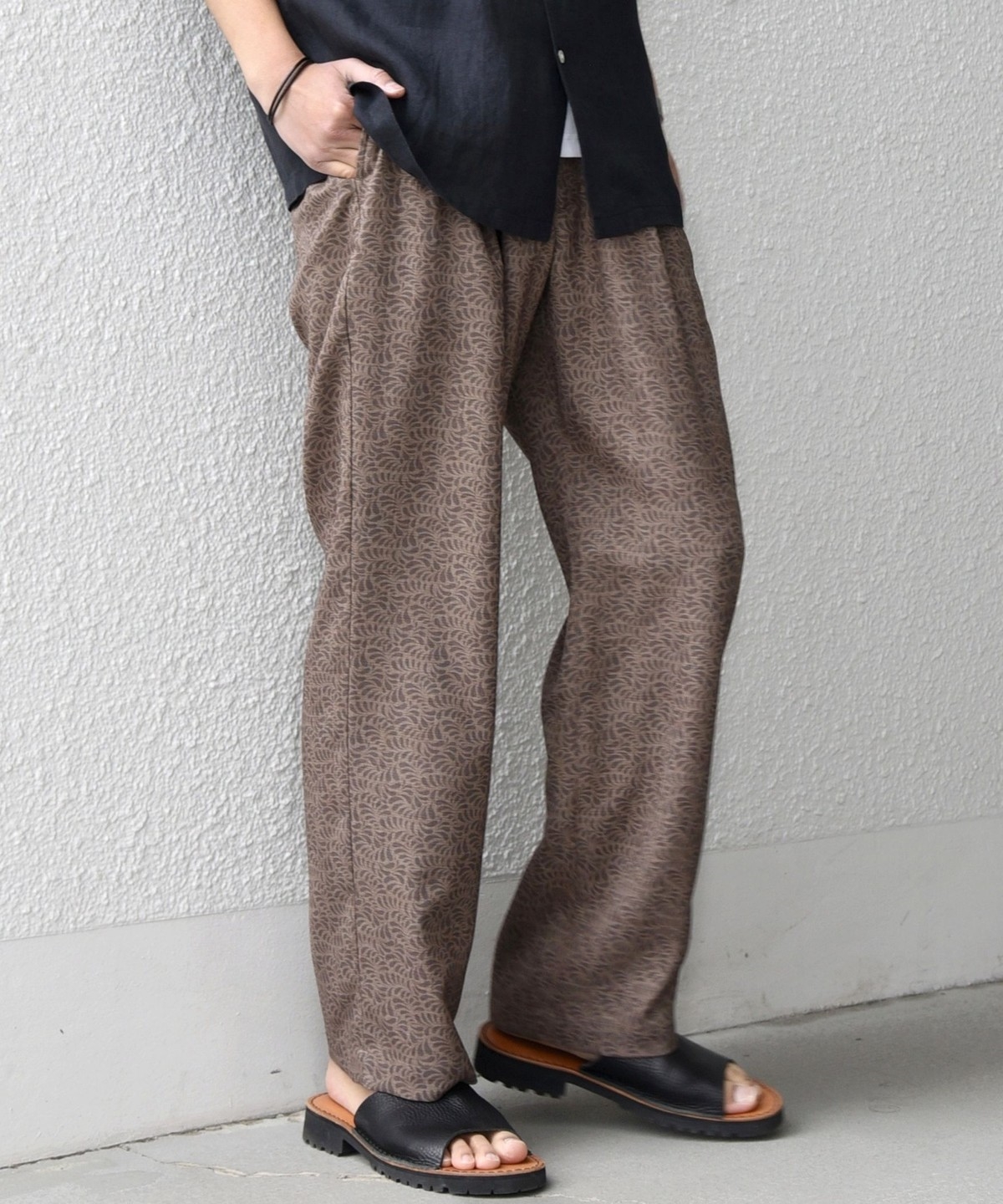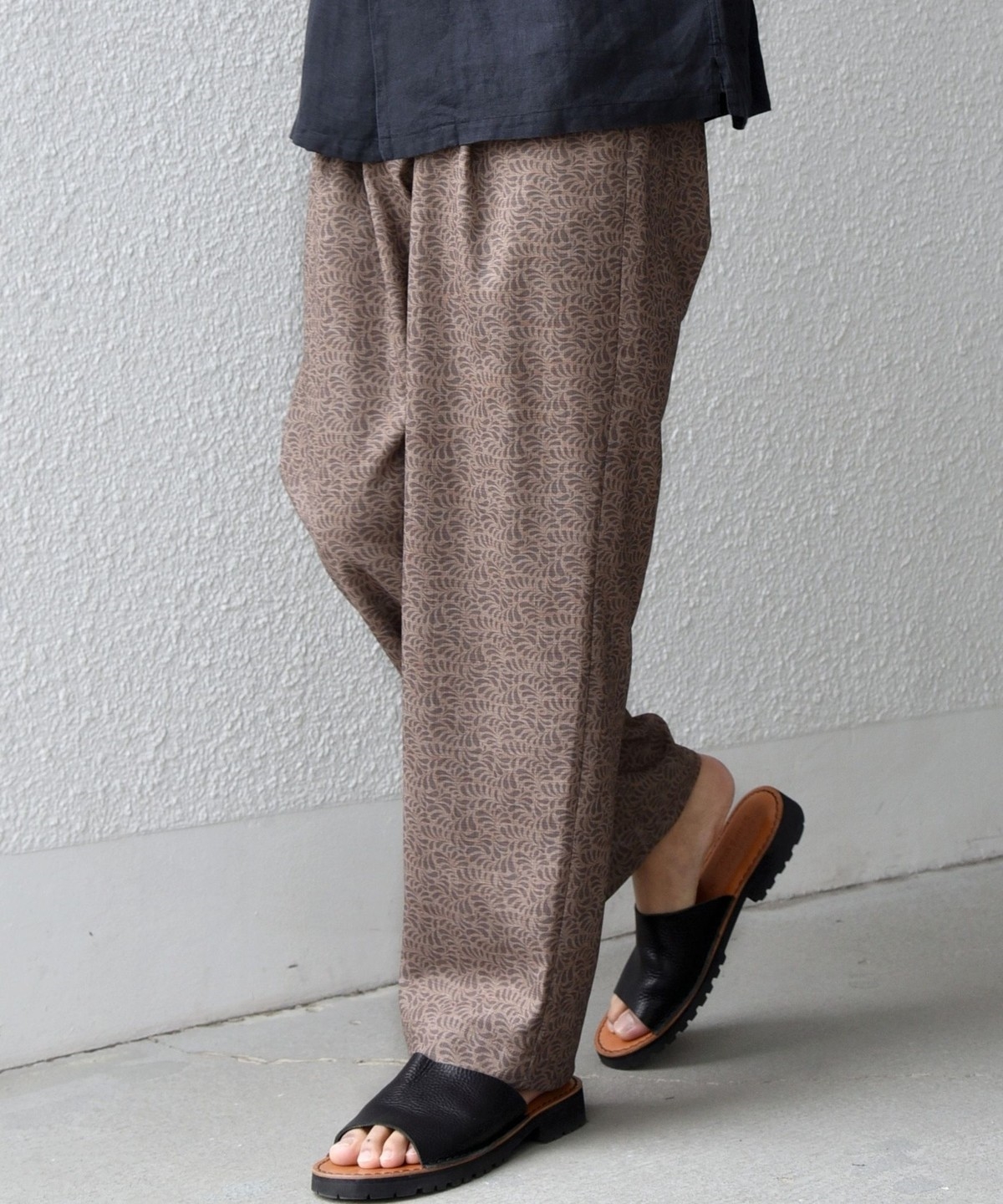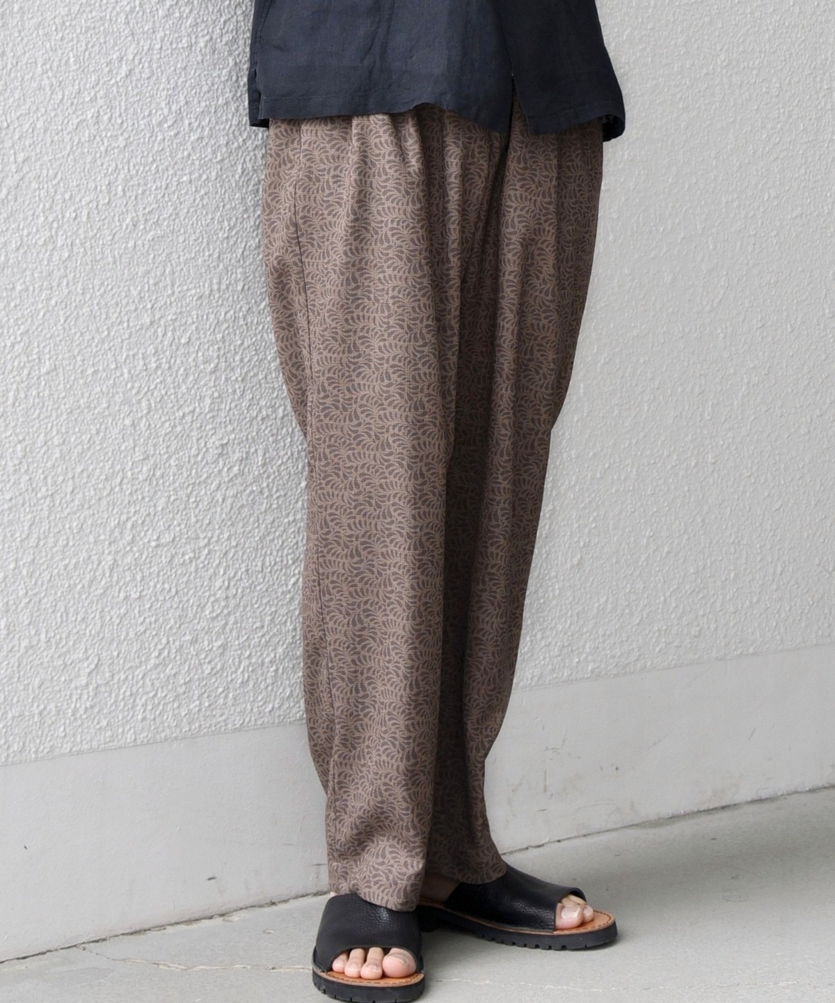 ウエストは後ろ側のみゴム入りシャーリング仕様にしたリラックスパンツです。