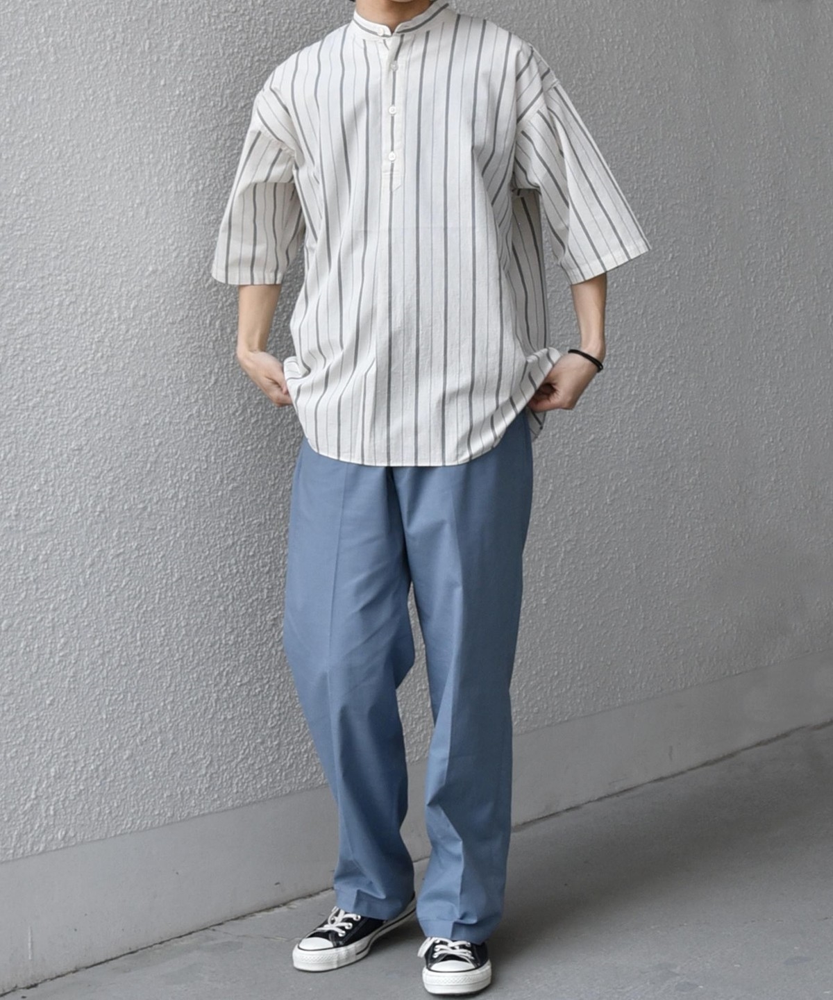 同素材アイテムとのセットアップはもちろん、半袖モックTシャツやニットTシャツなどと合わせた清潔感のあるキレイめカジュアルスタイルもおすすめ!