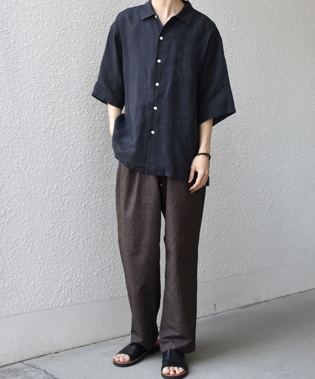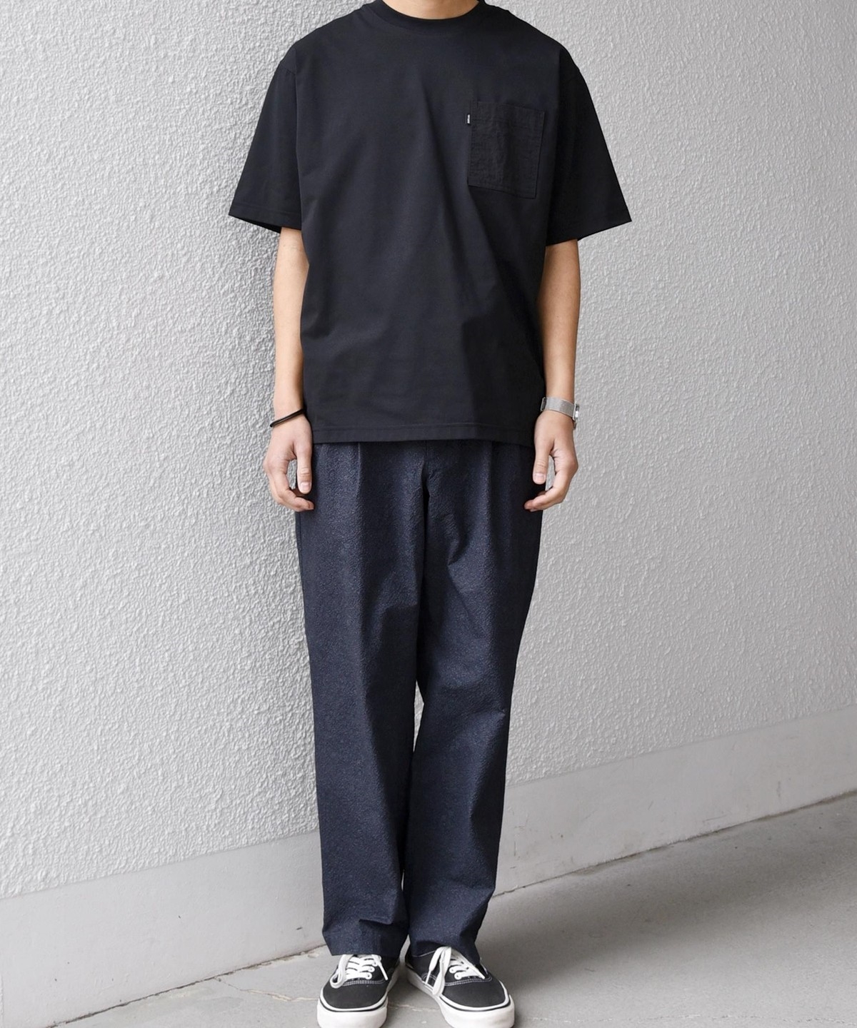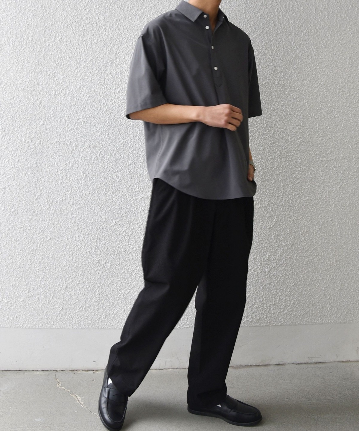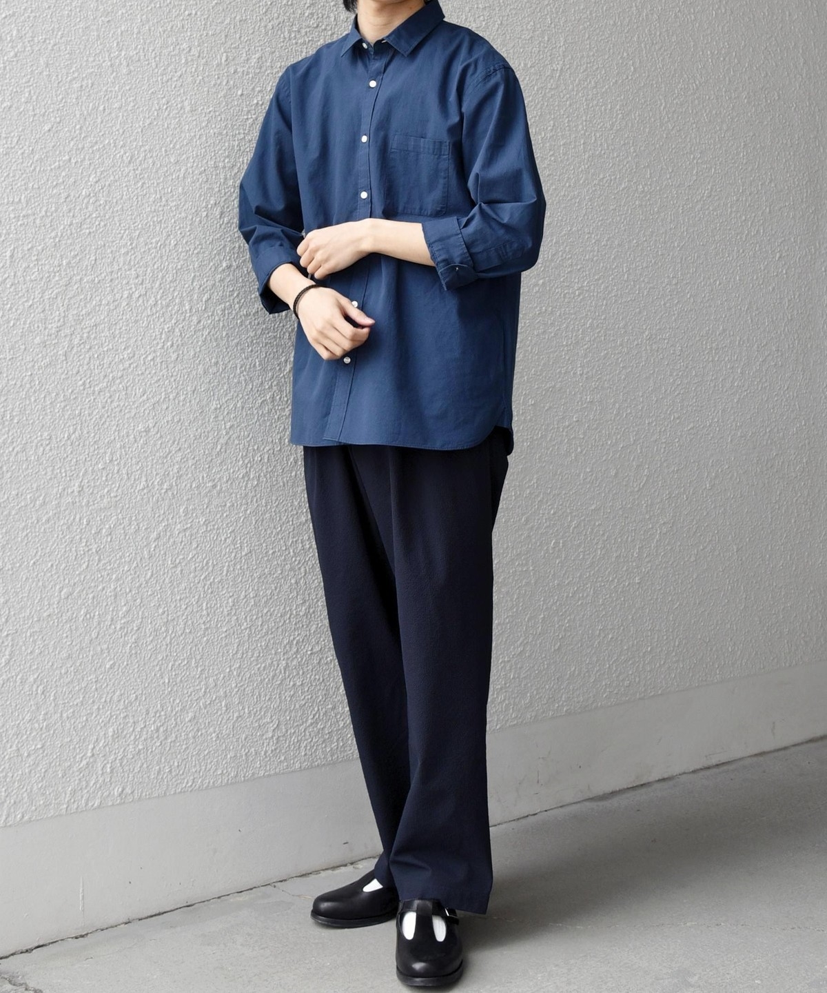 セミワイドテーパードシルエットは様々なトップスに合わせやすいため、カットソーだけでなくシャツと合わせるのも◎
