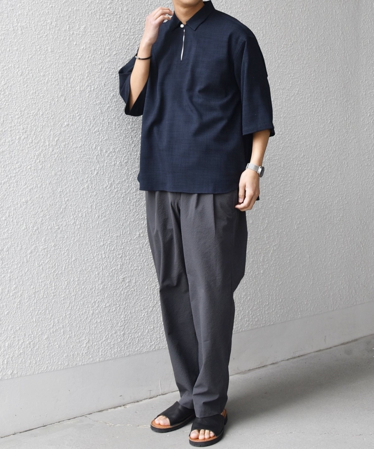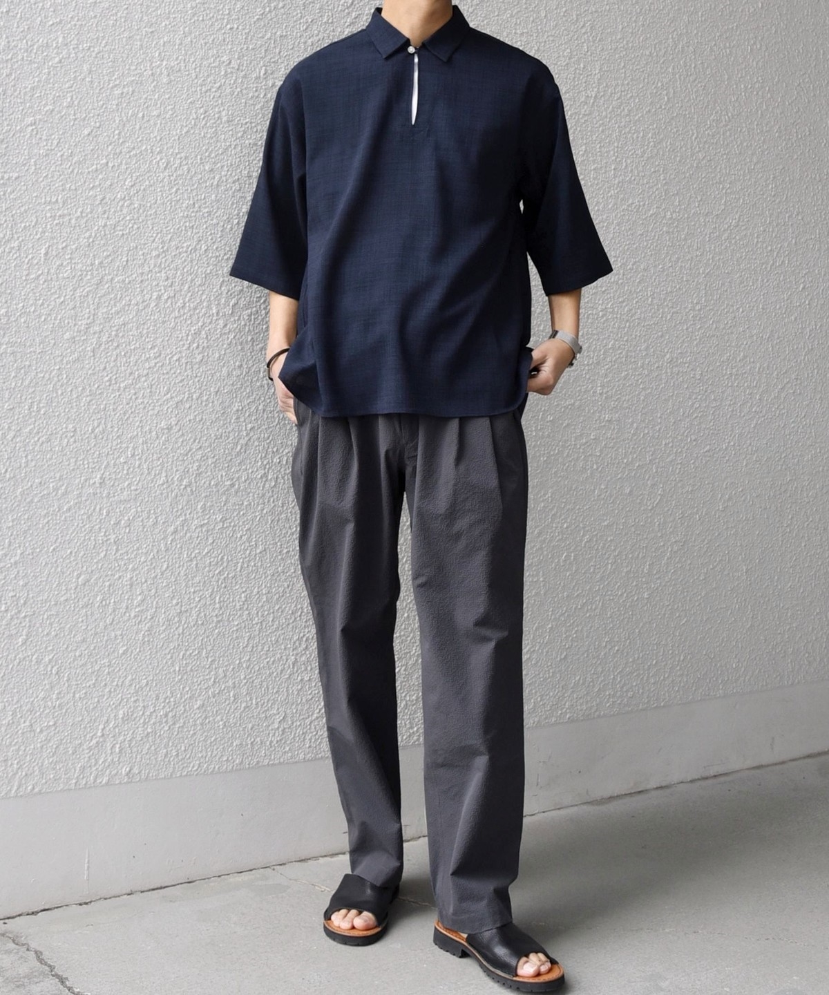 シアサッカー素材ですので軽量で肌離れが良く、少し暑い時期にも重宝します。