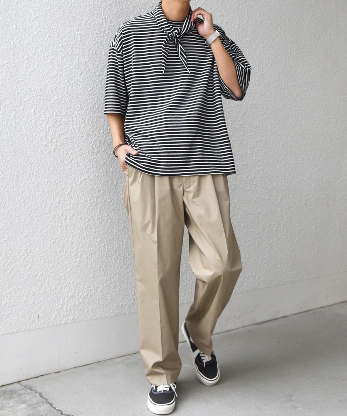 カットソーはもちろん、シャツなどのきれいめなトップスとも相性が良く、幅広いスタイリングに対応します。