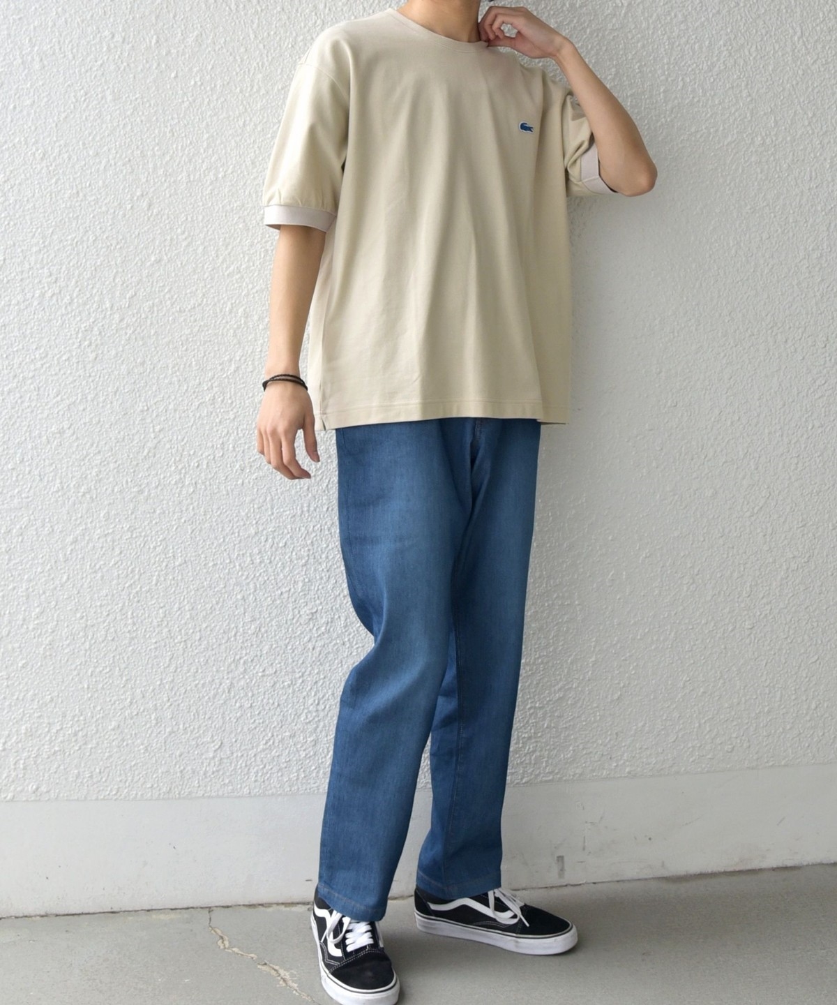 シンプルなTシャツやスニーカーと合わせることで、大人のカジュアルコーデが完成します。