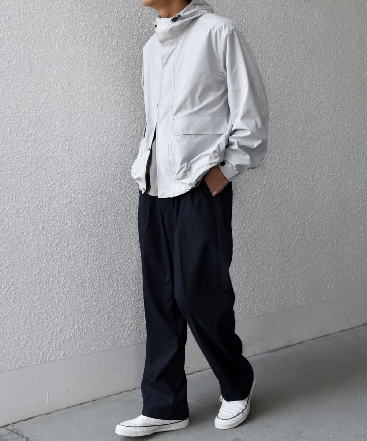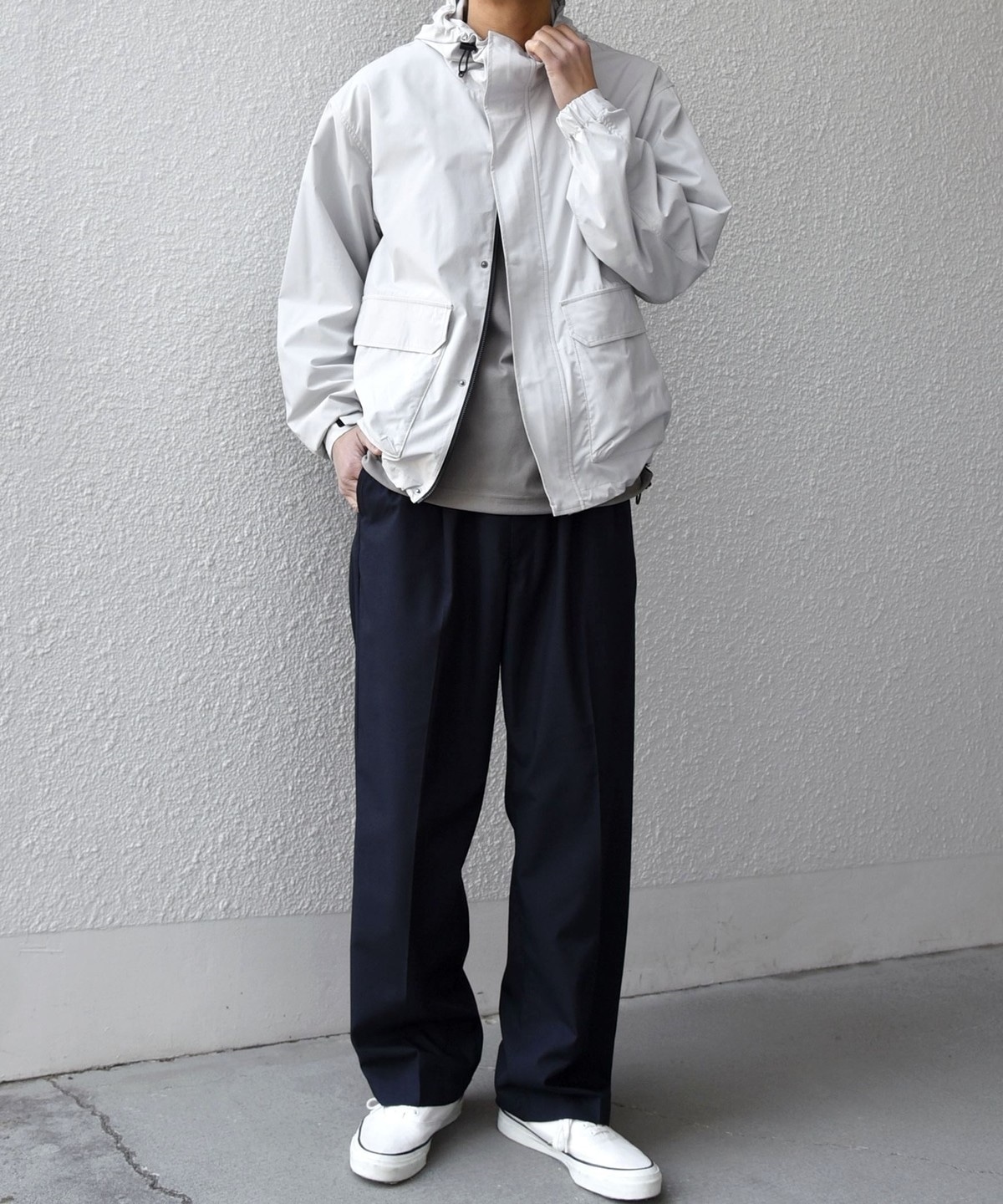 サイズ感を程良いリラックスフィットに設定しておりますので、スウェットやニットも着やすく春先から活躍します。
