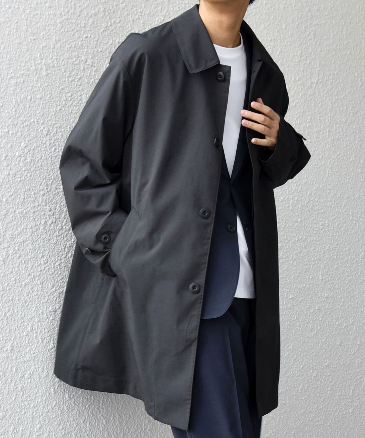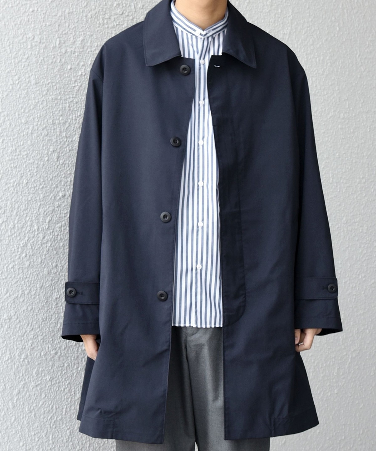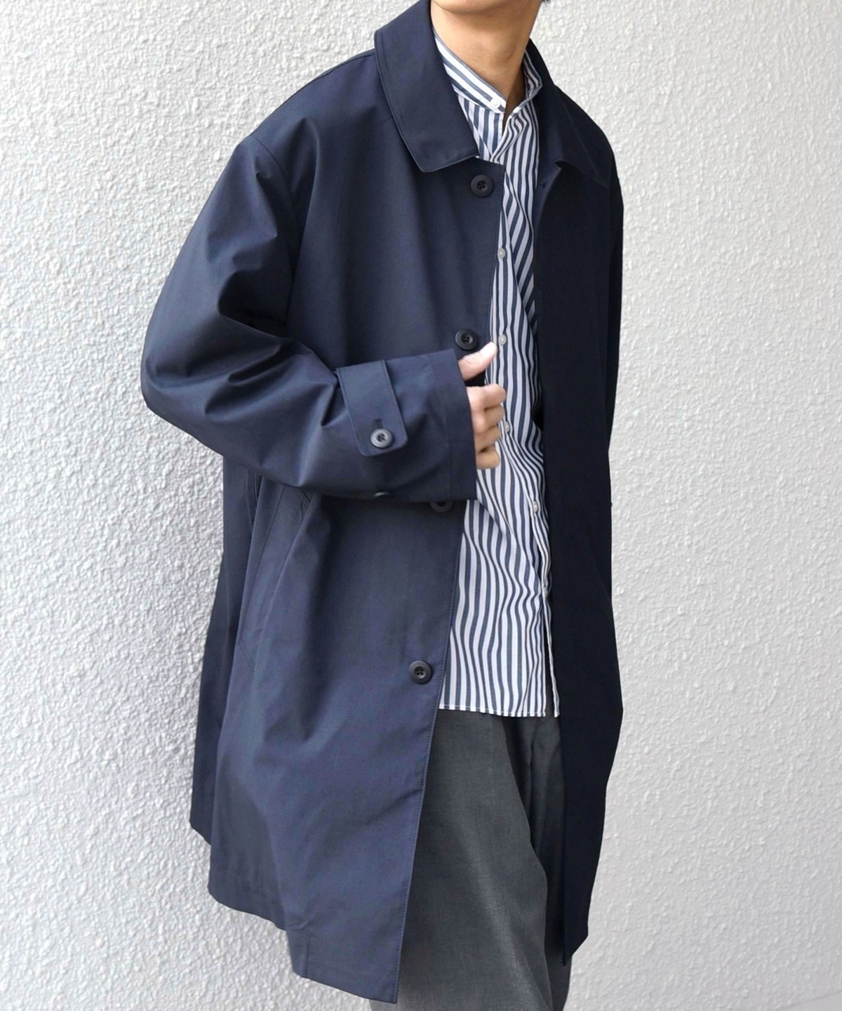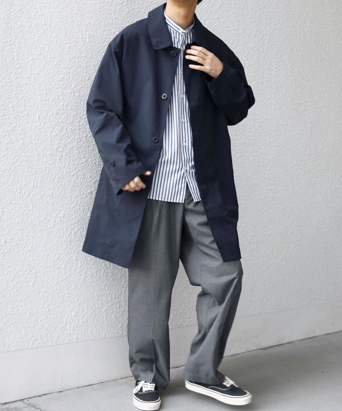ステンカラーコートをベースに、程よくゆとりを持たせたシルエットのアウター。