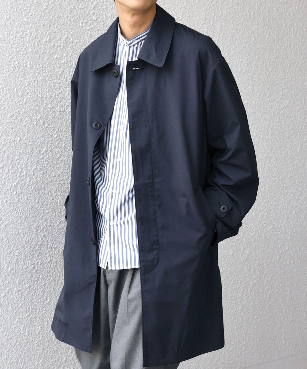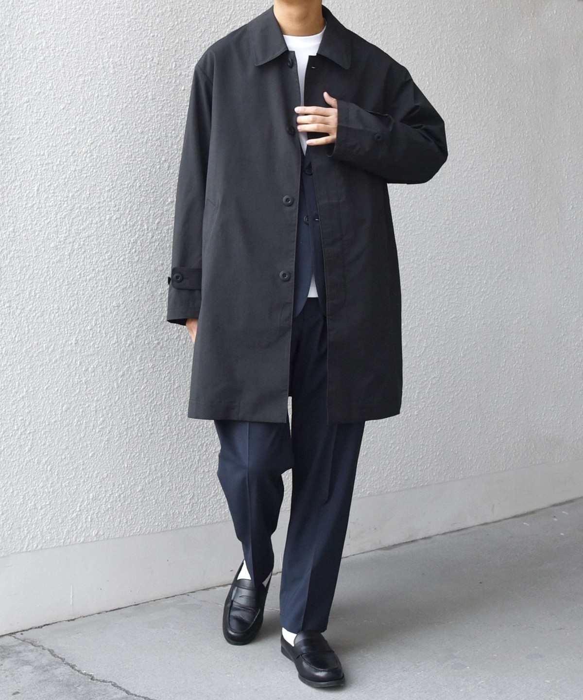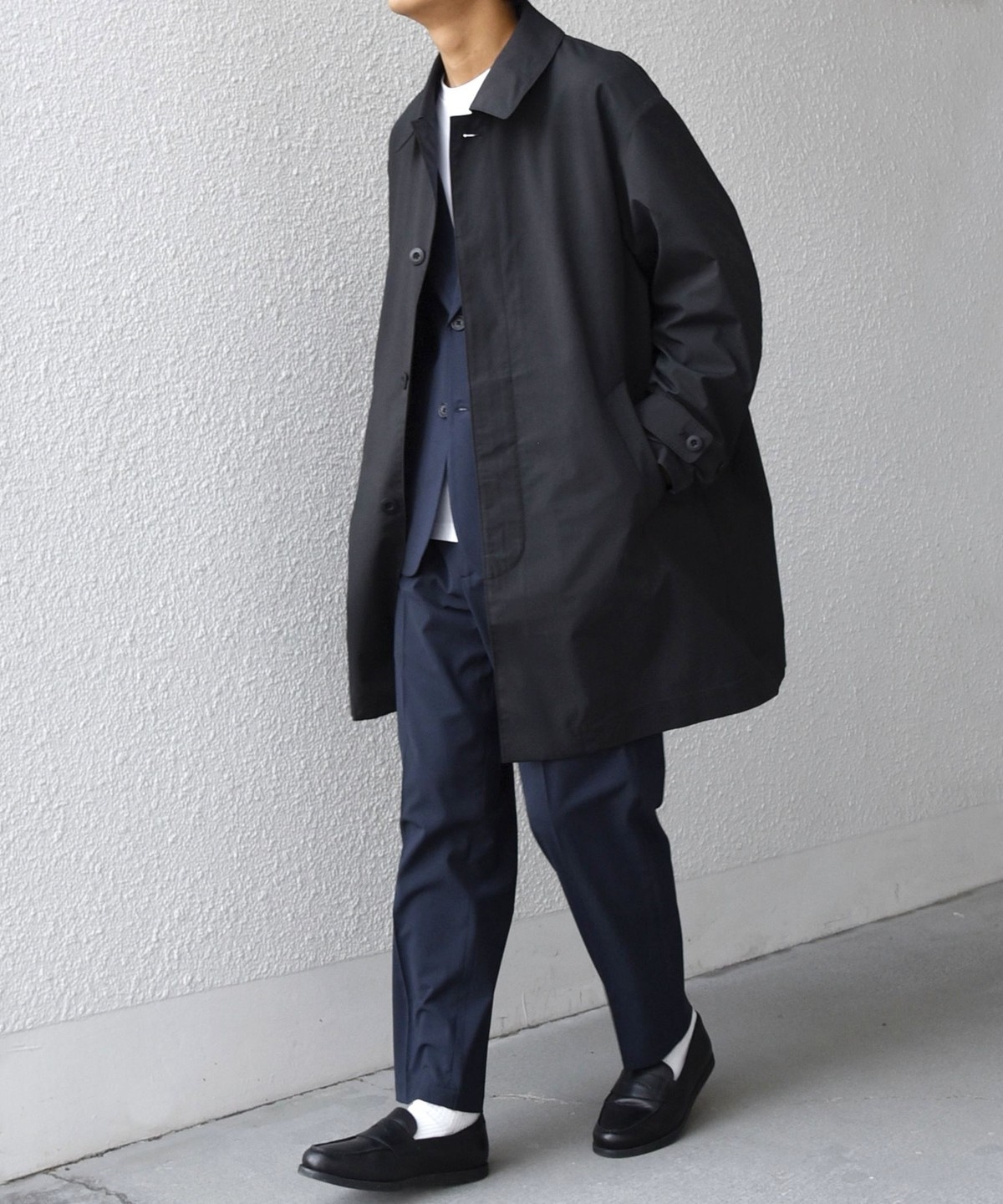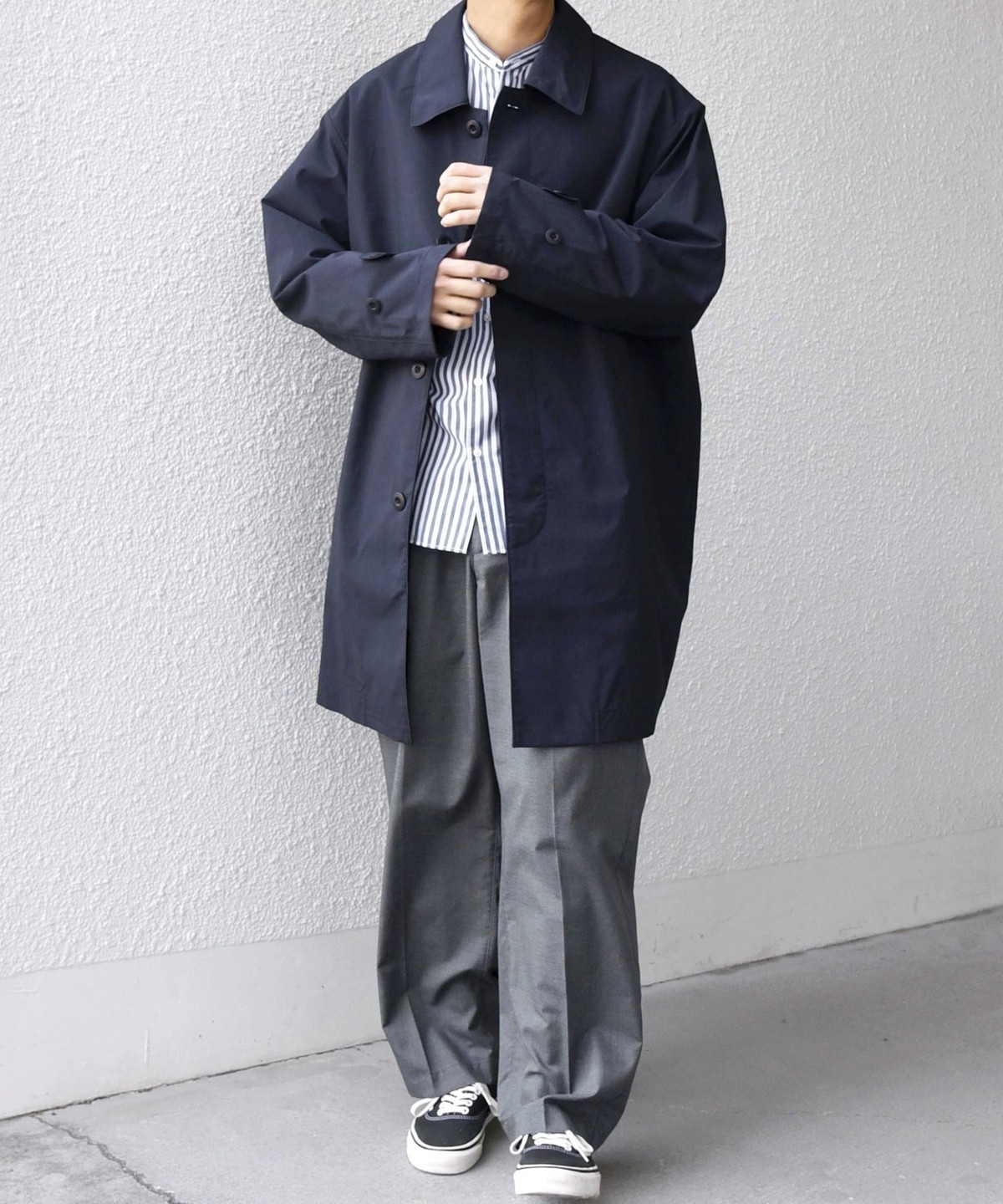 ステンカラーコートをベースに、程よくゆとりを持たせたシルエットのアウター。