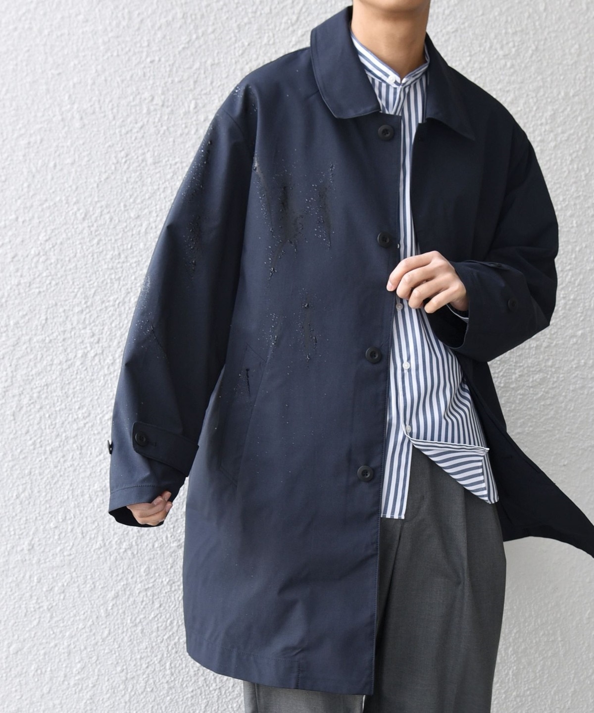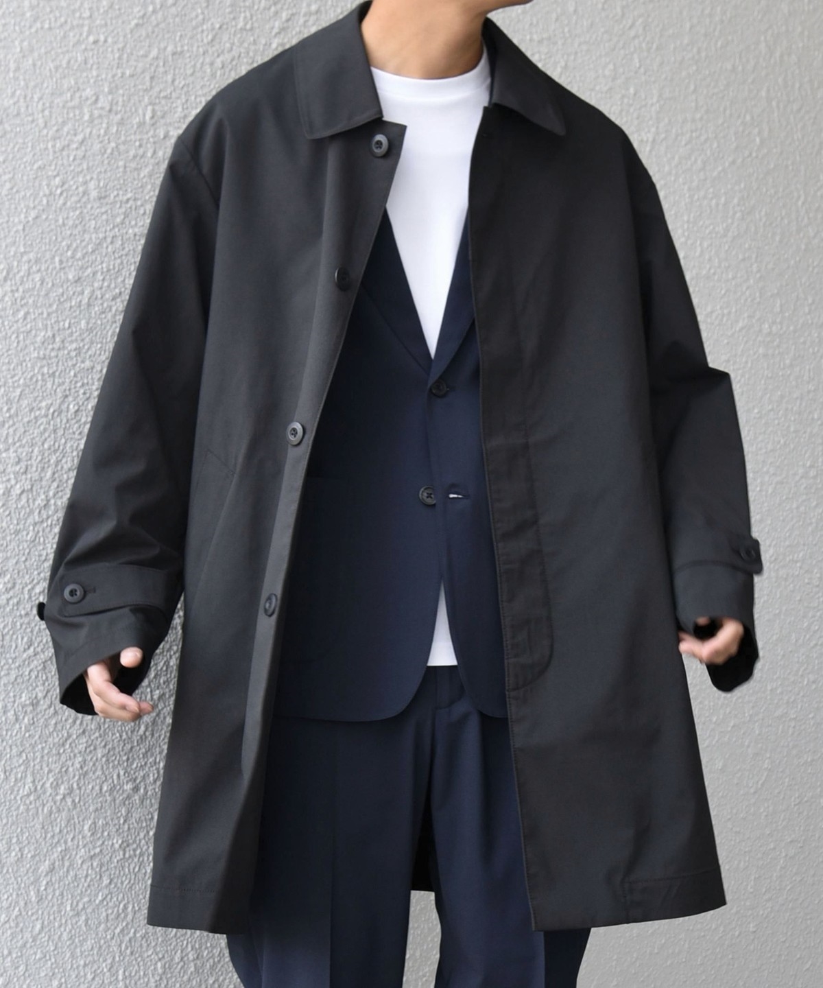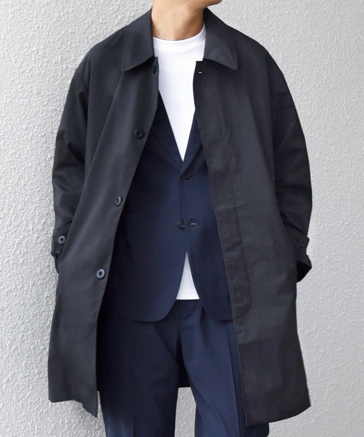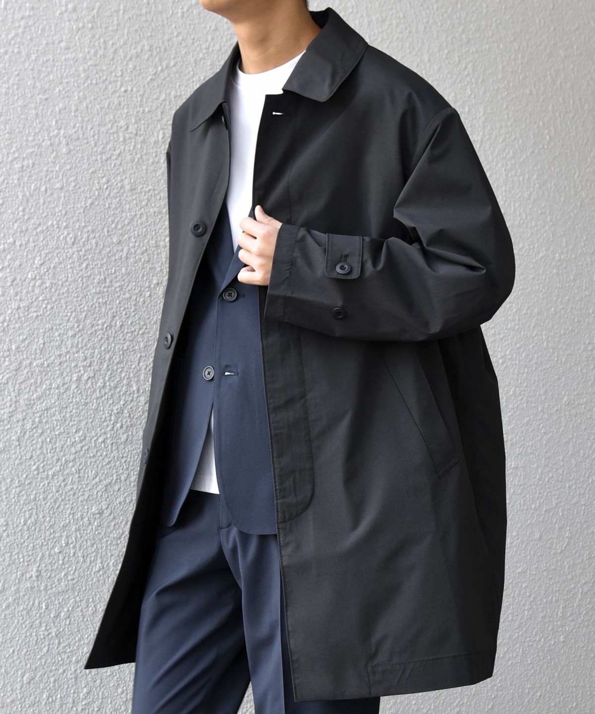 ステンカラーコートをベースに、程よくゆとりを持たせたシルエットのアウター。