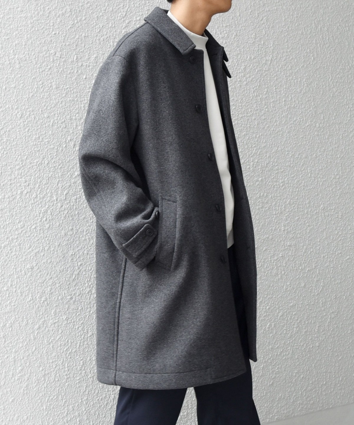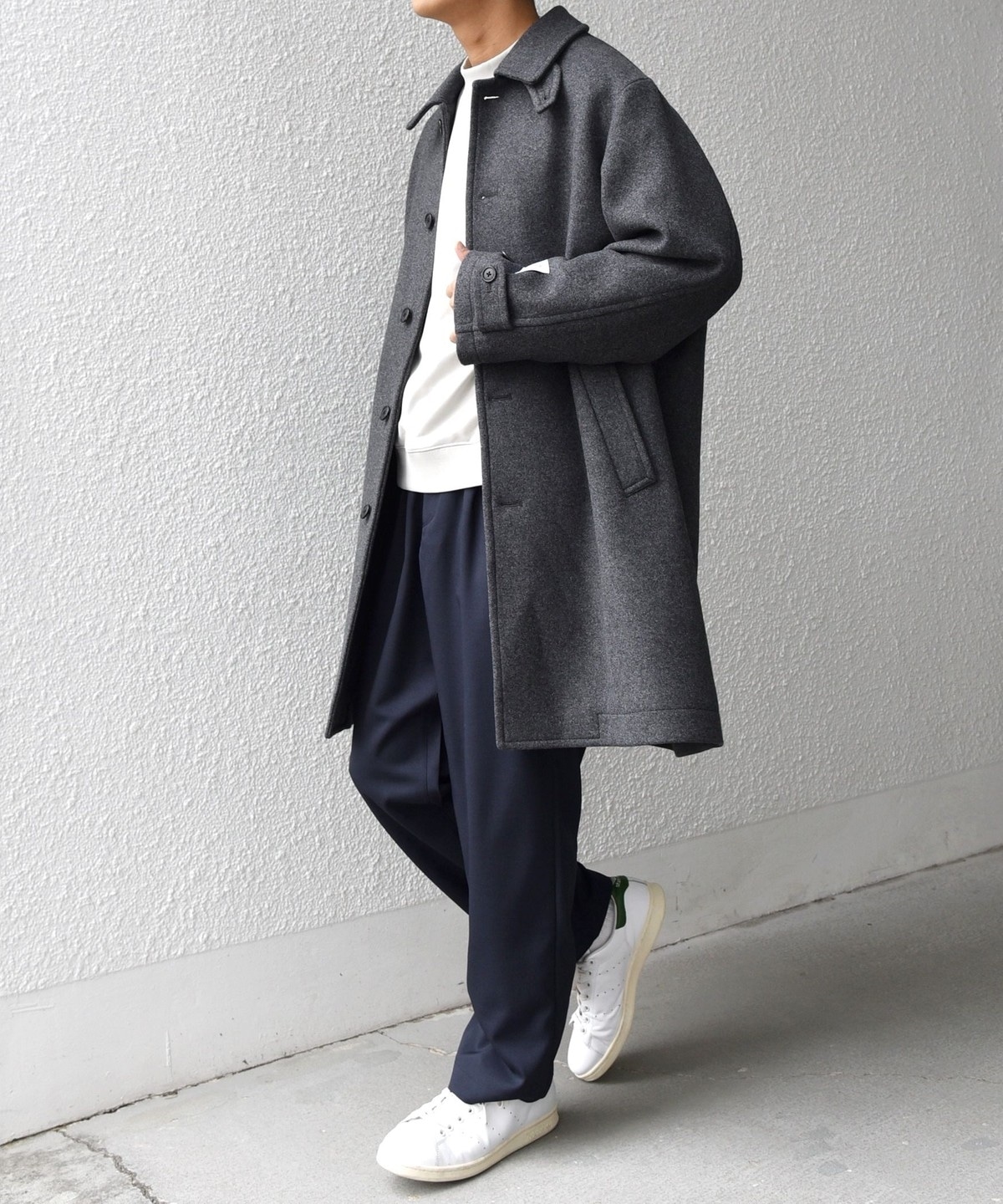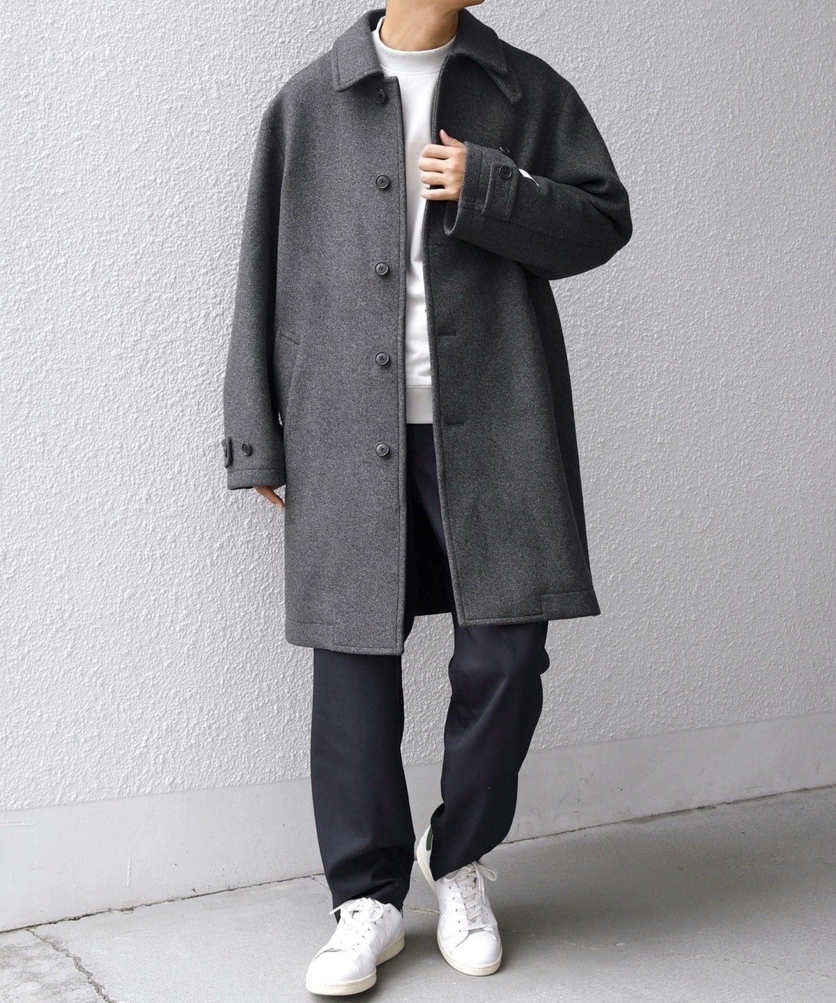 ビジネスからカジュアルまで対応可能なウールメルトンのステンカラーコート