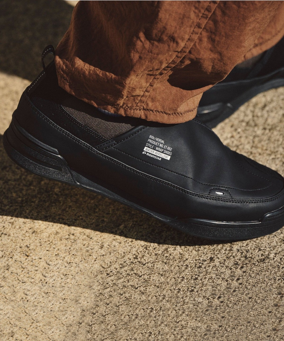 足を包み込むようなアッパーデザインで、リラックス感のあるボトムスに合わせたいスタイリッシュな一足です。
