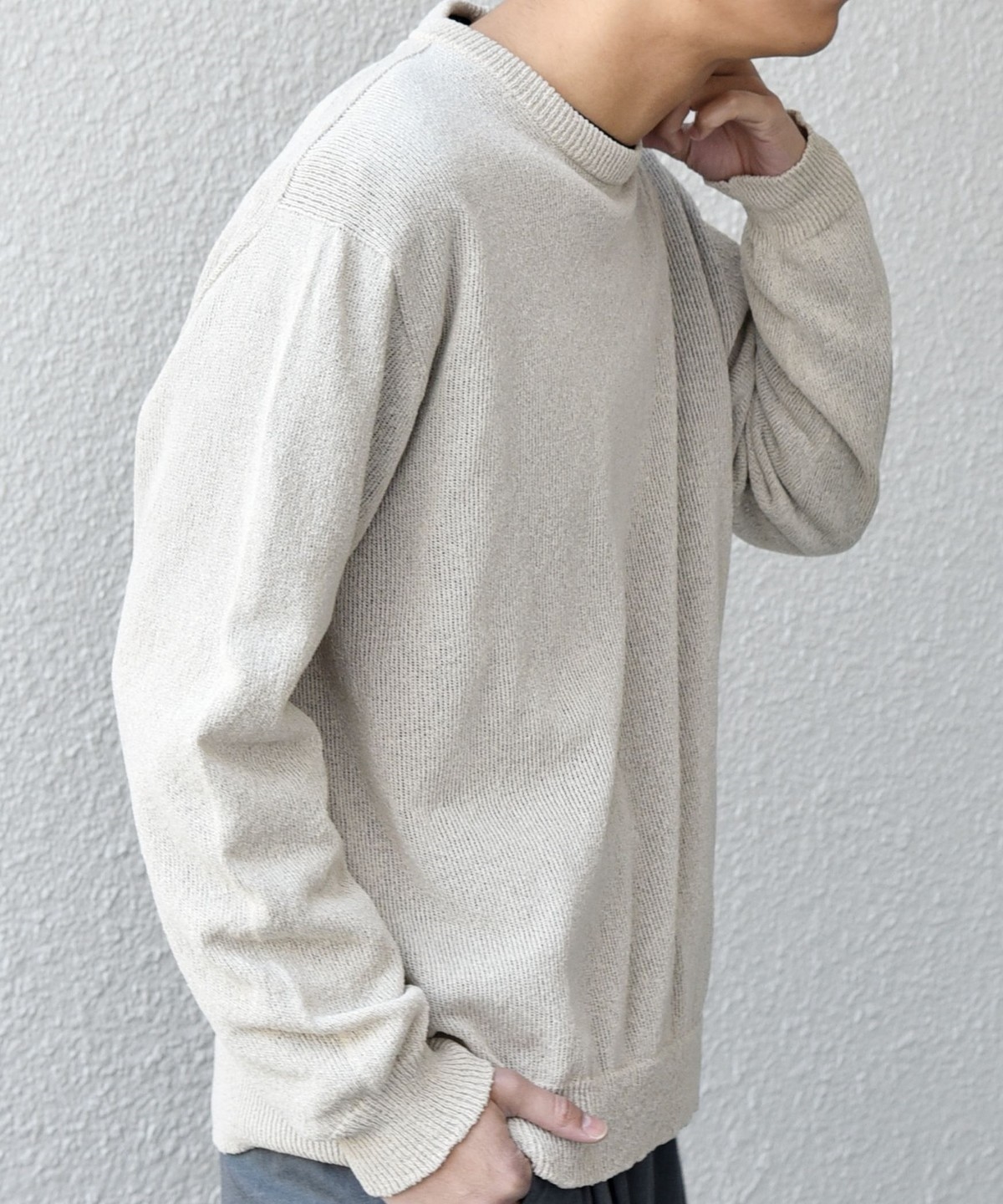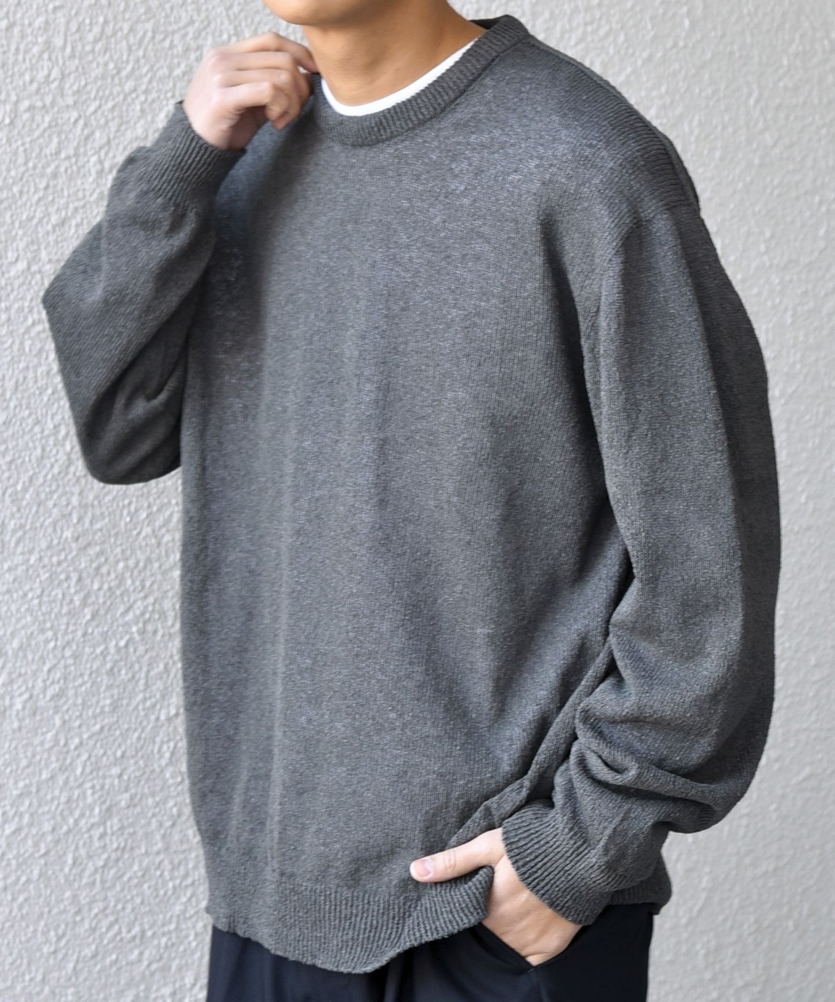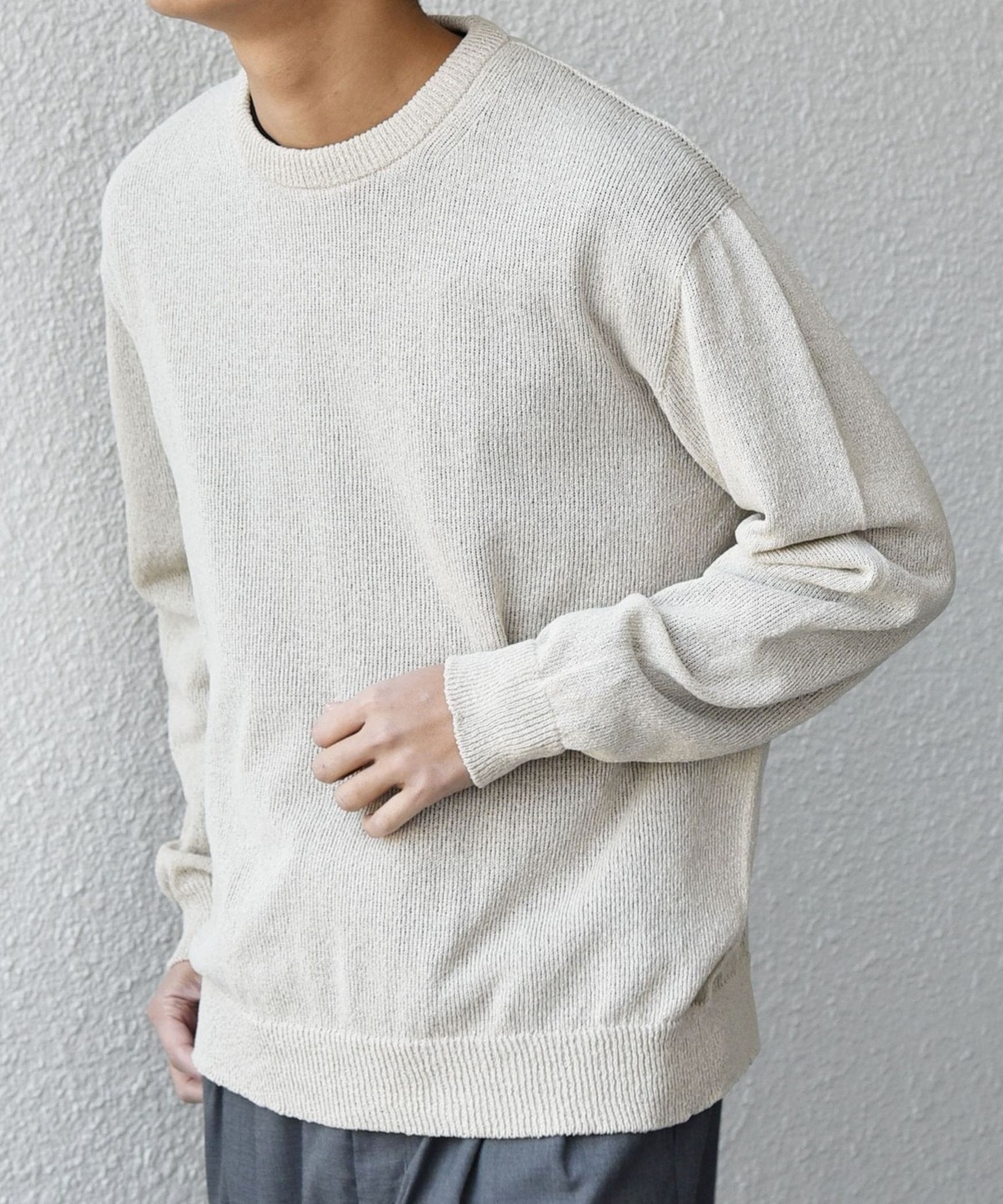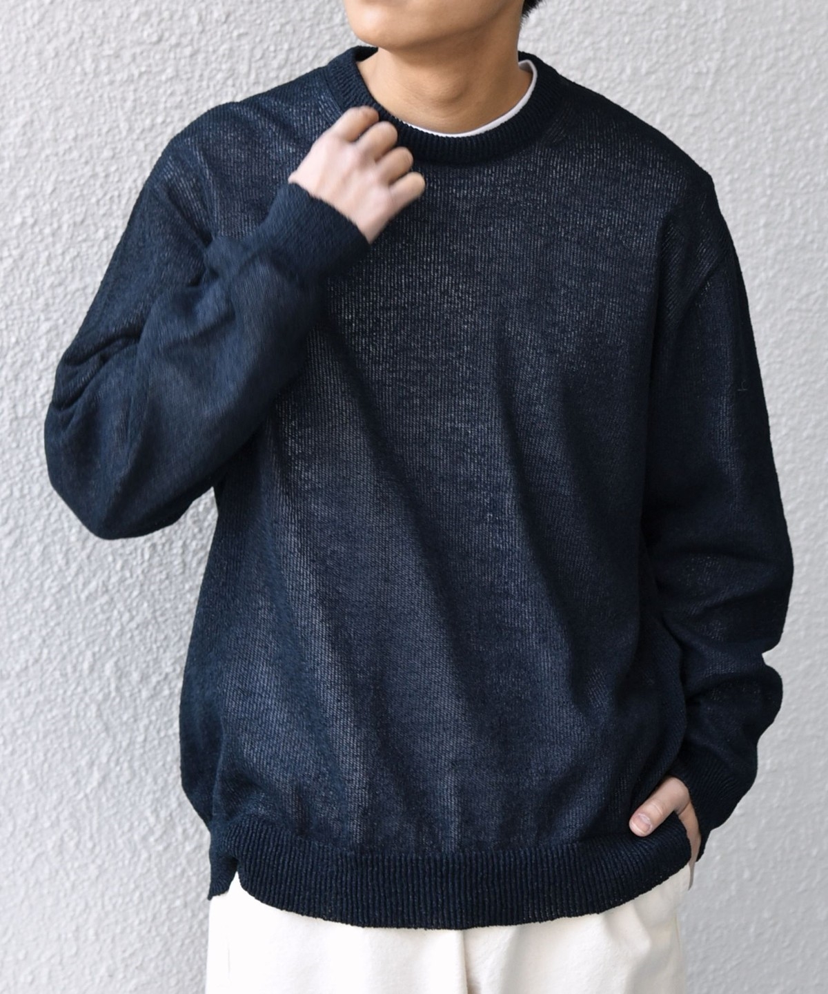 上品且つきれいめな印象でシンプルに使いやすいクルーネックデザインのペーパーヤーンニット。