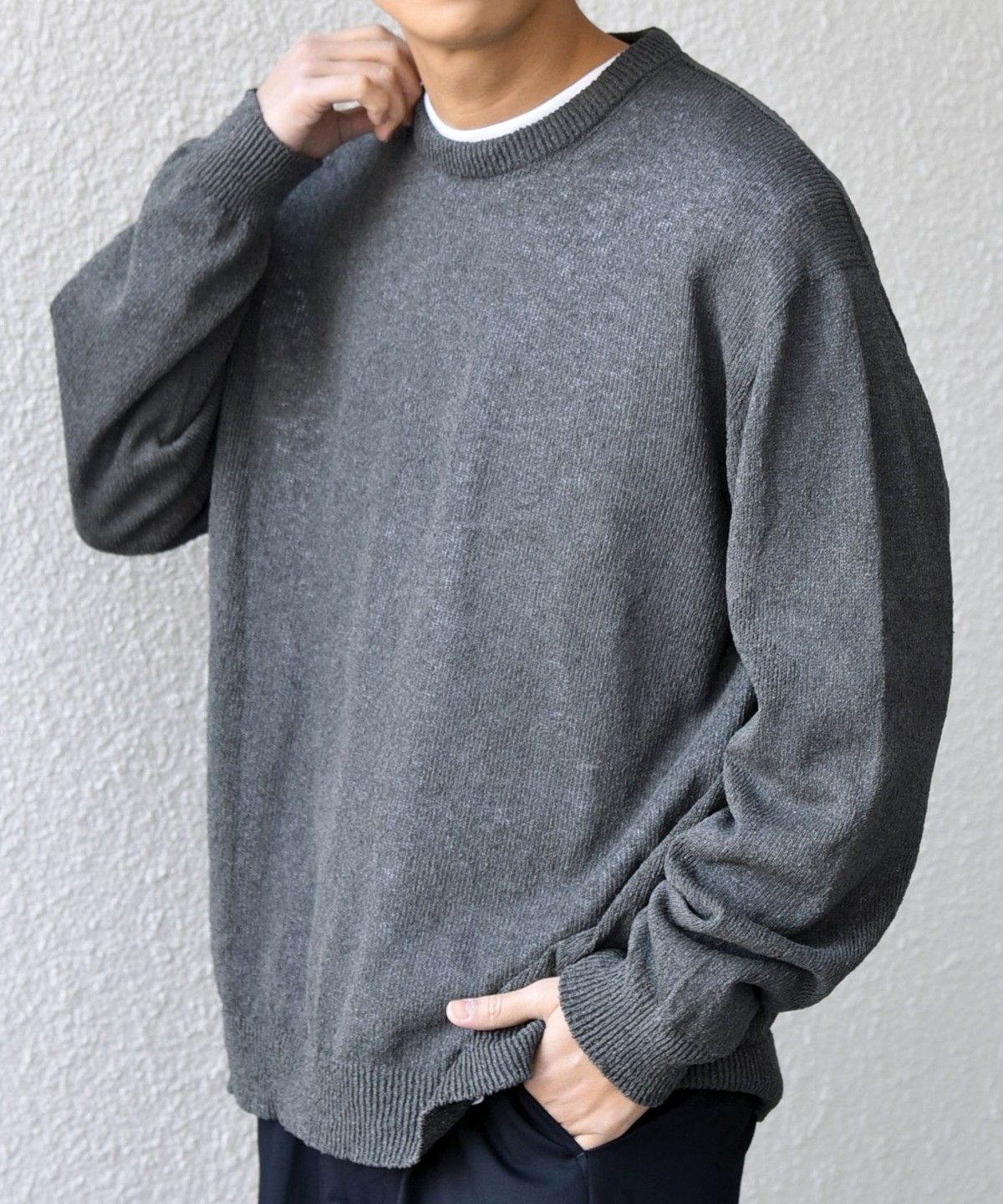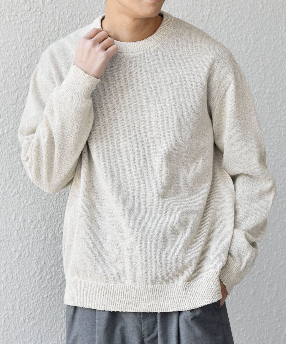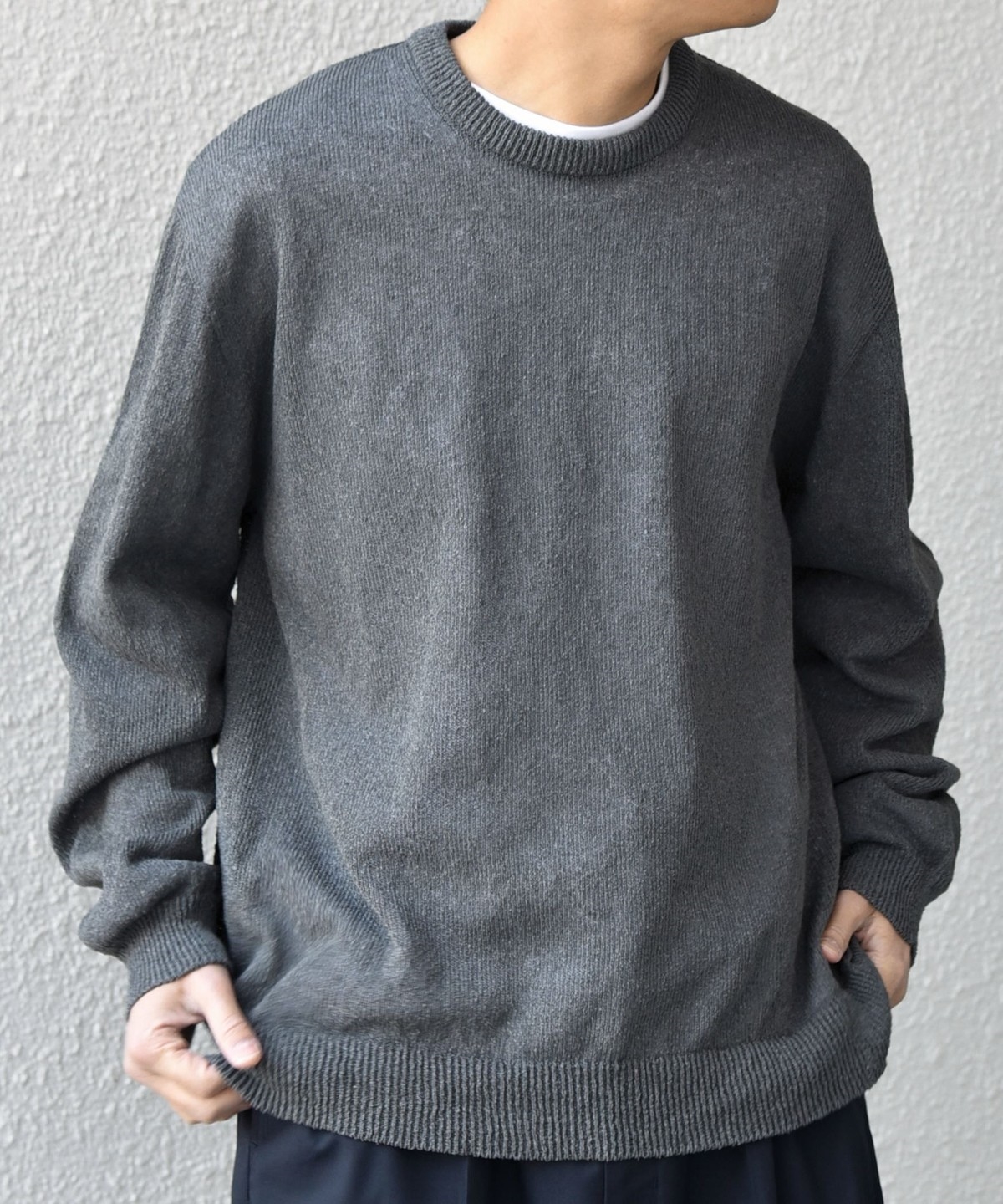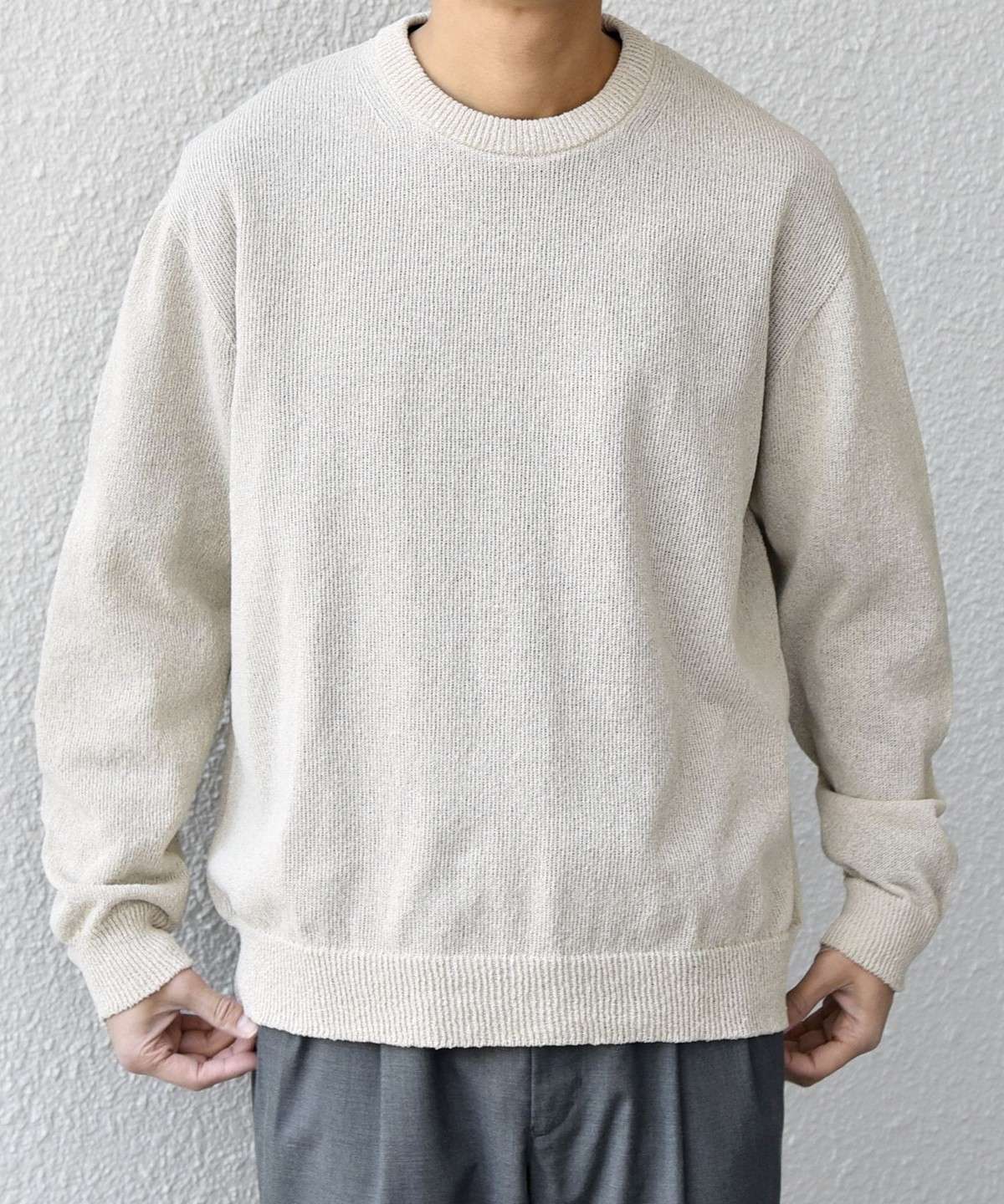 上品且つきれいめな印象でシンプルに使いやすいクルーネックデザインのペーパーヤーンニット。
