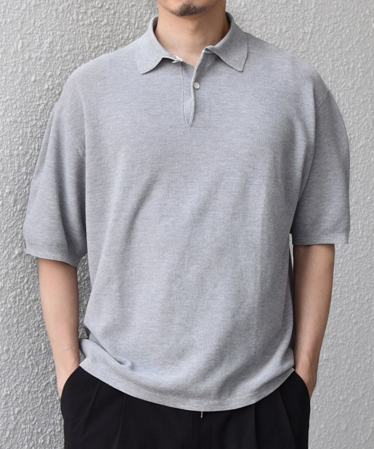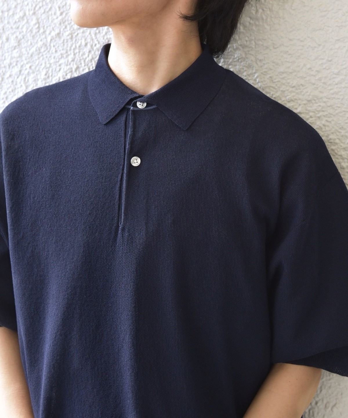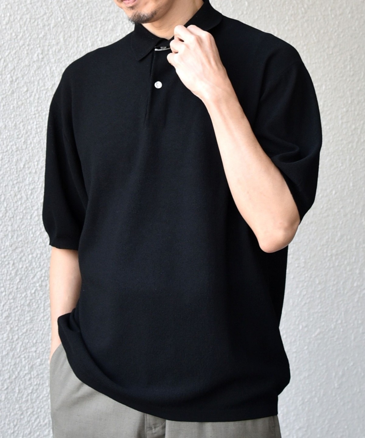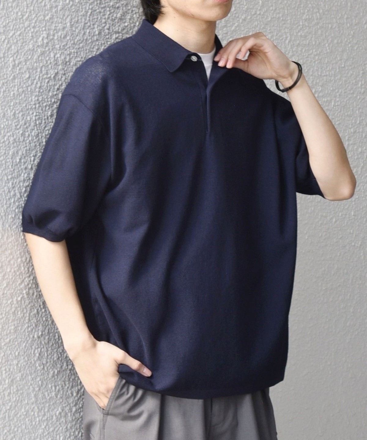 カットソーのポロシャツでは出せない、上品なニットならではの柔らかな表情がポイントです。