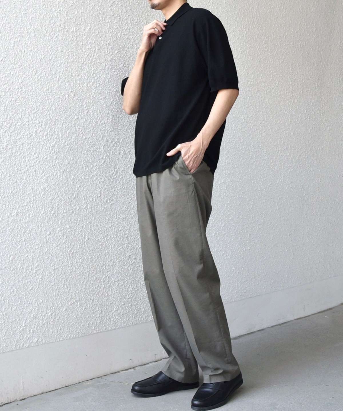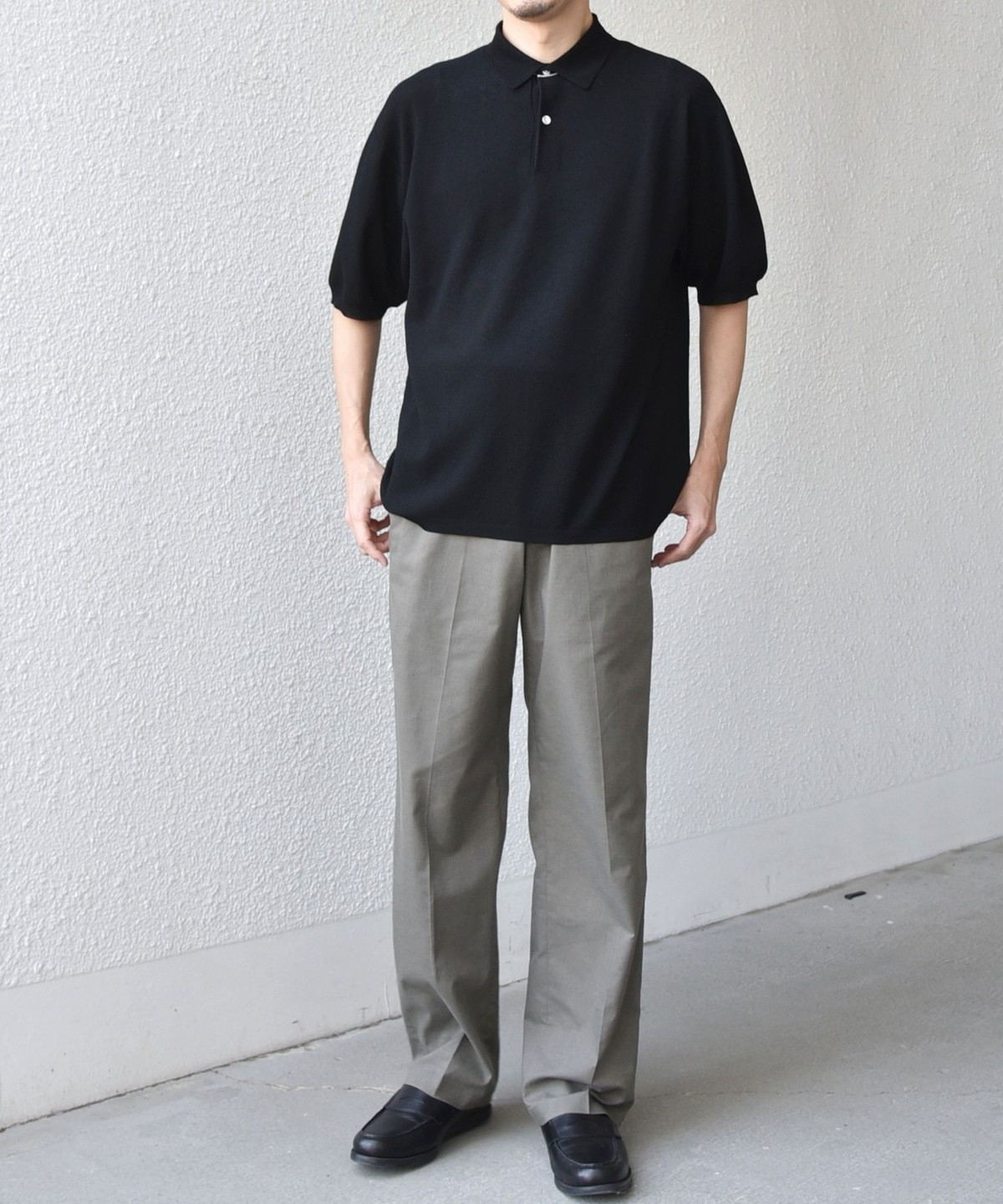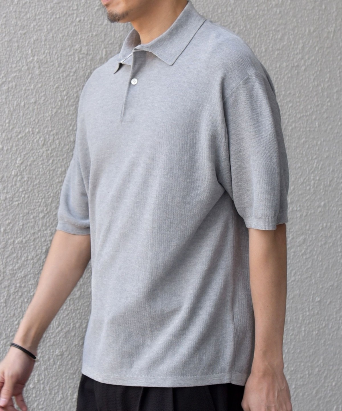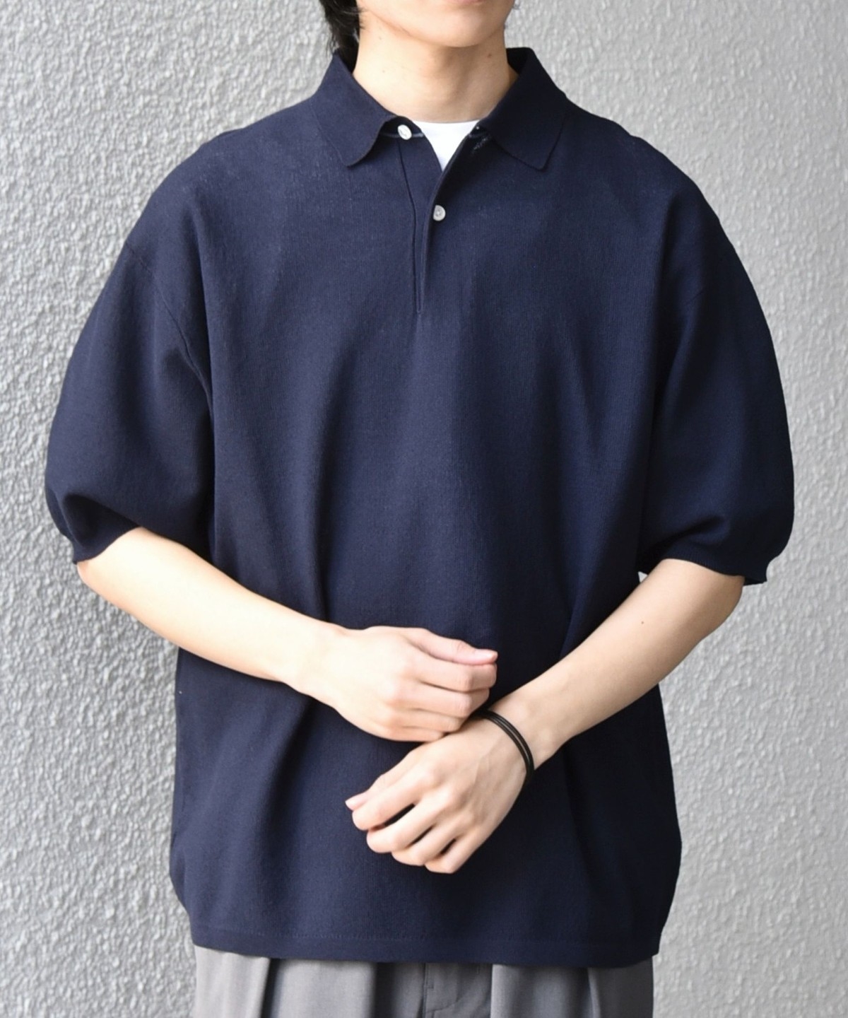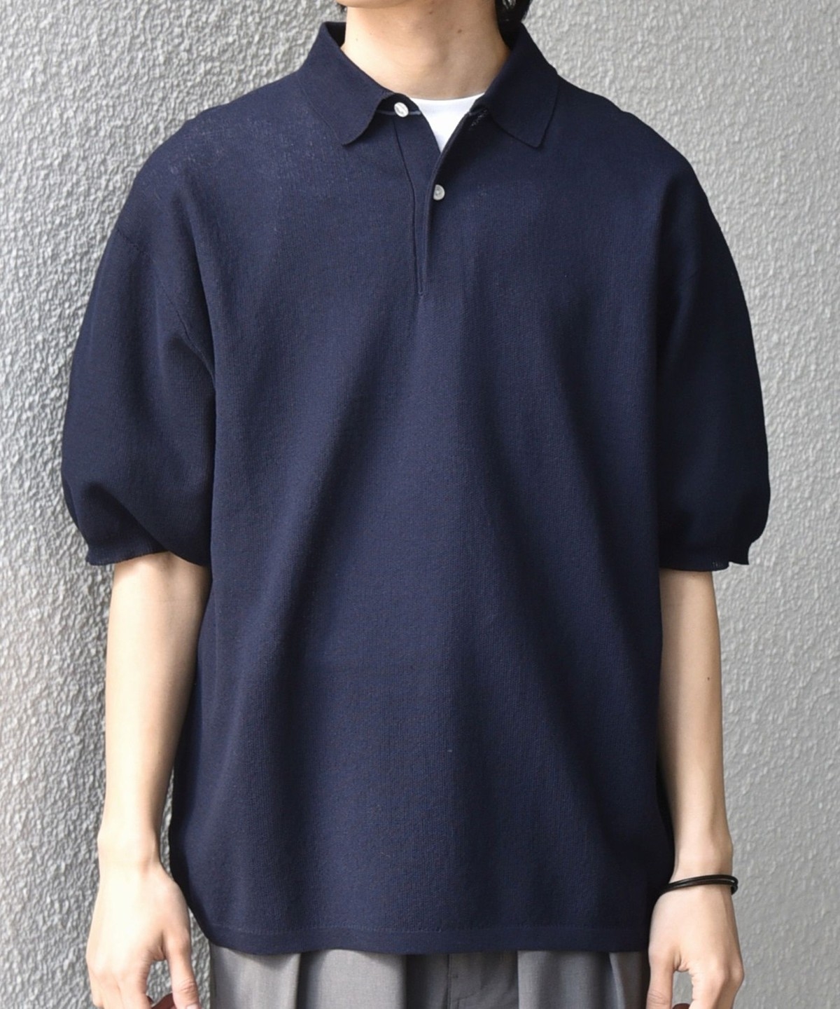 カットソーのポロシャツでは出せない、上品なニットならではの柔らかな表情がポイントです。