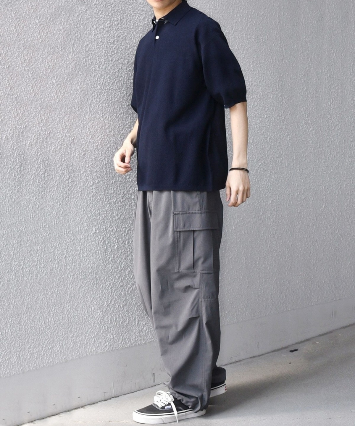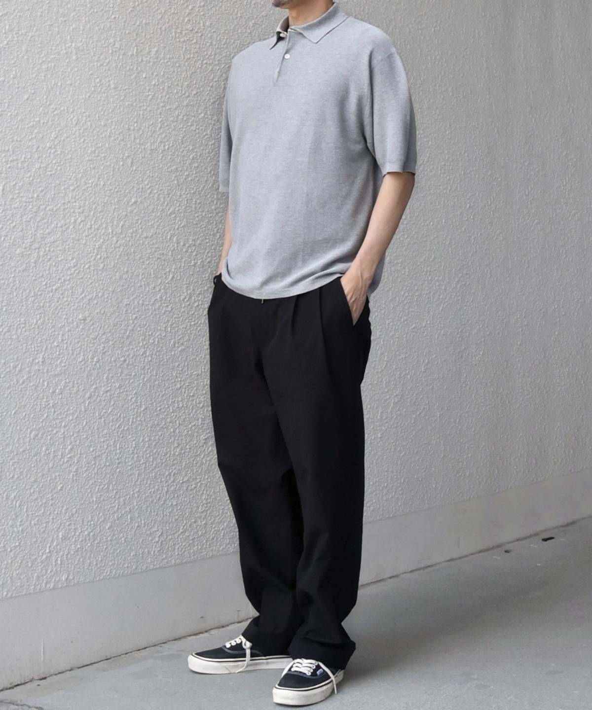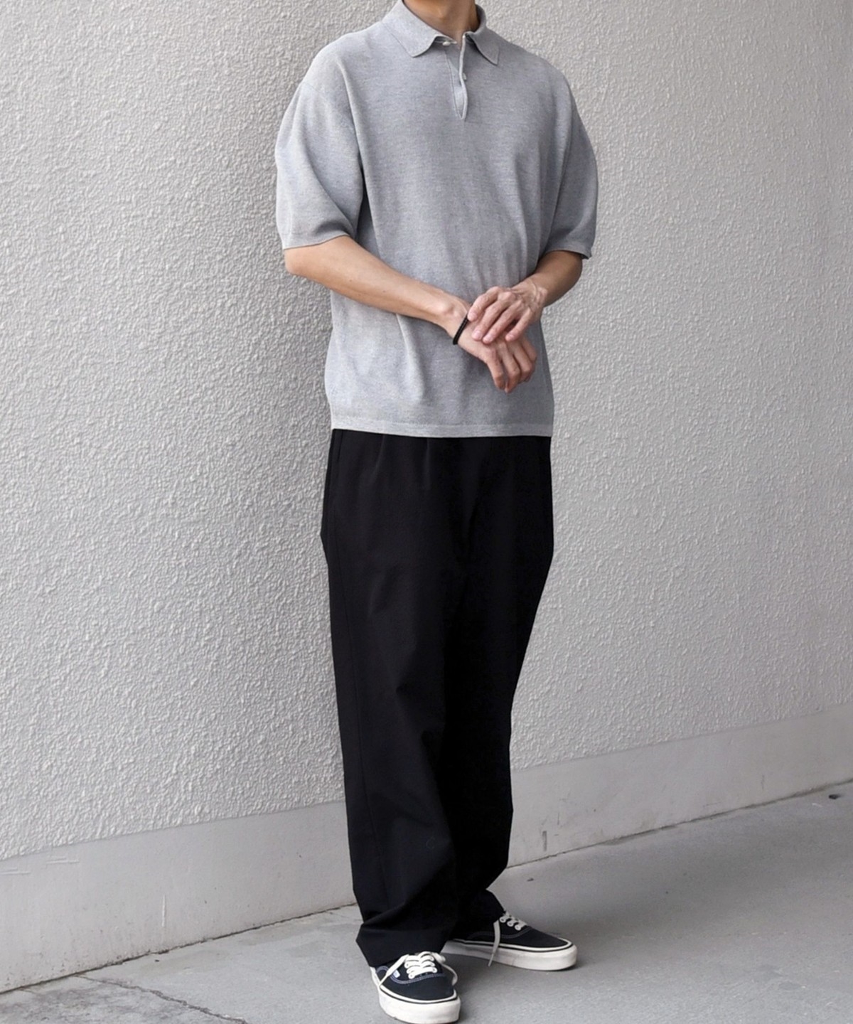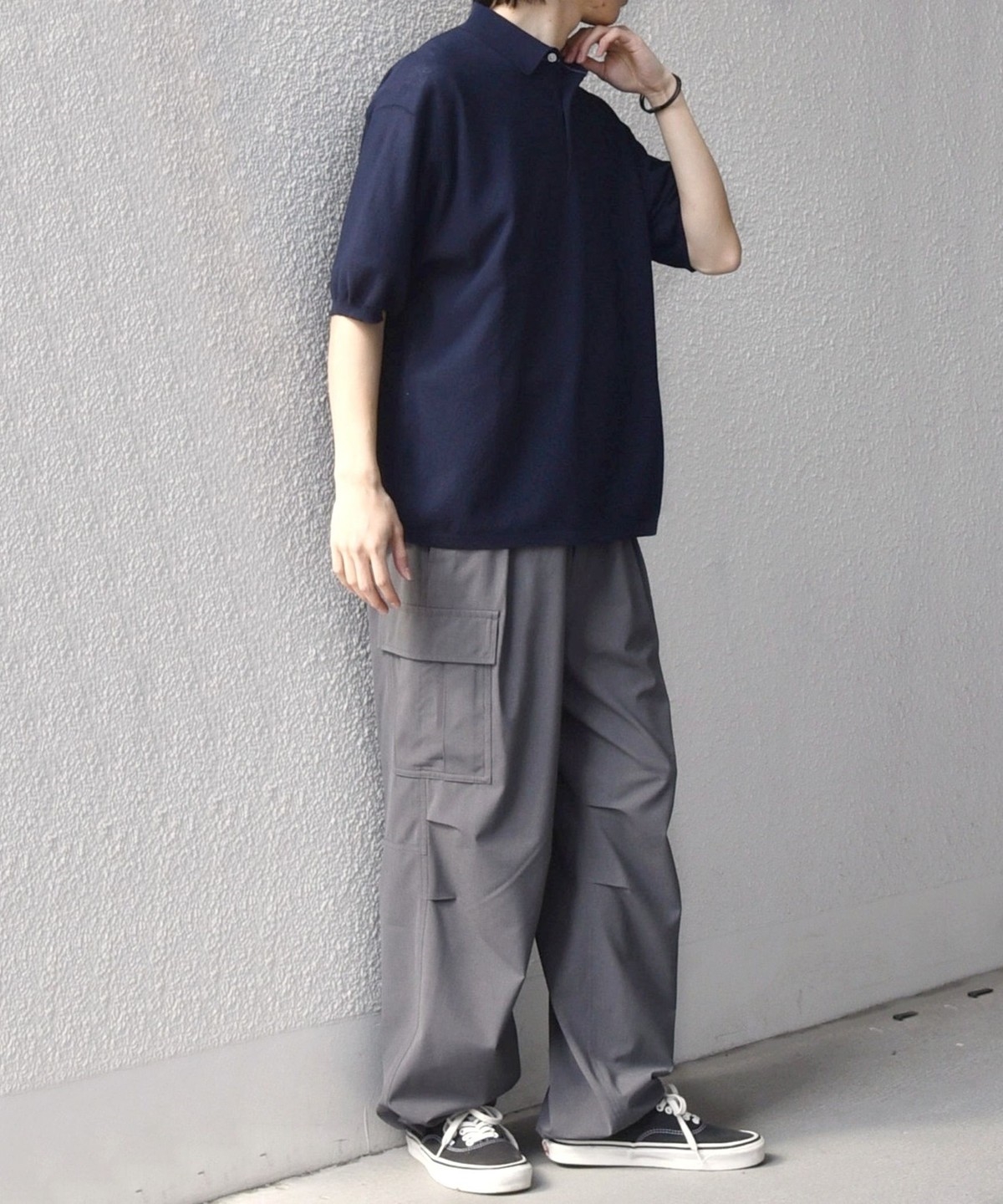 カットソーのポロシャツでは出せない、上品なニットならではの柔らかな表情がポイントです。