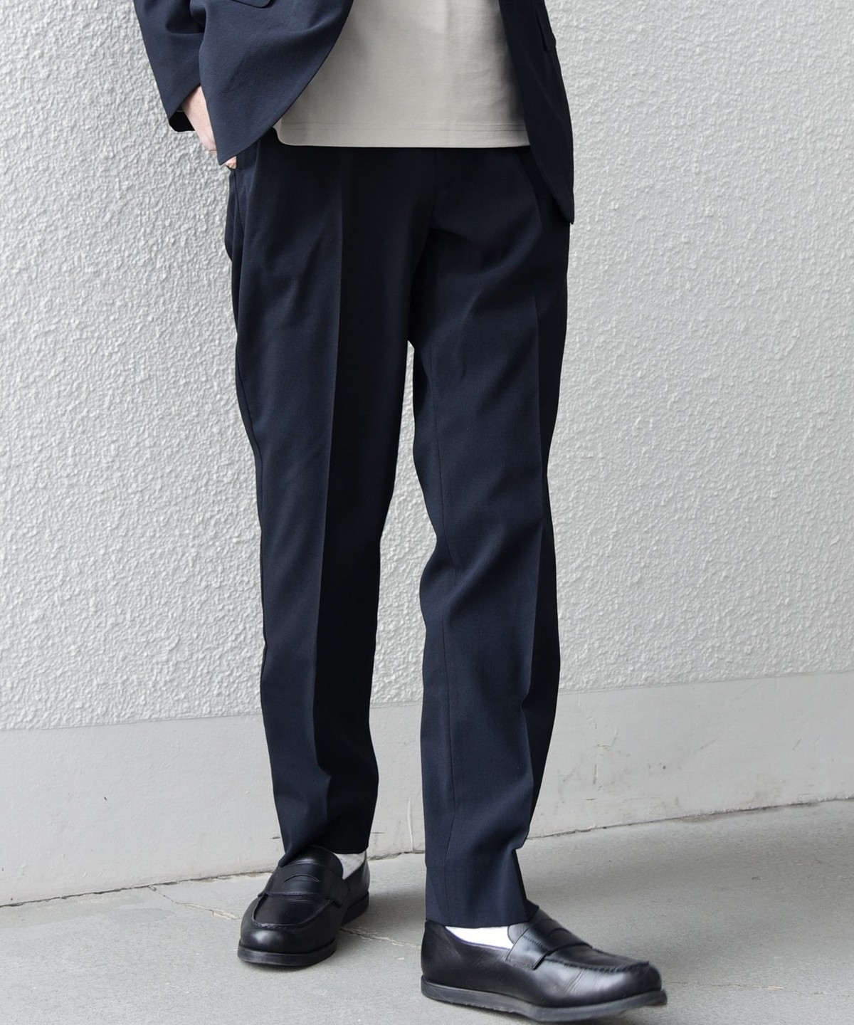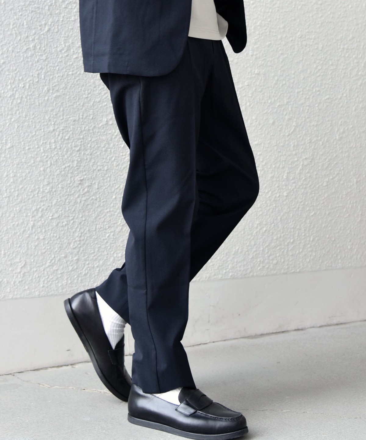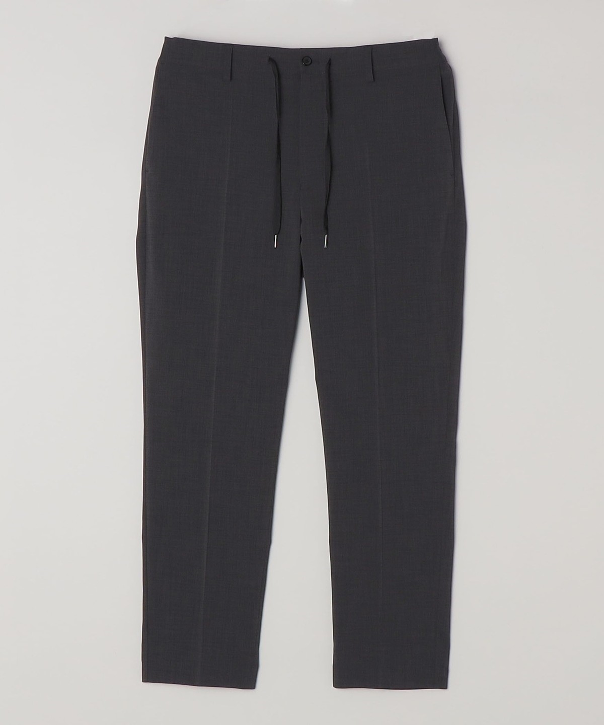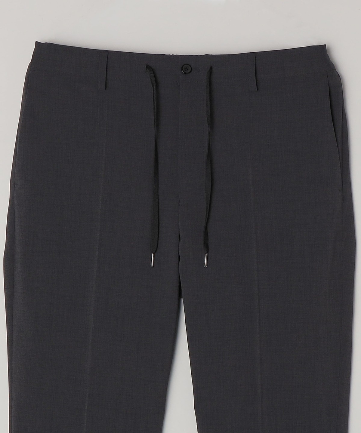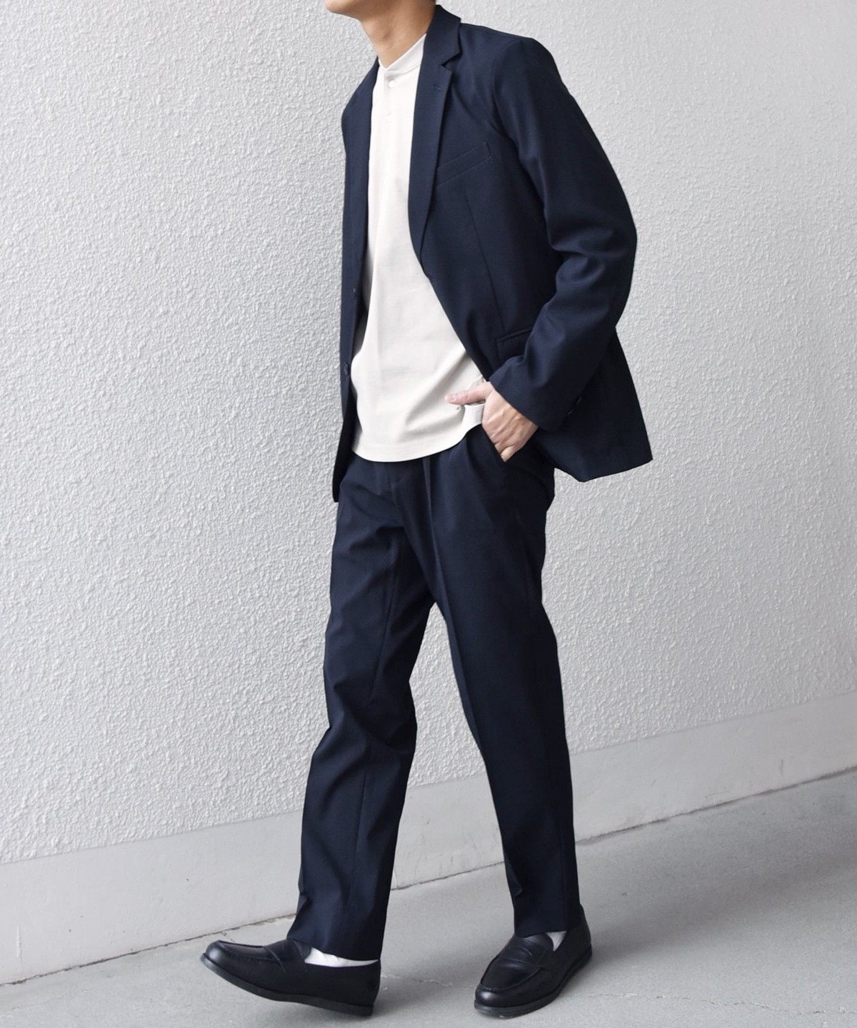 ボトムスはベルトループ付きのイージーパンツ仕様で、股上をやや深めに設定することでスッキリとしたシルエットながら穿き心地が◎
