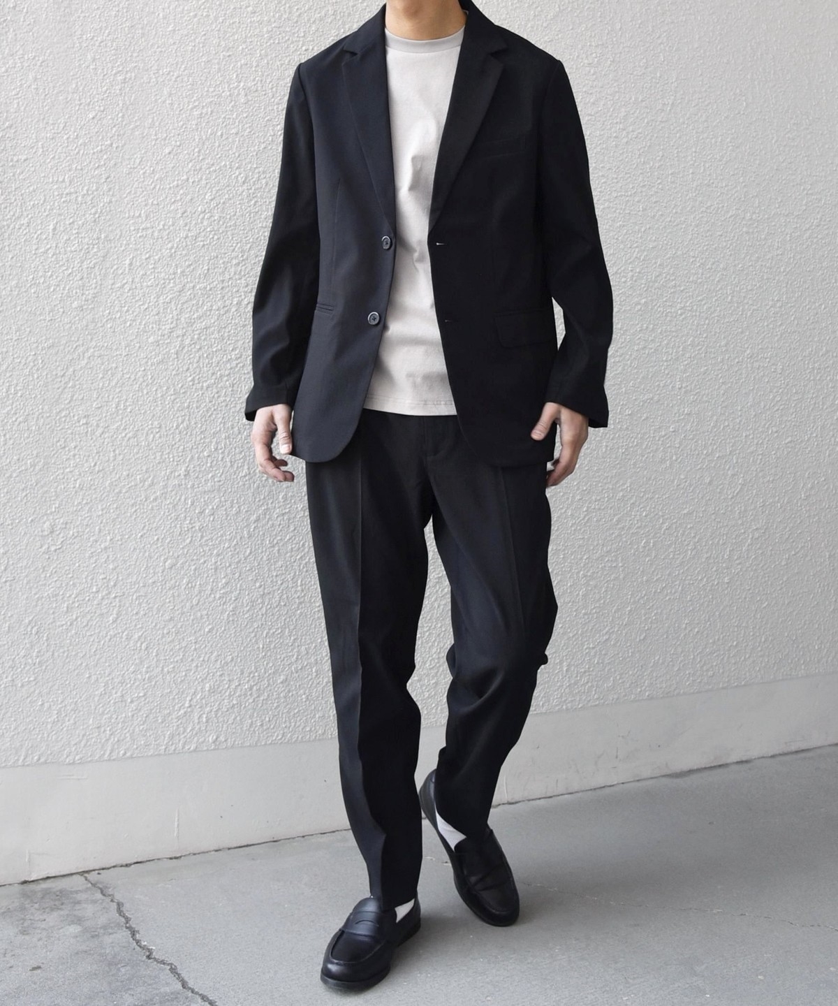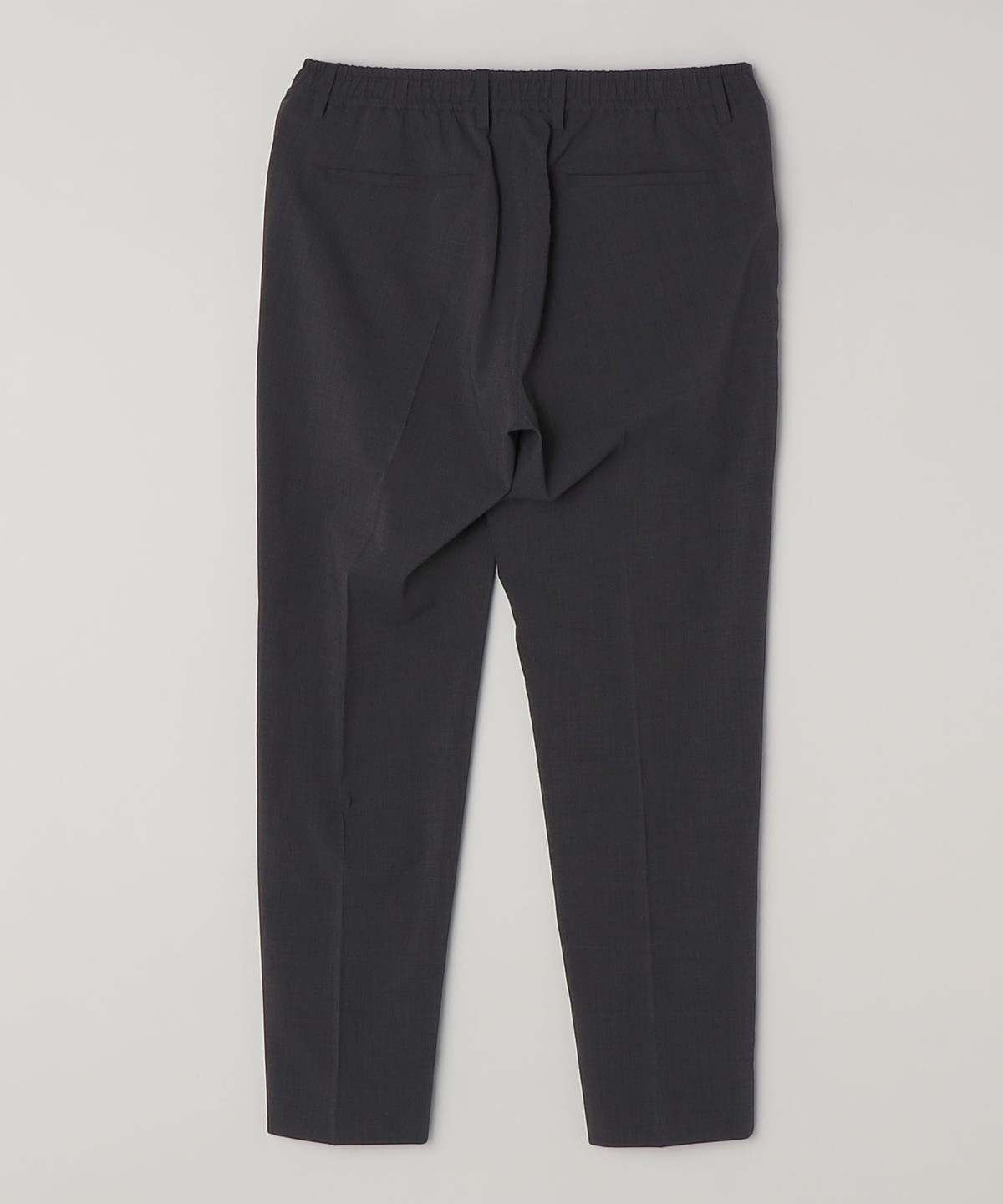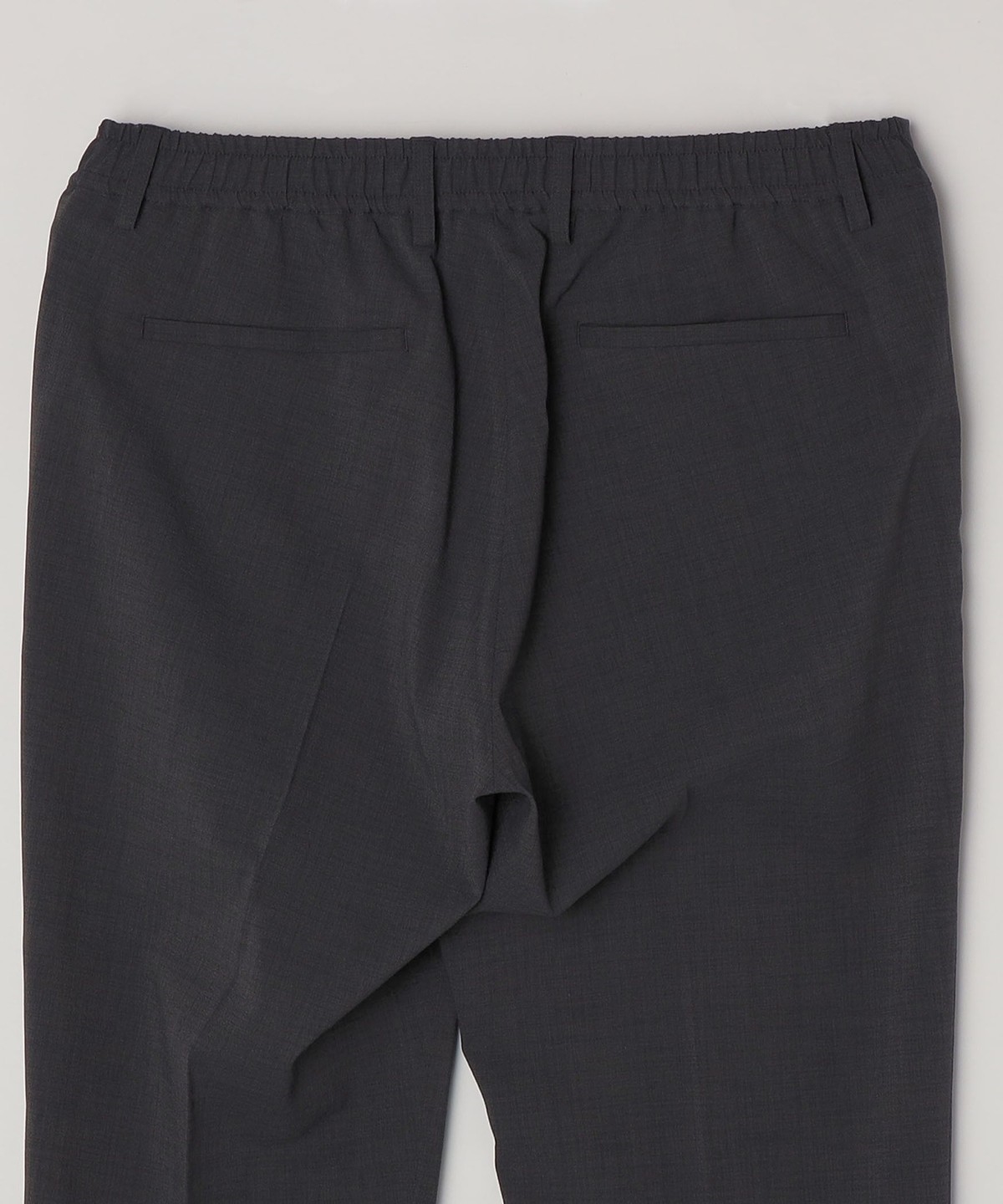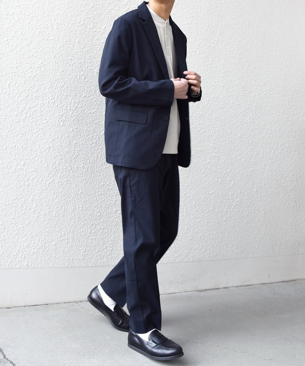 ボトムスはベルトループ付きのイージーパンツ仕様で、股上をやや深めに設定することでスッキリとしたシルエットながら穿き心地が◎