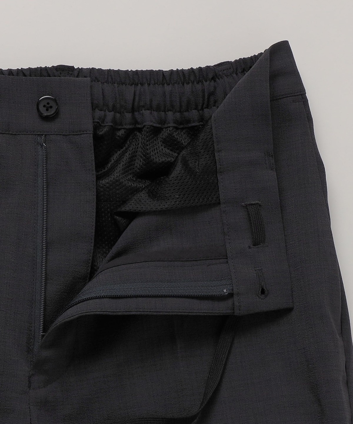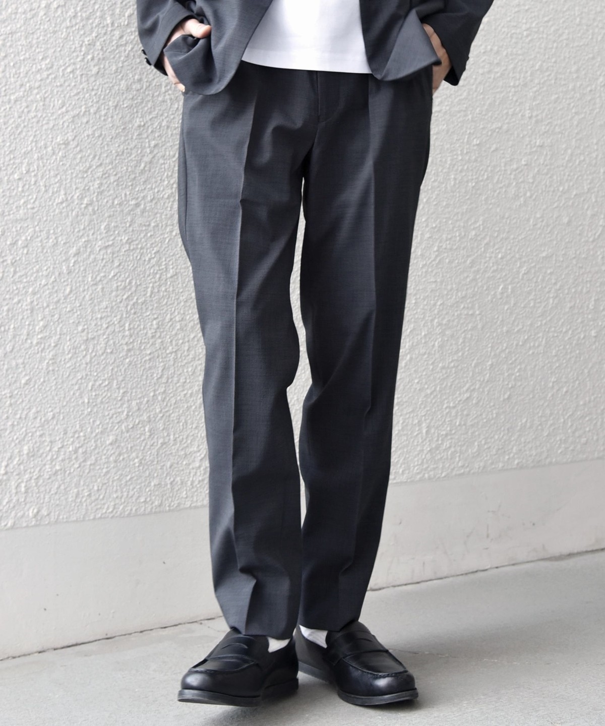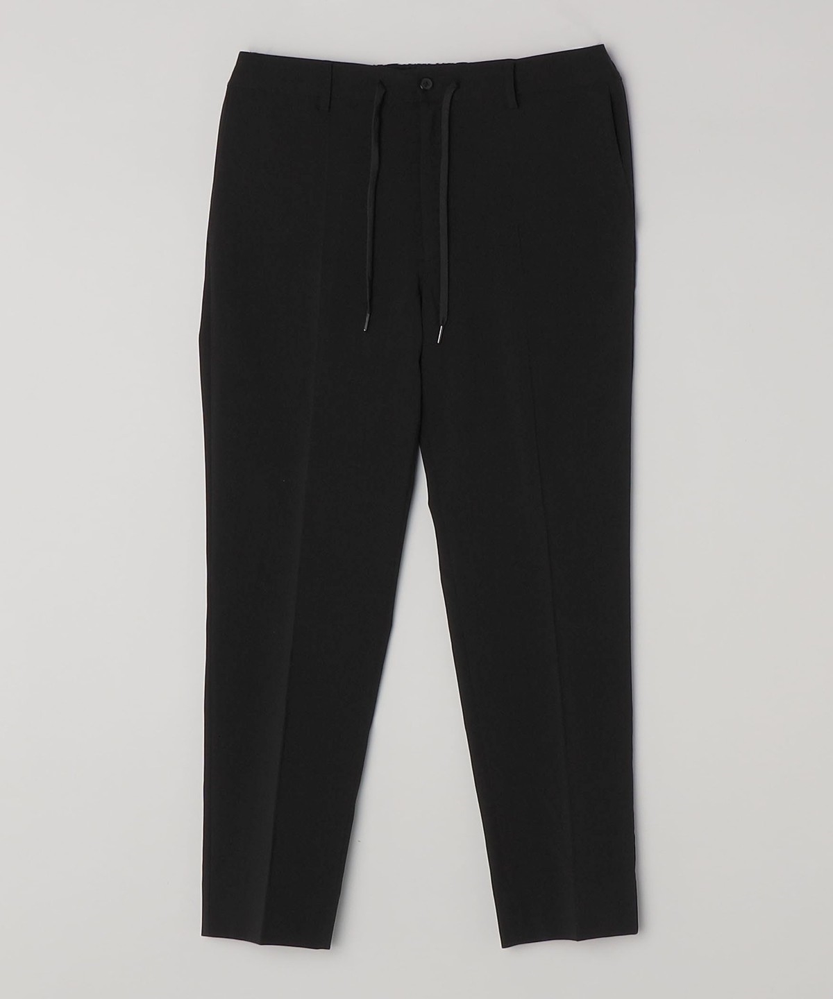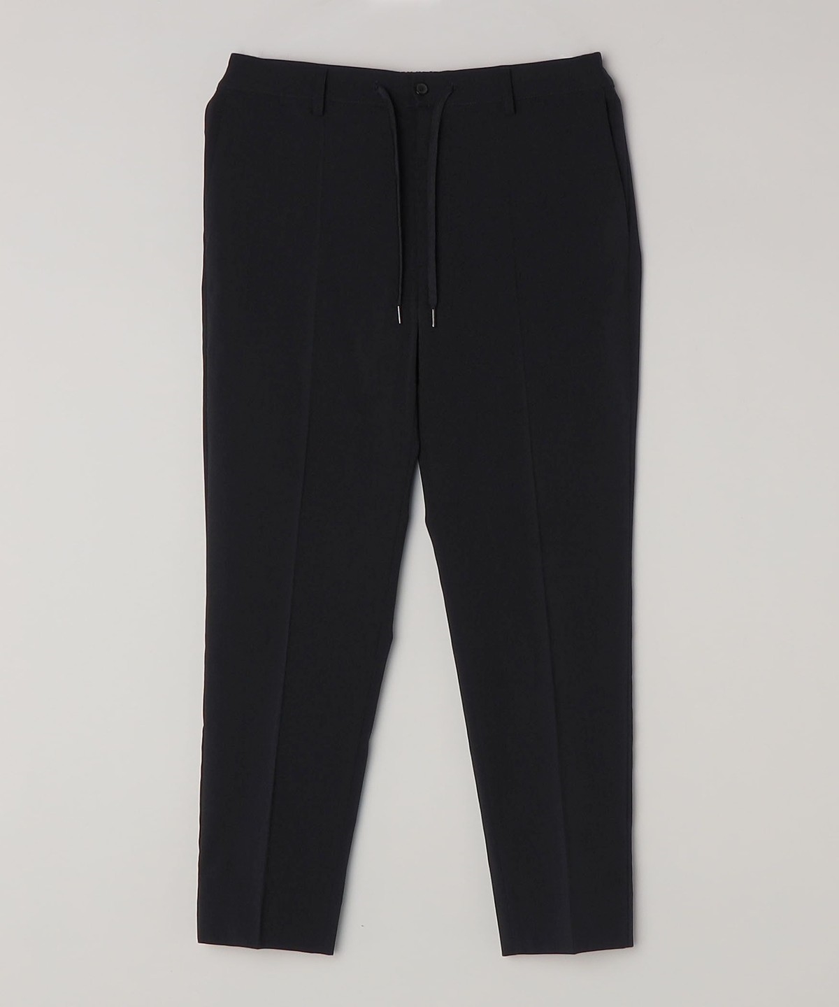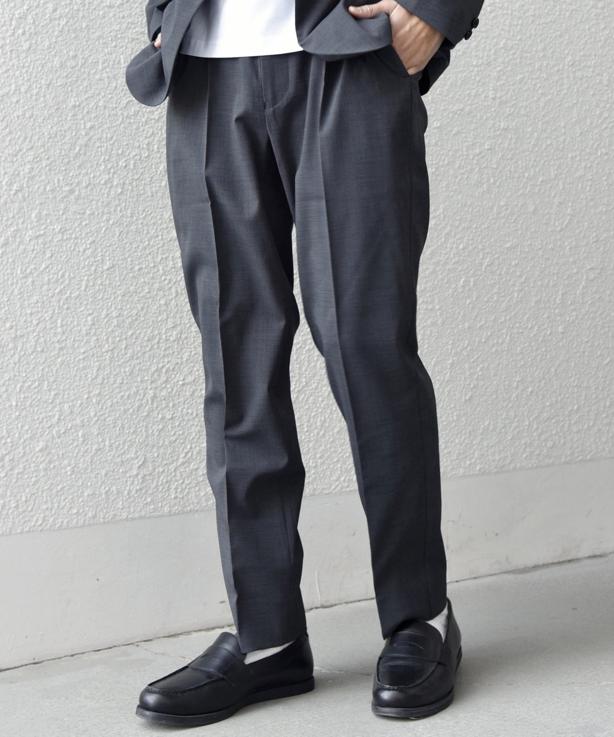 ボトムスはベルトループ付きのイージーパンツ仕様で、股上をやや深めに設定することでスッキリとしたシルエットながら穿き心地が◎