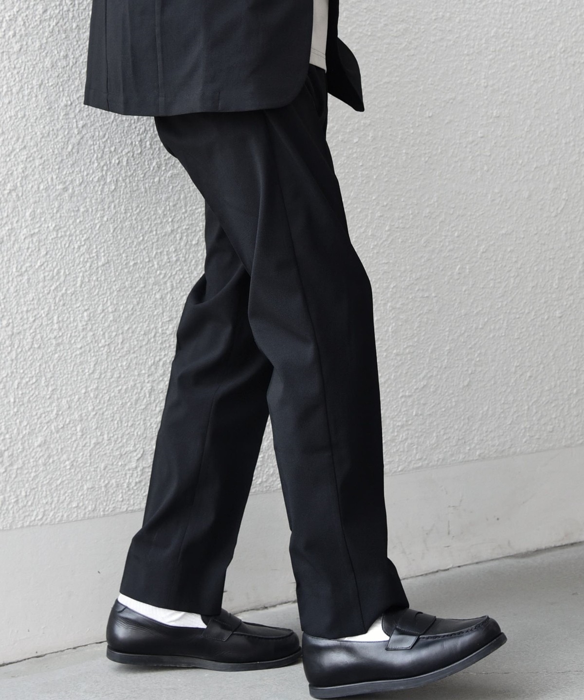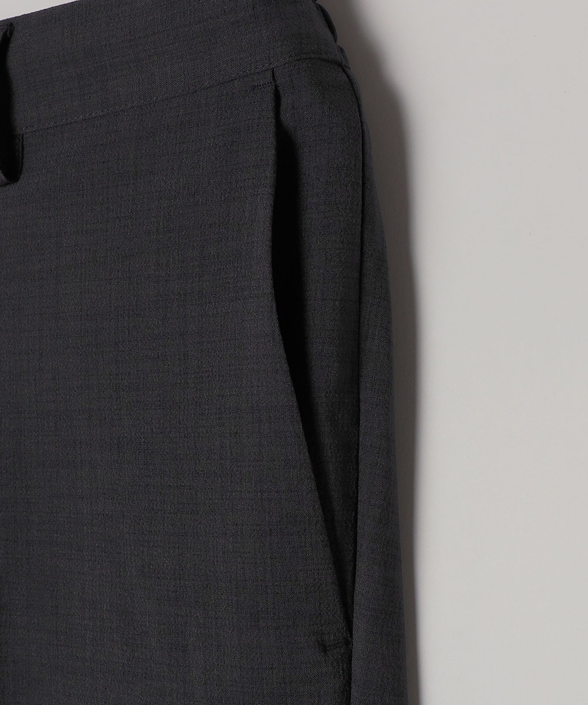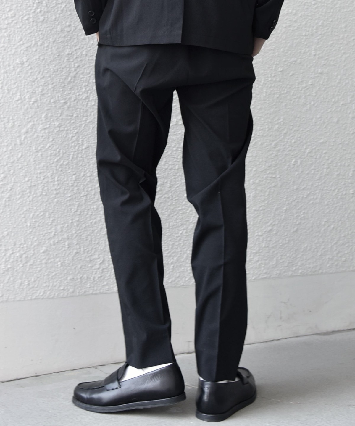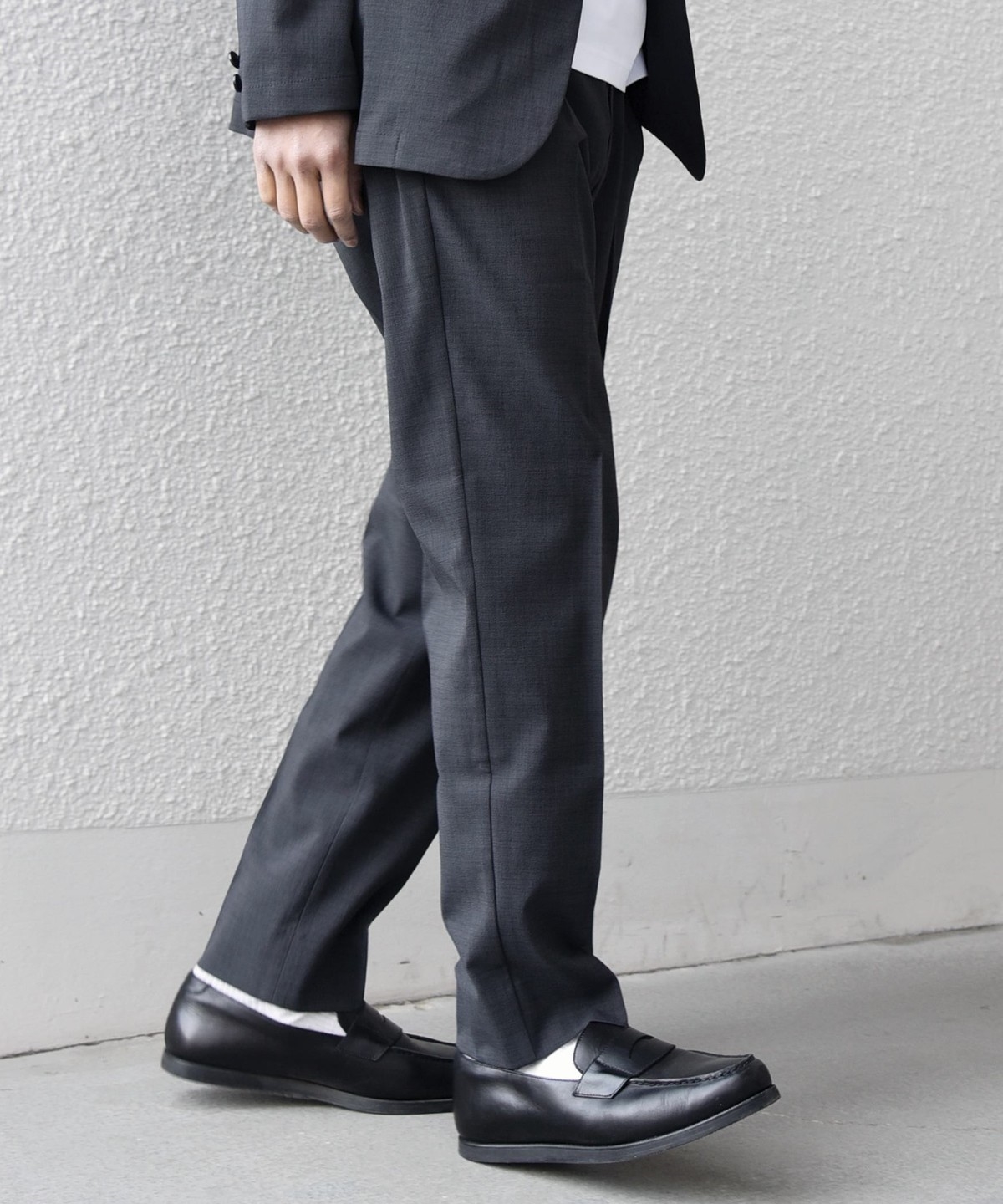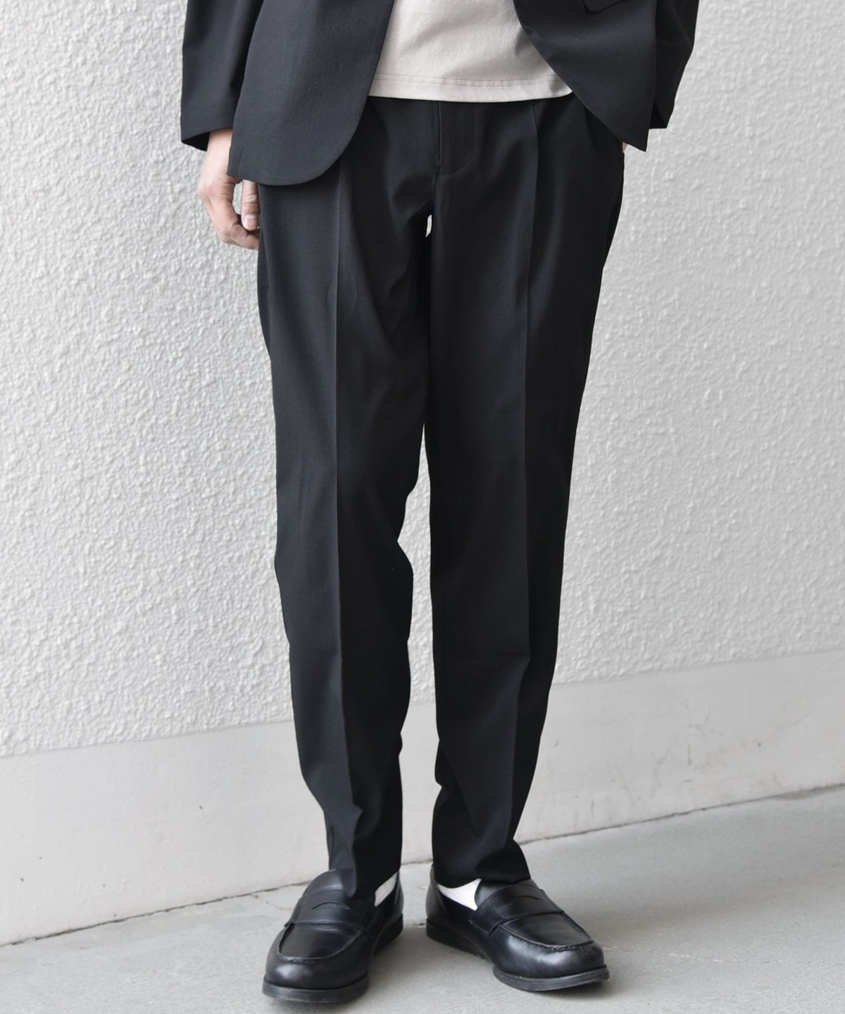 ボトムスはベルトループ付きのイージーパンツ仕様で、股上をやや深めに設定することでスッキリとしたシルエットながら穿き心地が◎