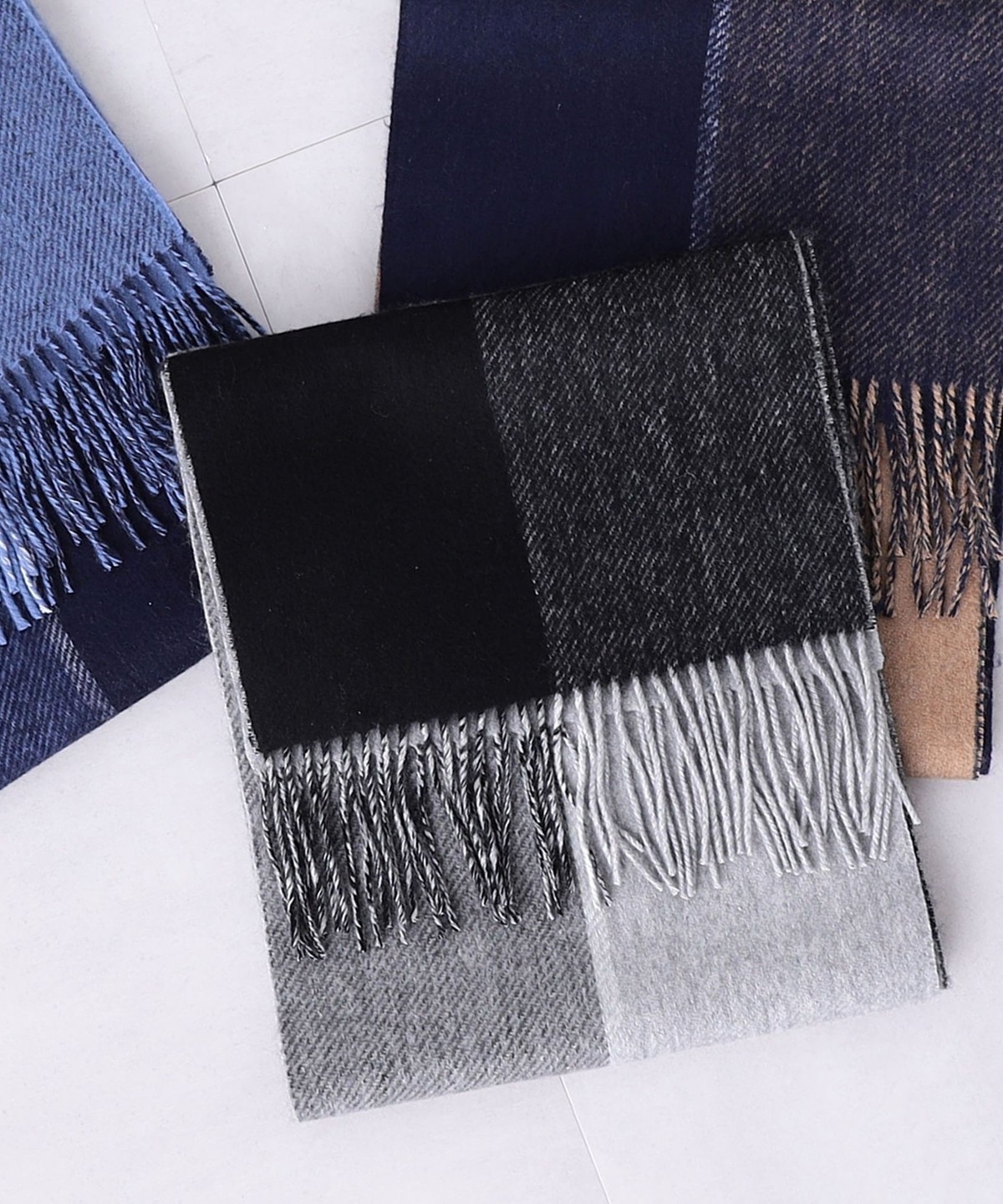 ビジネスからカジュアルまで幅広いシーンで使える、パネルデザインのマフラー