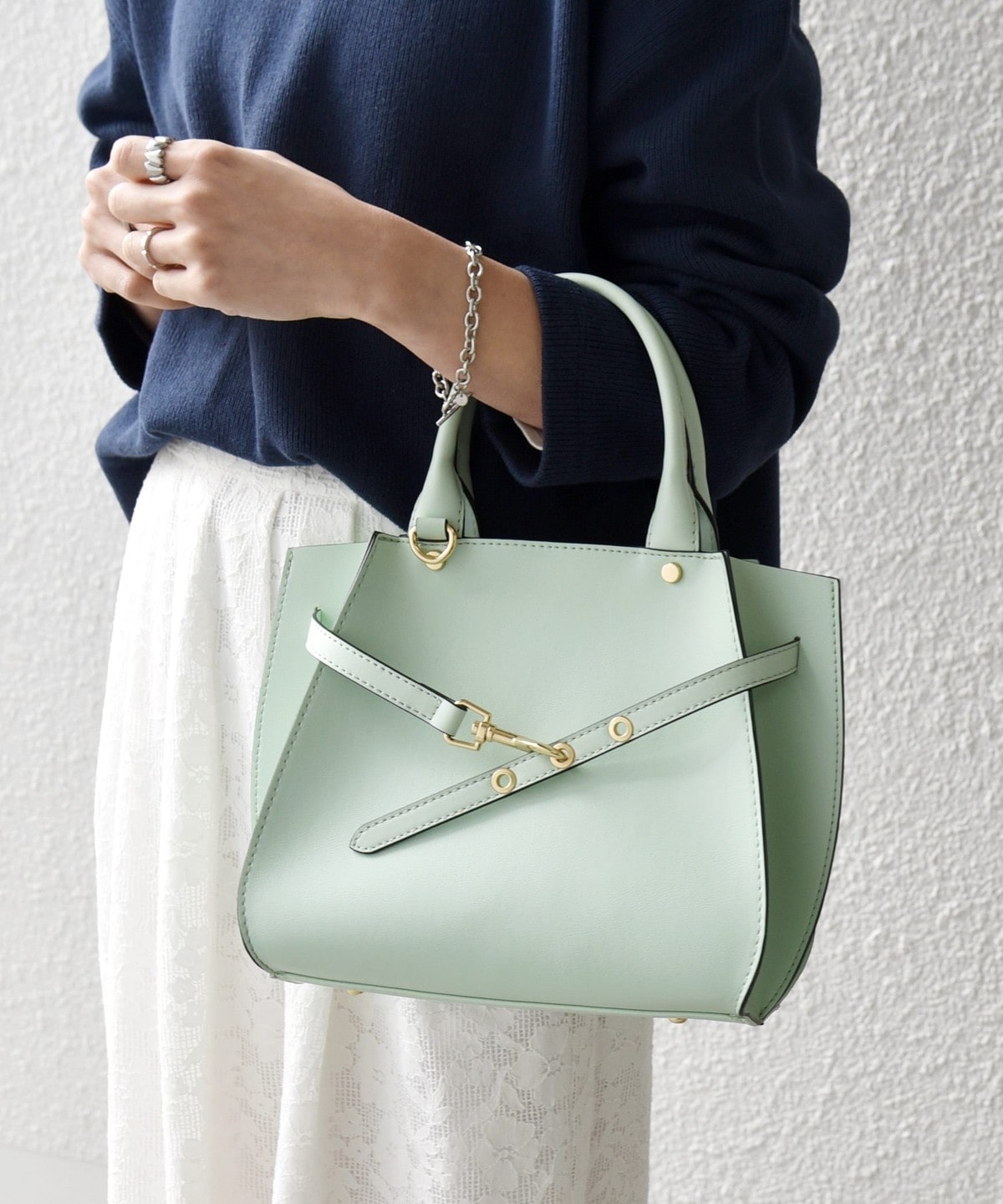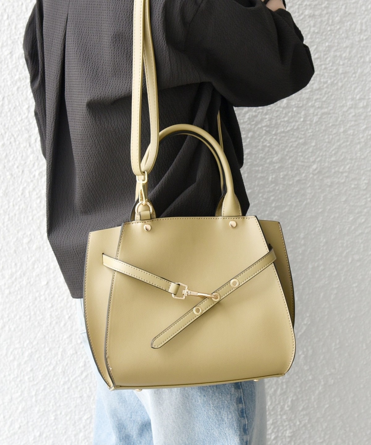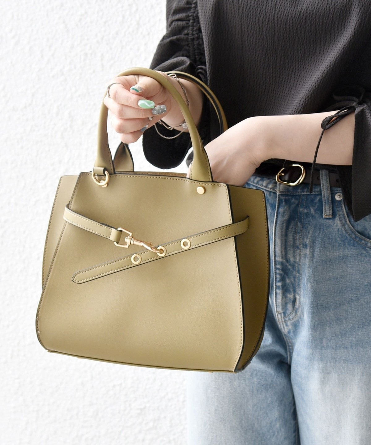 フロントの華奢なベルトが上品さを引き立てるハンドバッグ。