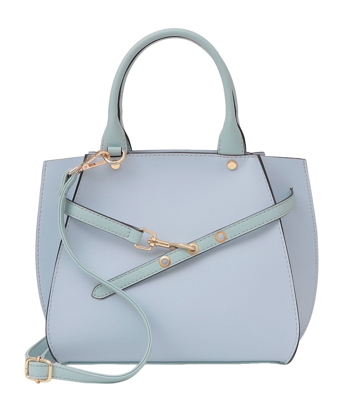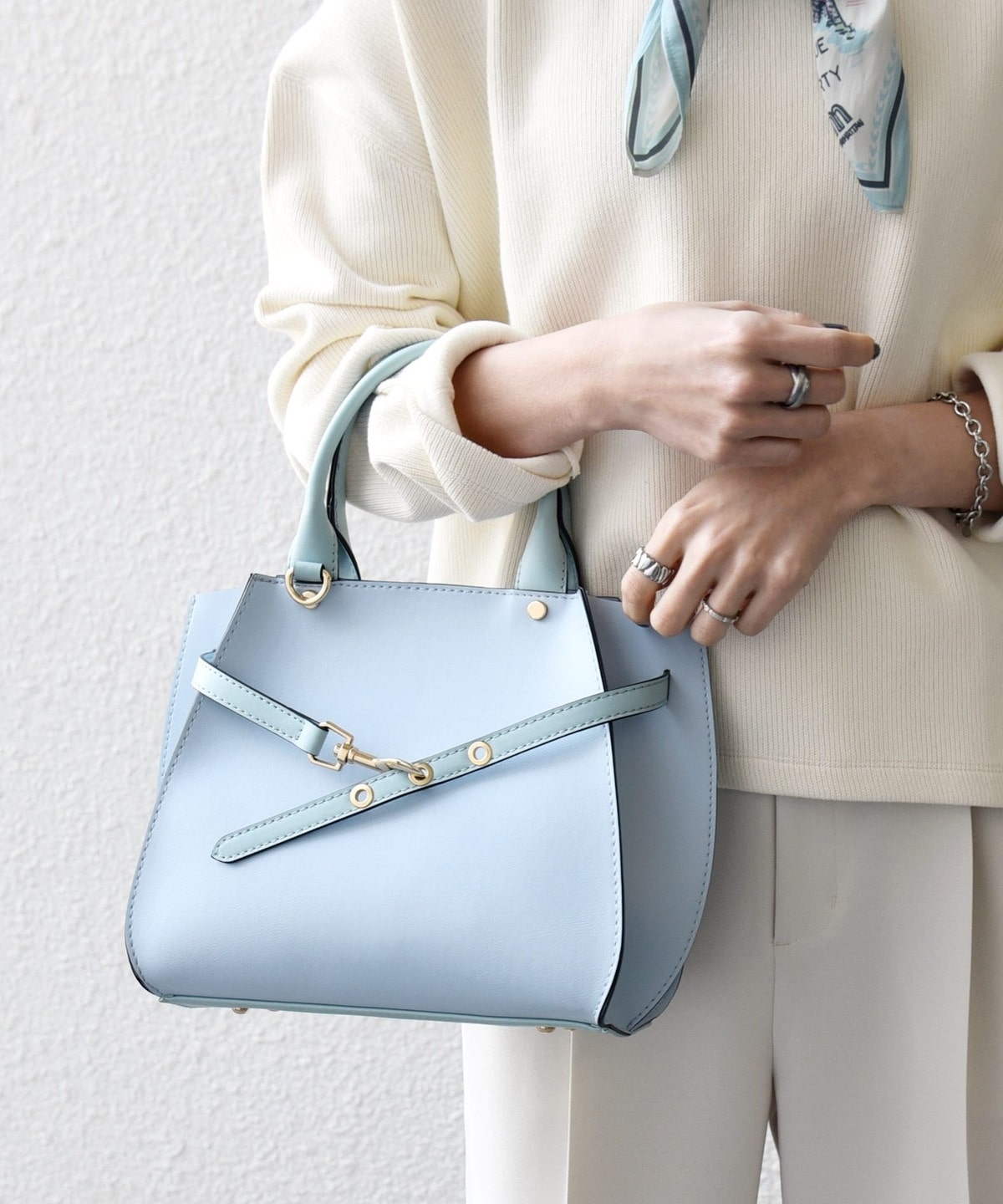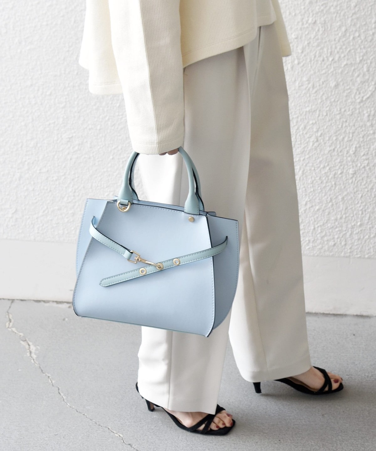 フロントの華奢なベルトが上品さを引き立てるハンドバッグ。