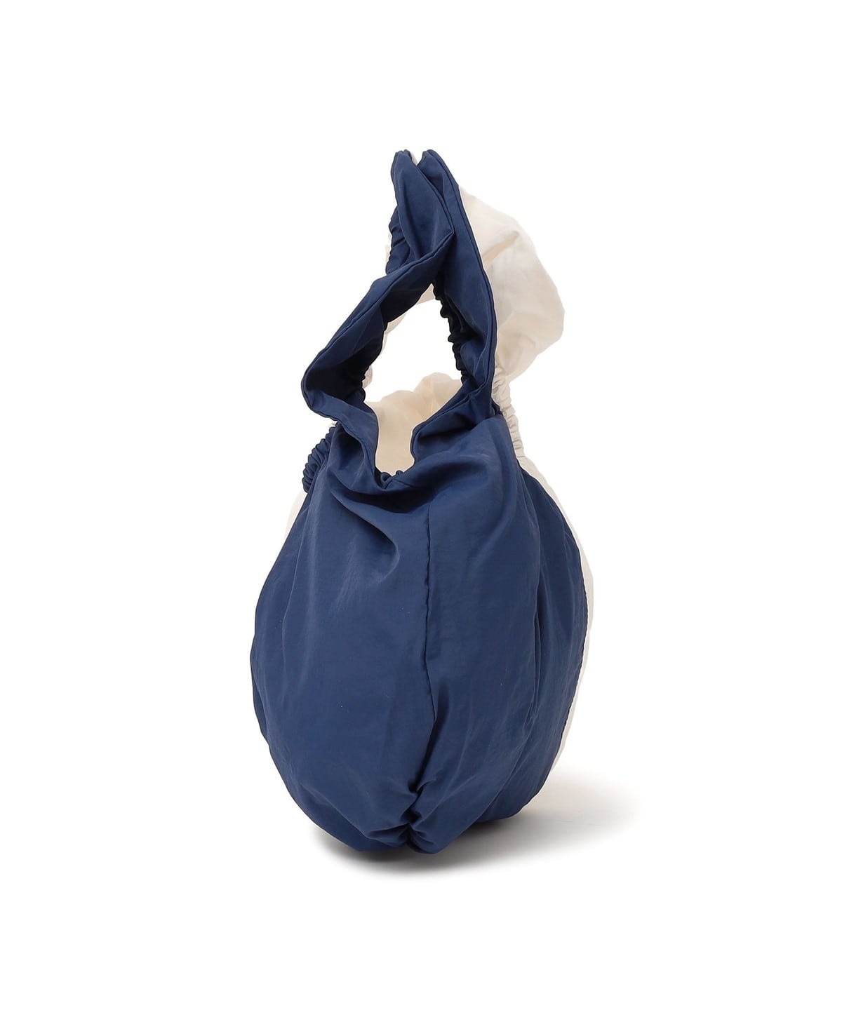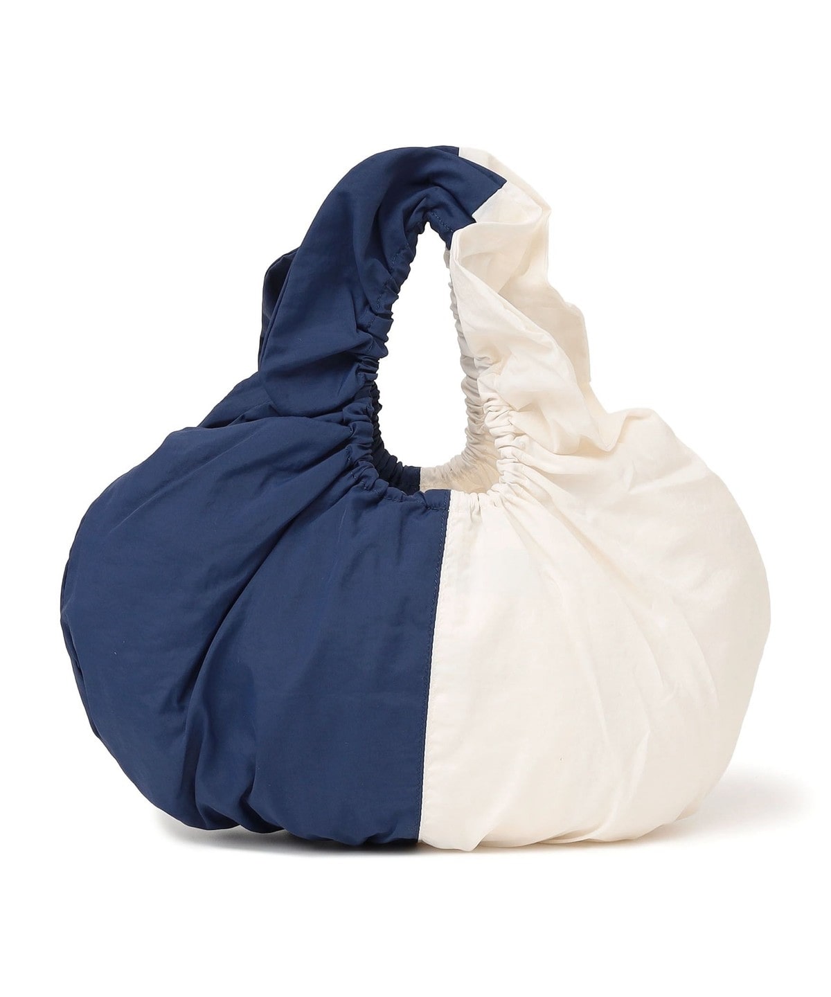 持ち手にゴムを入れた、ラウンドギャザーデザインのハンドバッグ。