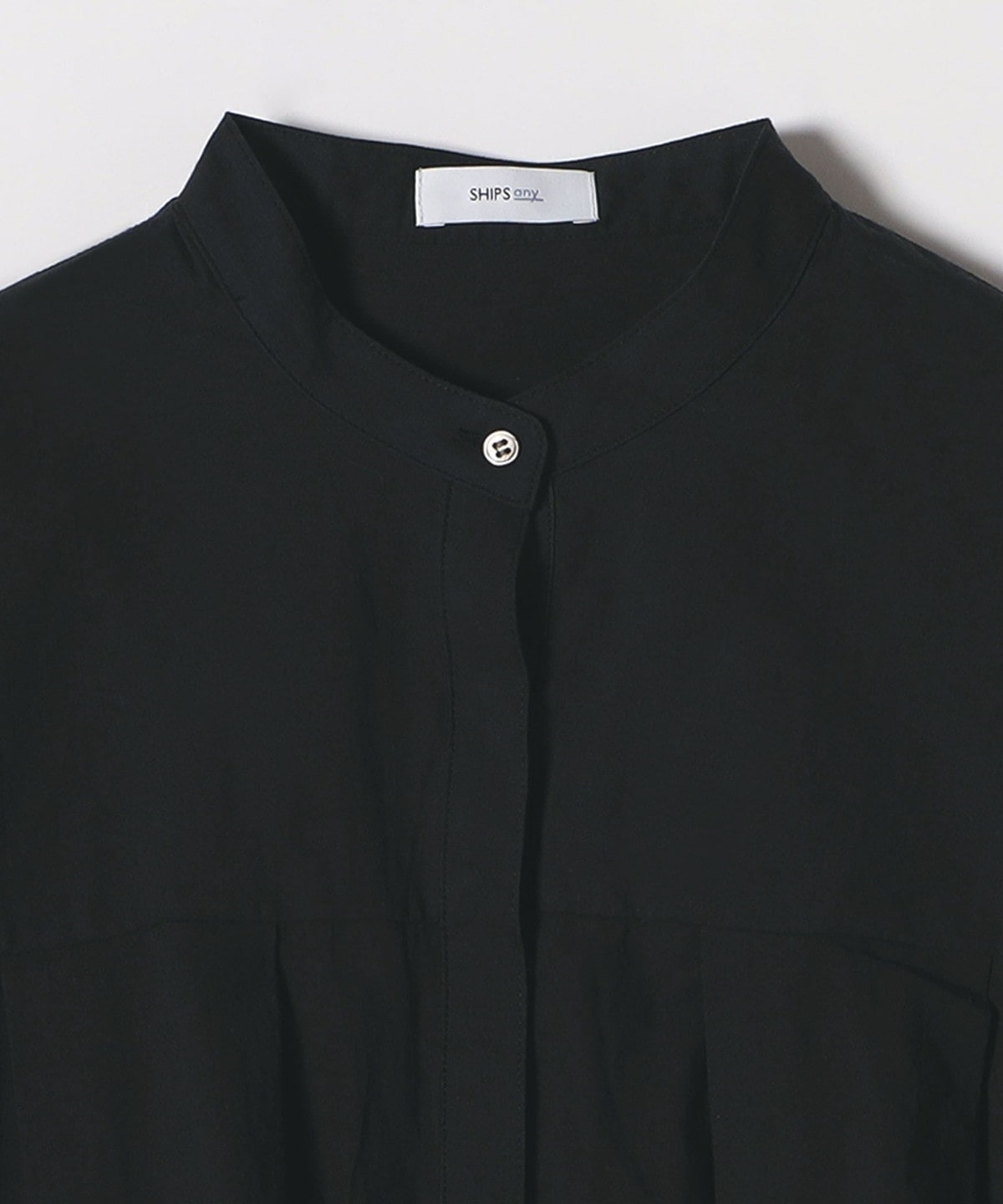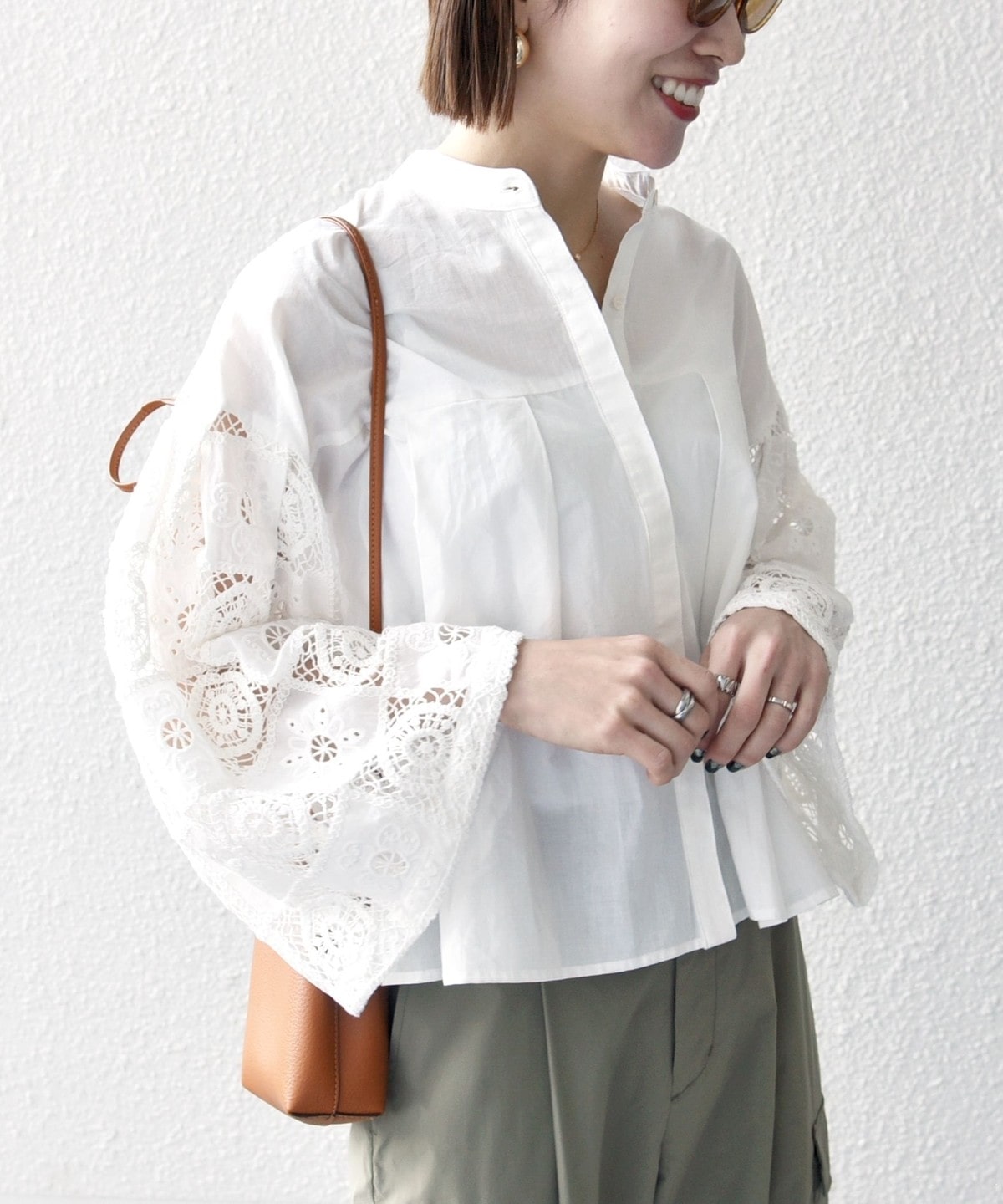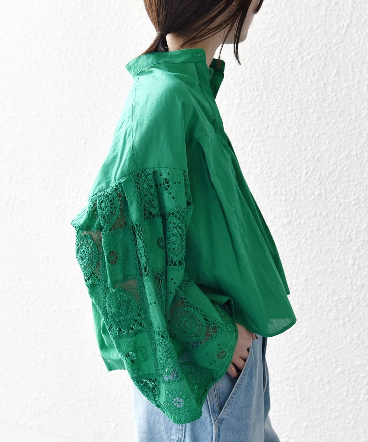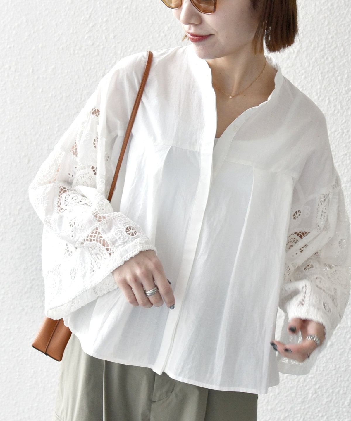 SHIPS any:〈手洗い可能〉パッチワーク レース スリーブ バンドカラー シャツ