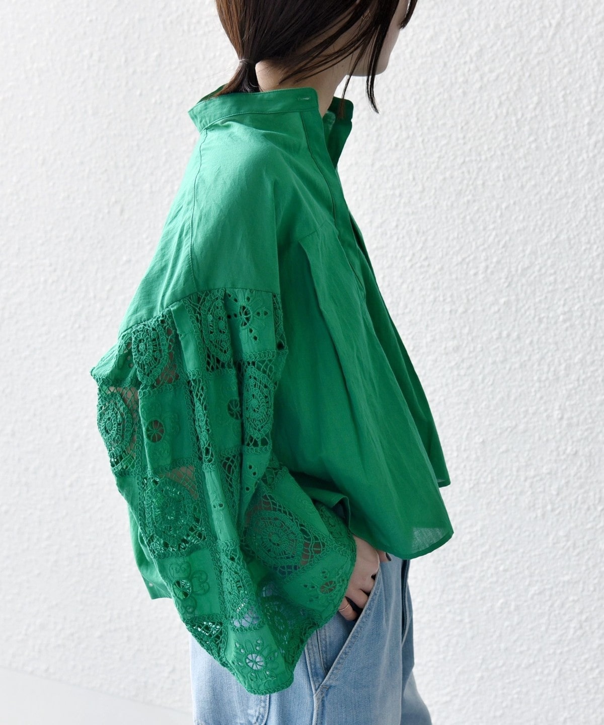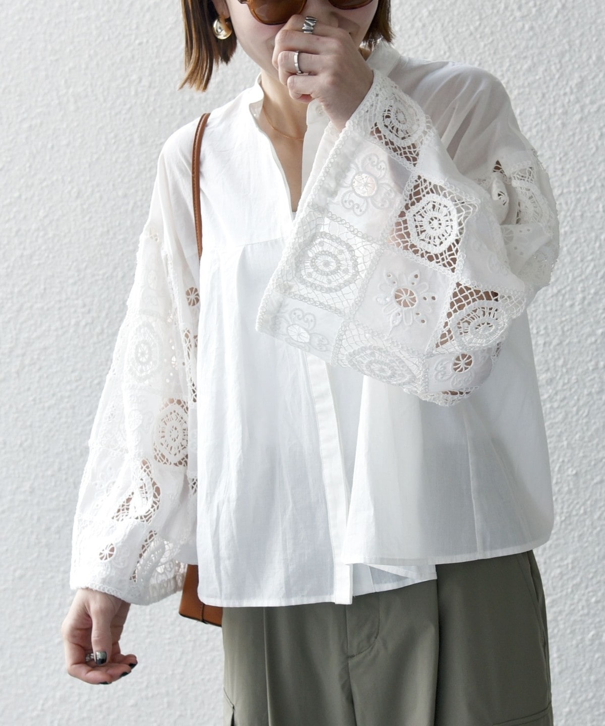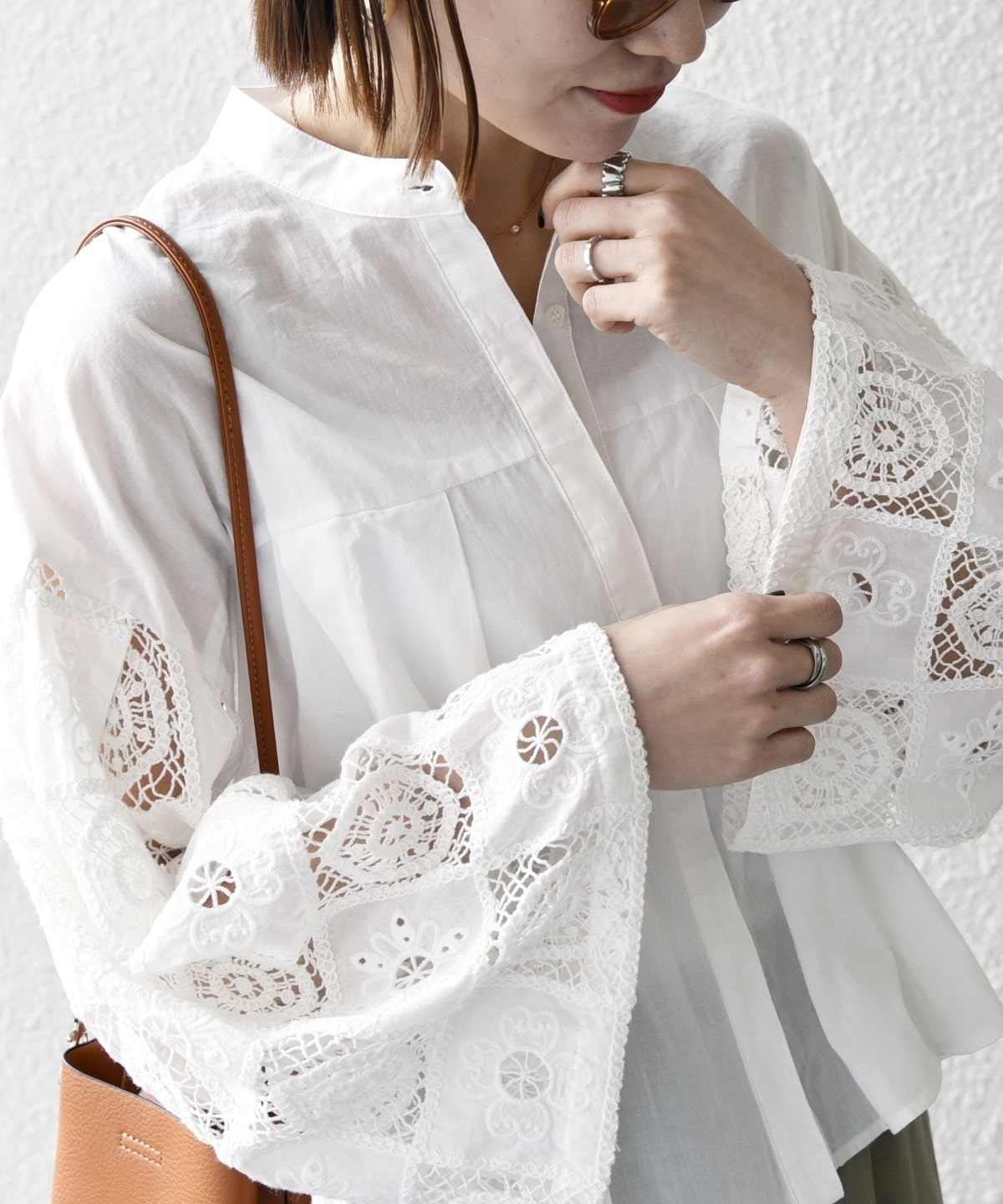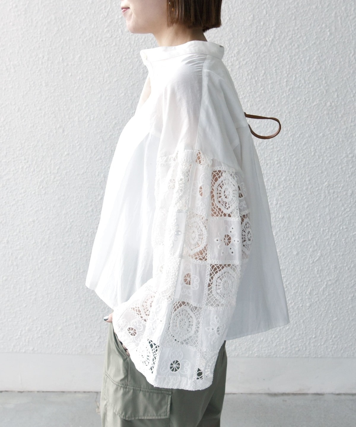 パッチワークのようなブロックレースと刺繍モチーフが存在感のあるシャツブラウス。