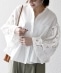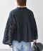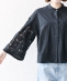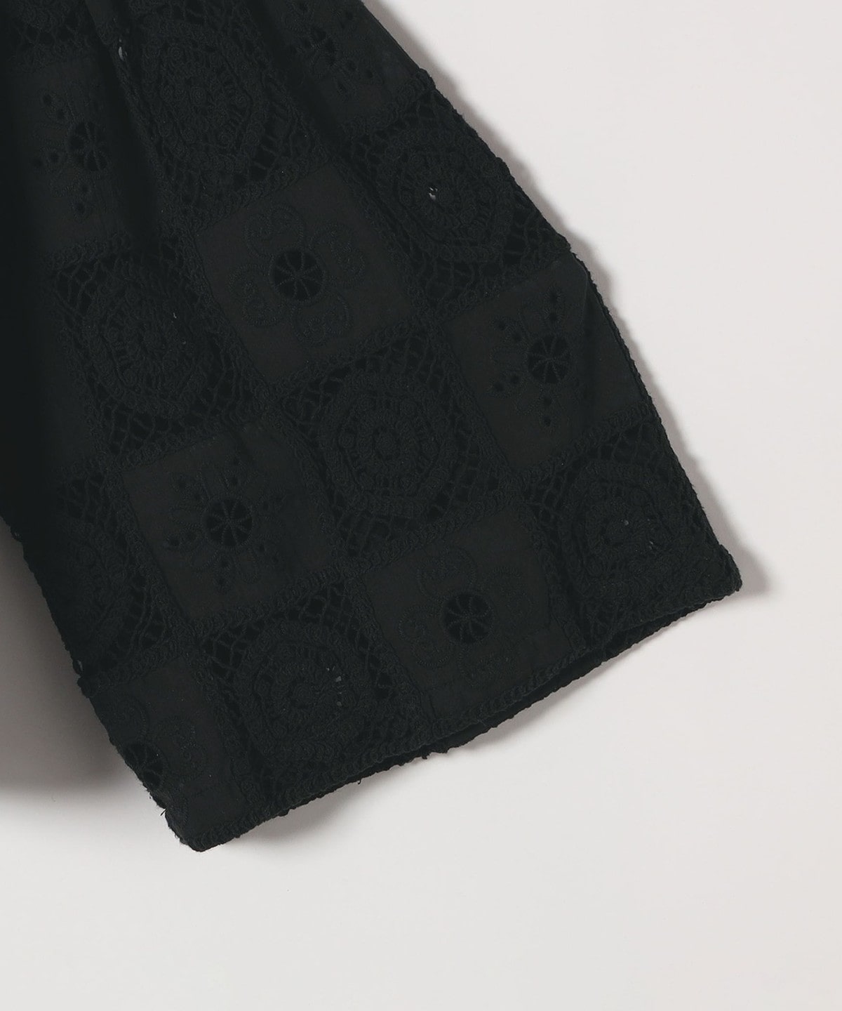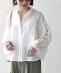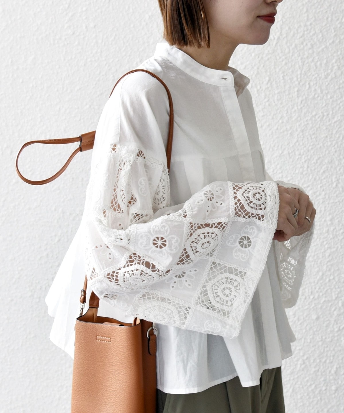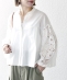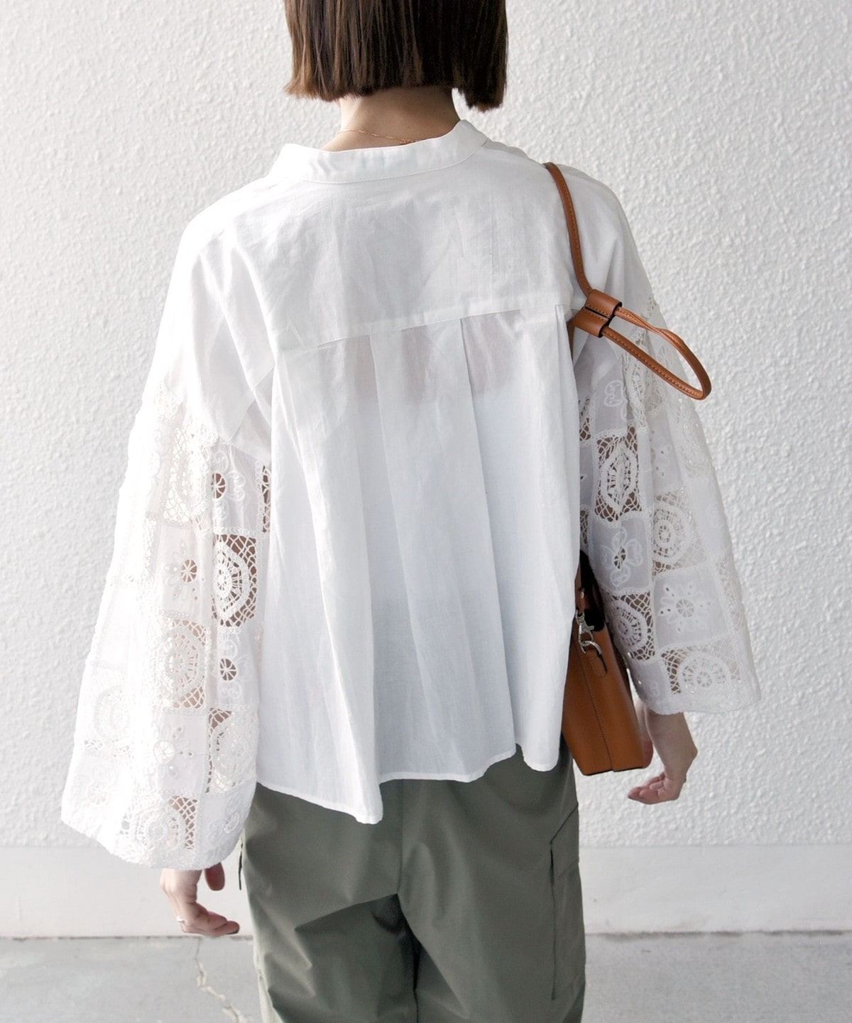 パッチワークのようなブロックレースと刺繍モチーフが存在感のあるシャツブラウス。