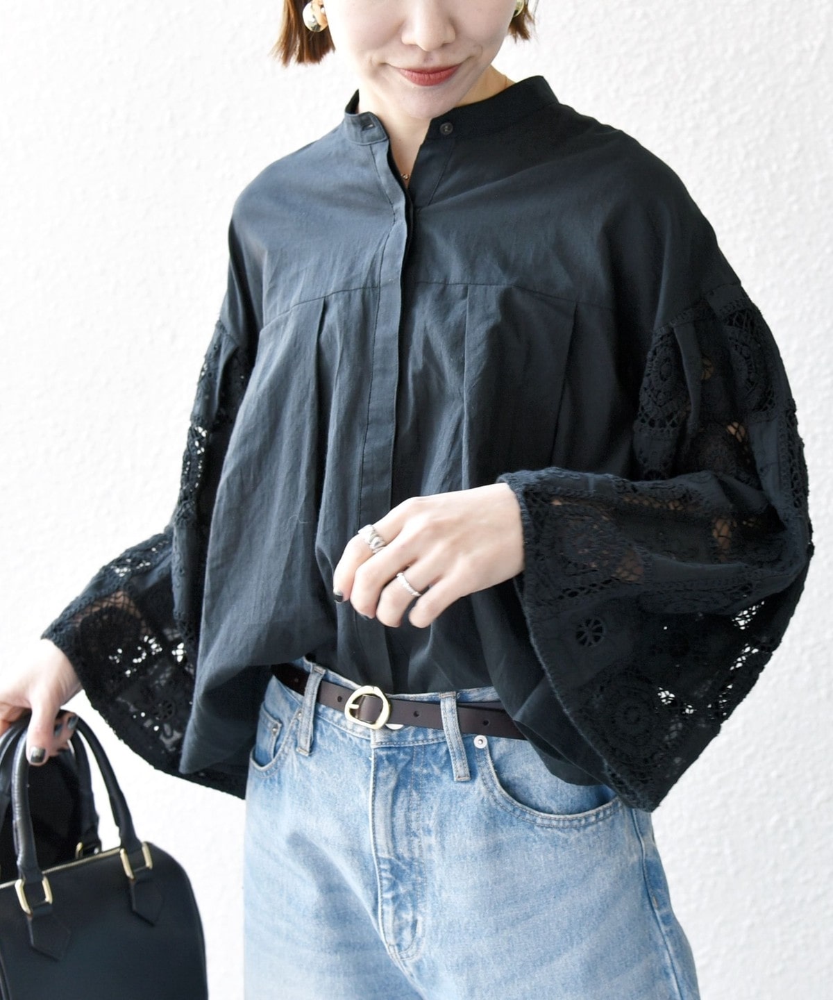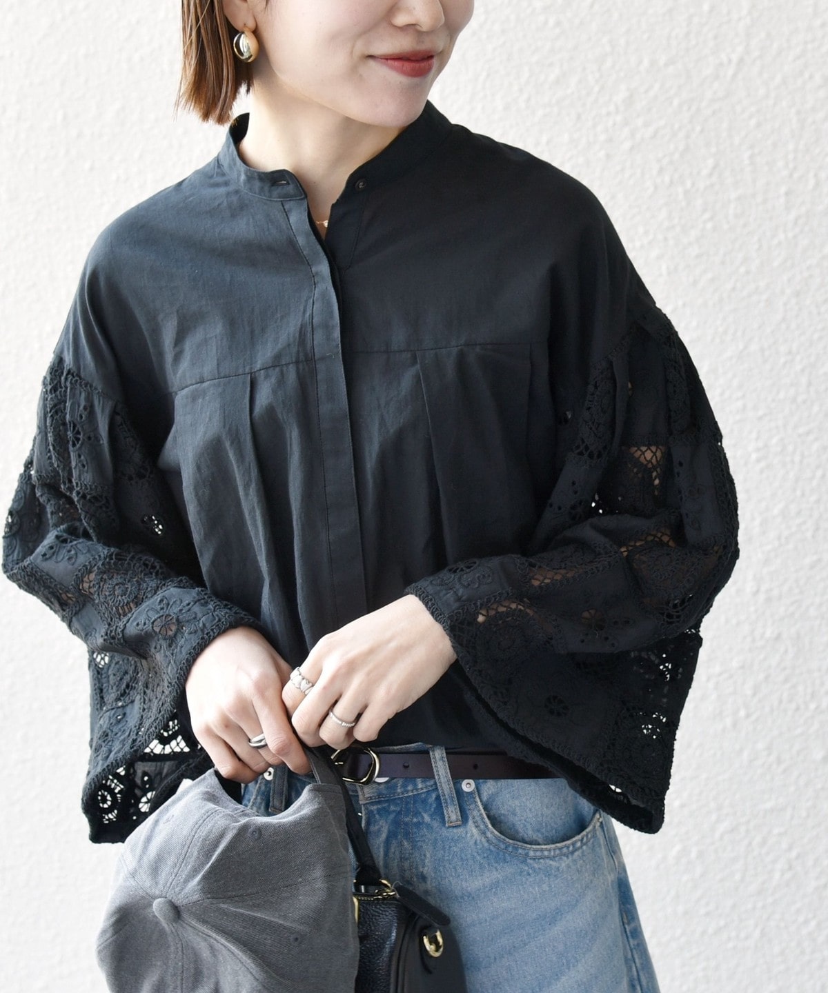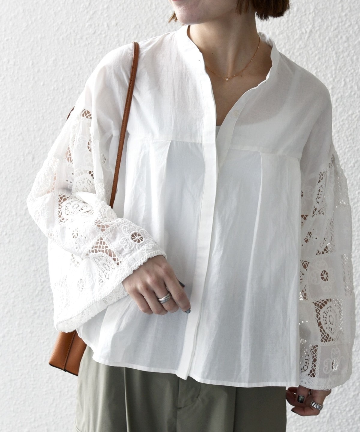 きちんと感のあるバンドカラーと、レースの透け感のバランスが絶妙な一着。