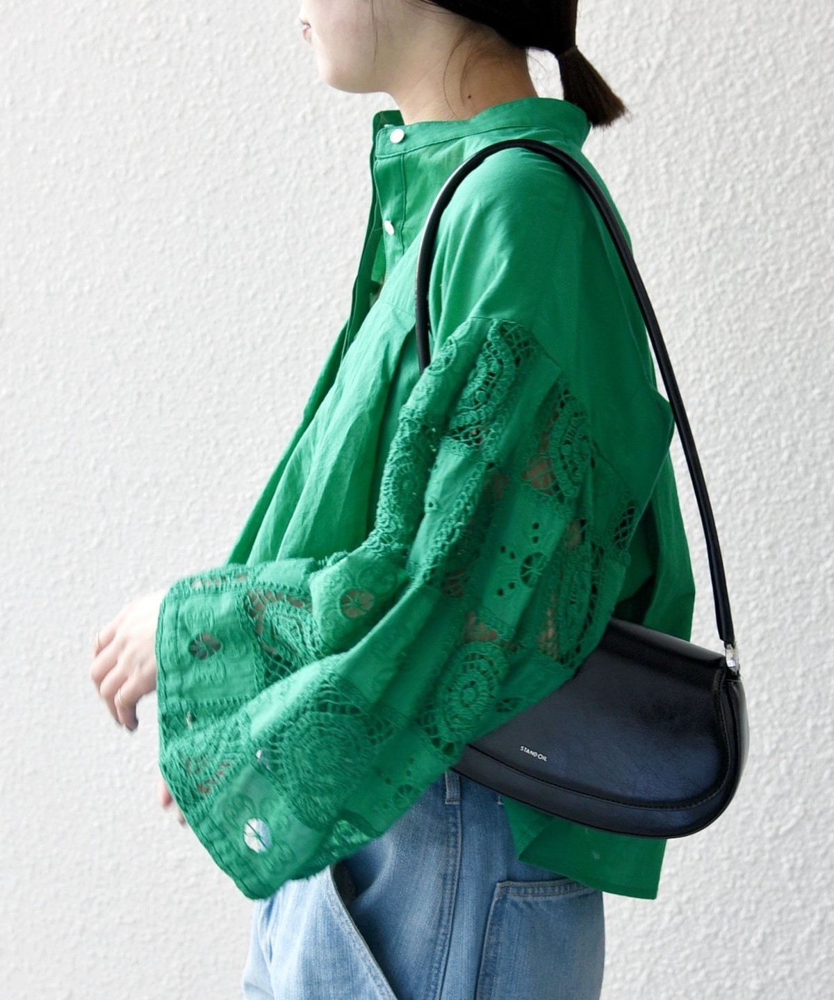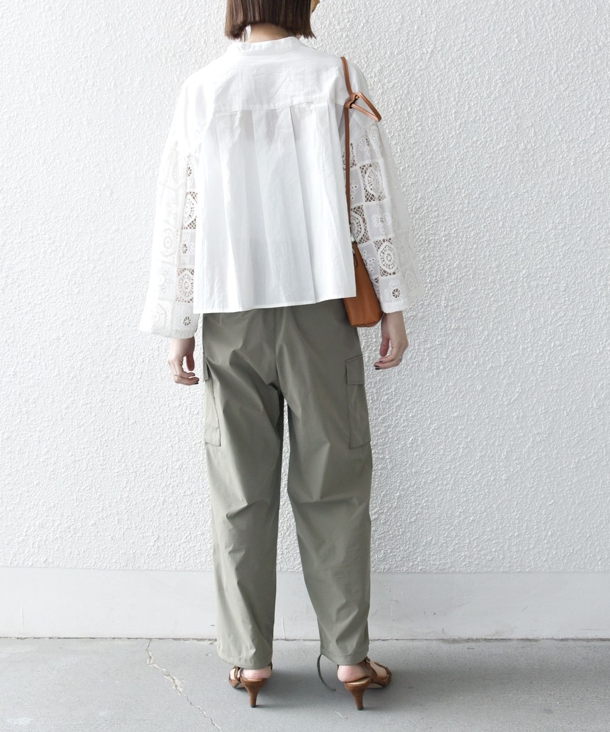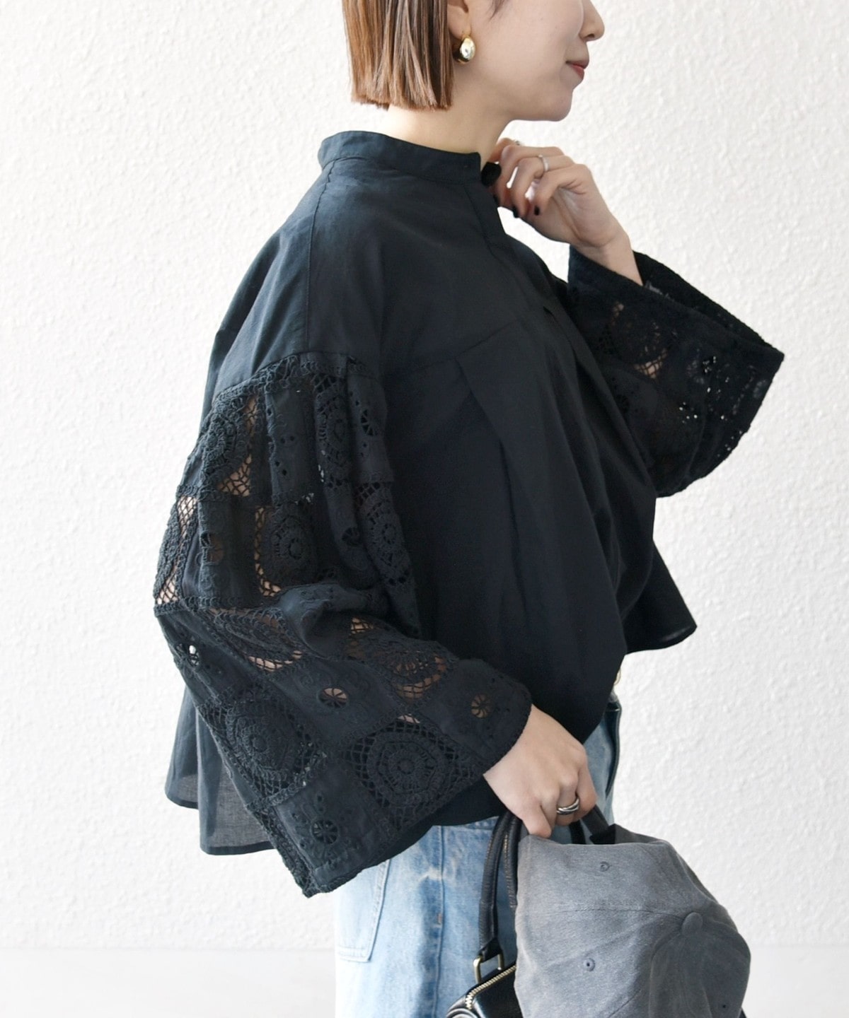 きちんと感のあるバンドカラーと、レースの透け感のバランスが絶妙な一着。