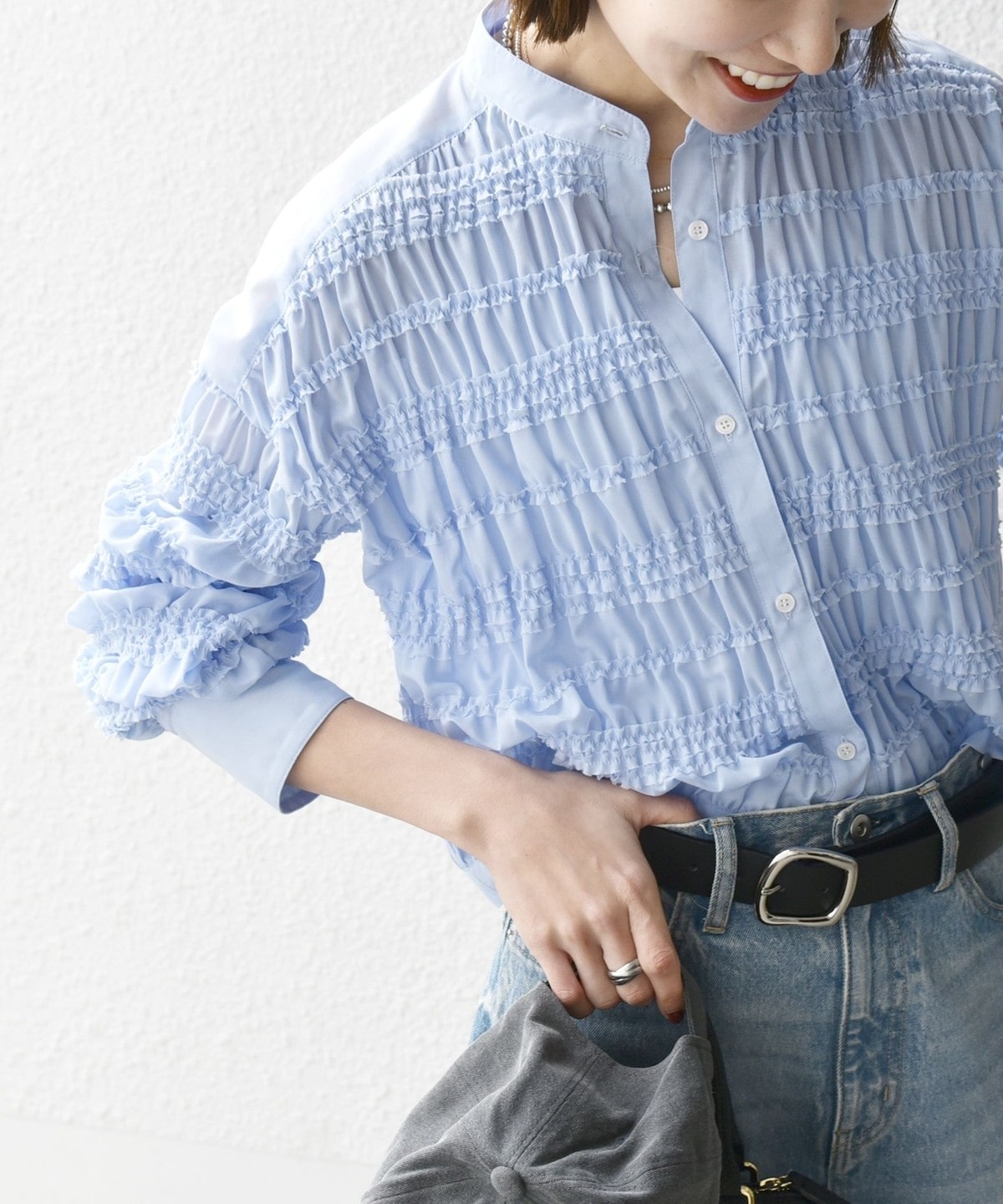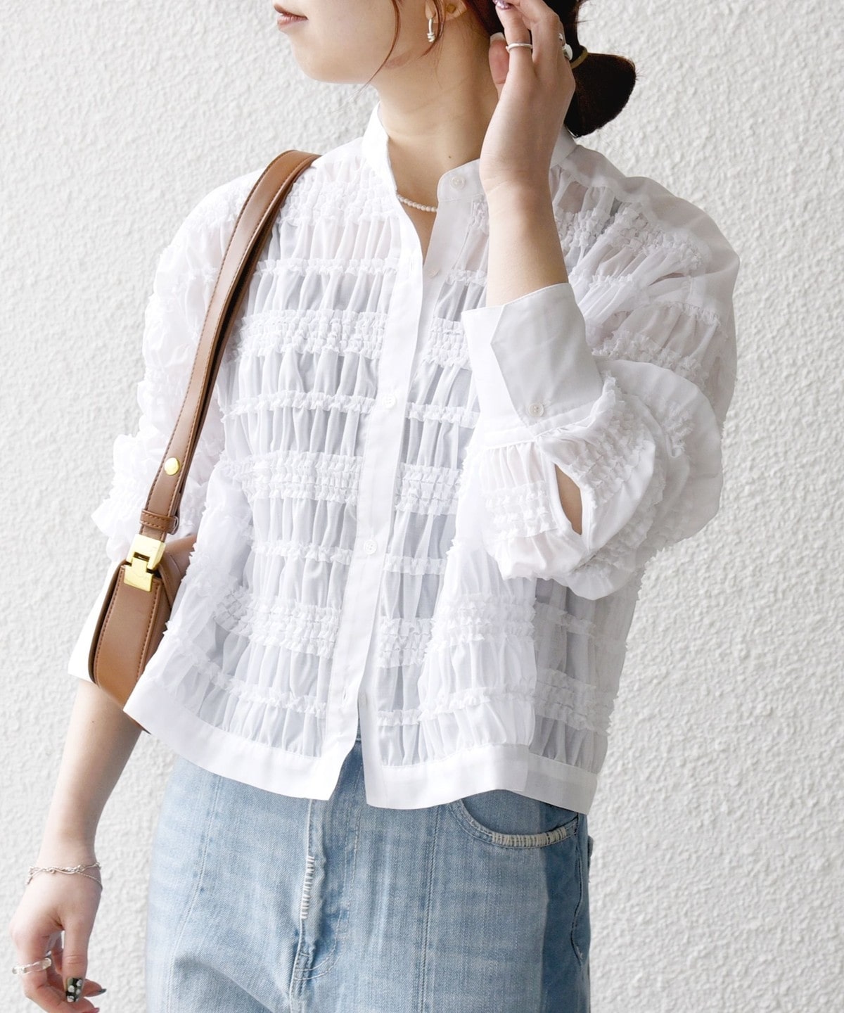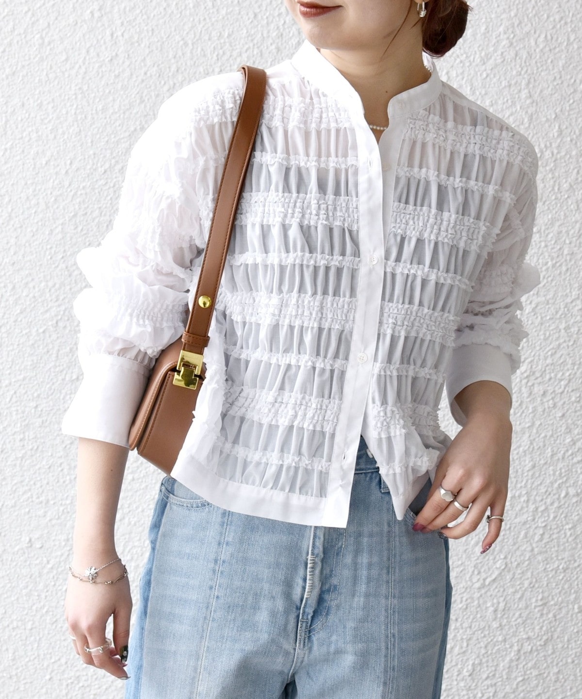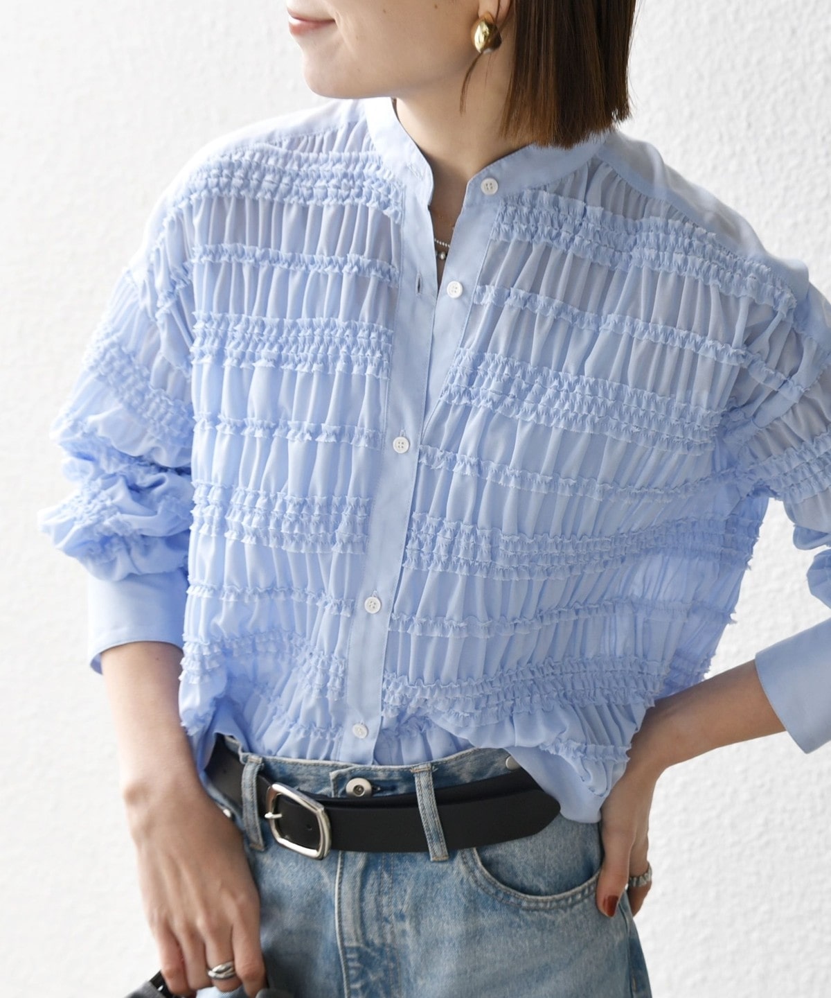 SHIPS any:〈手洗い可能〉シアー フリル バンドカラー パフ シャツ ブラウス