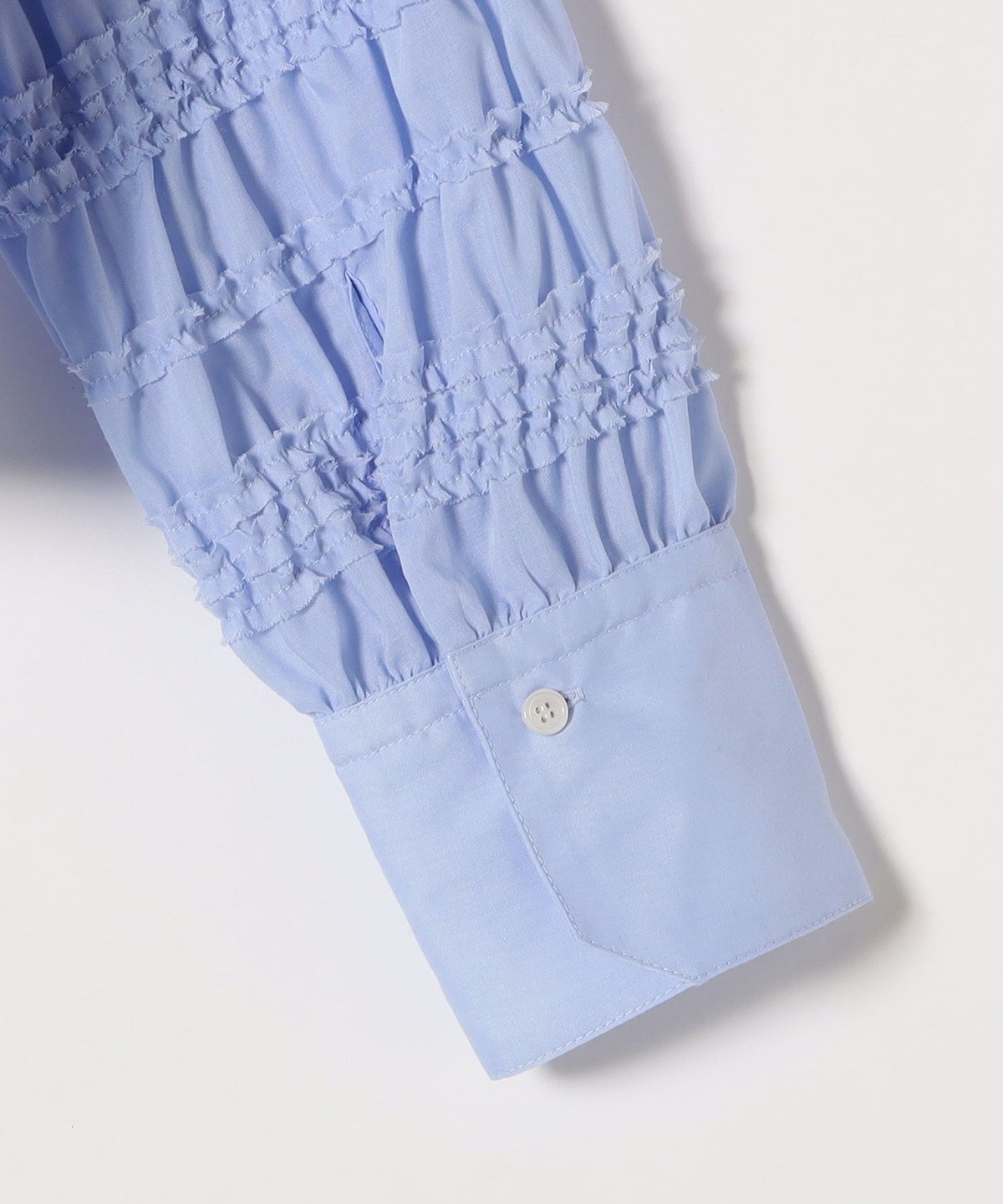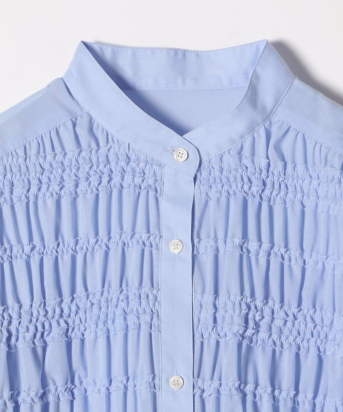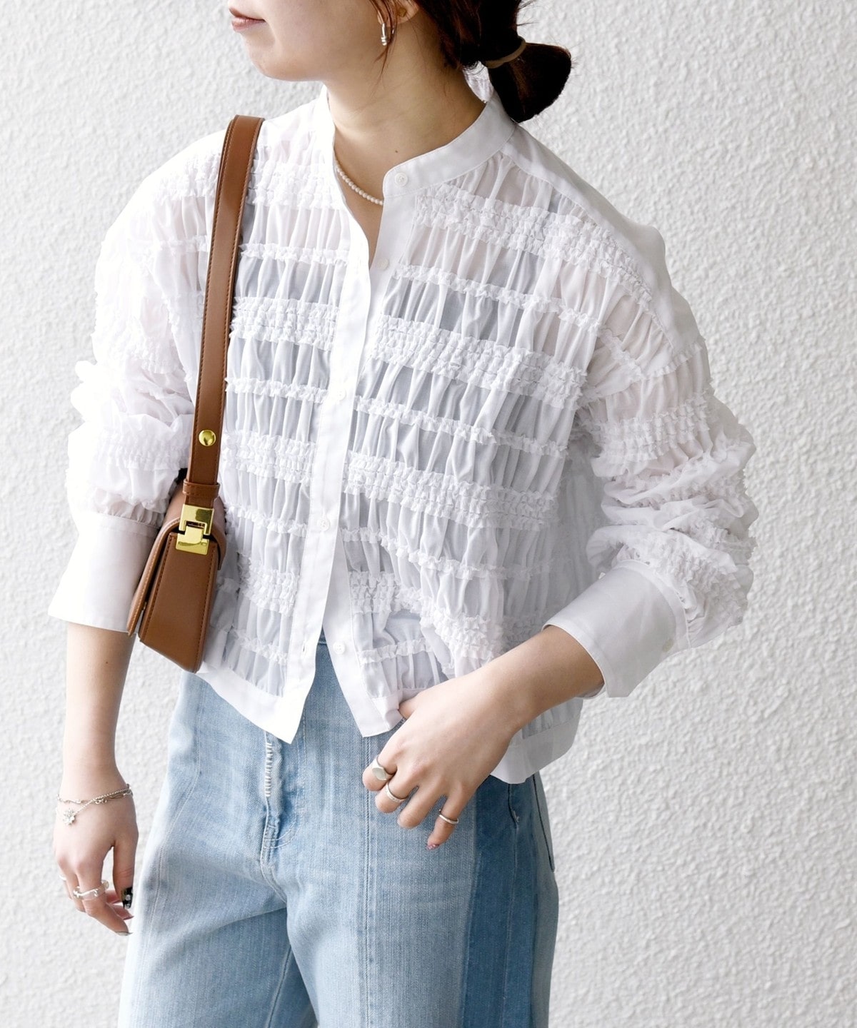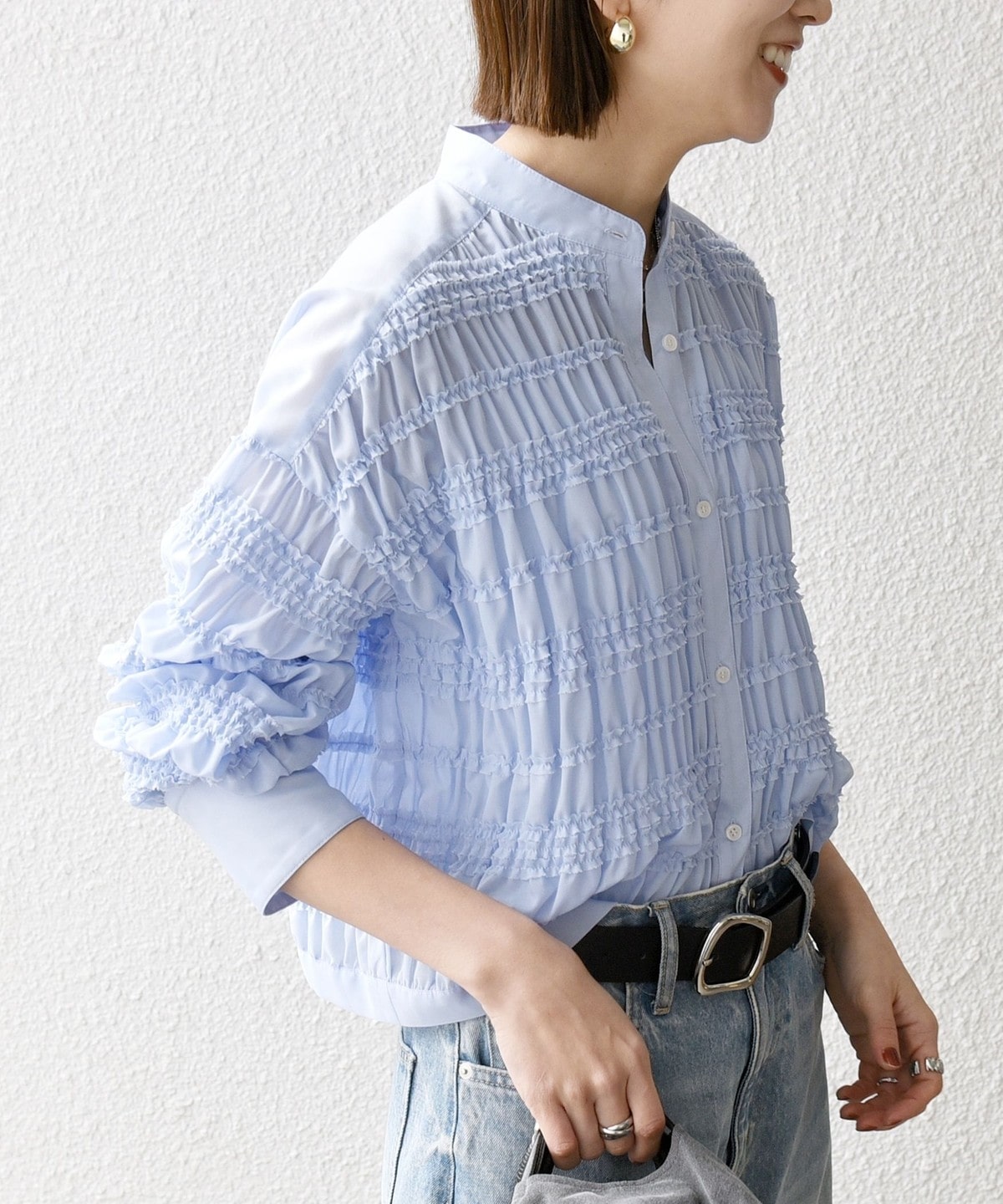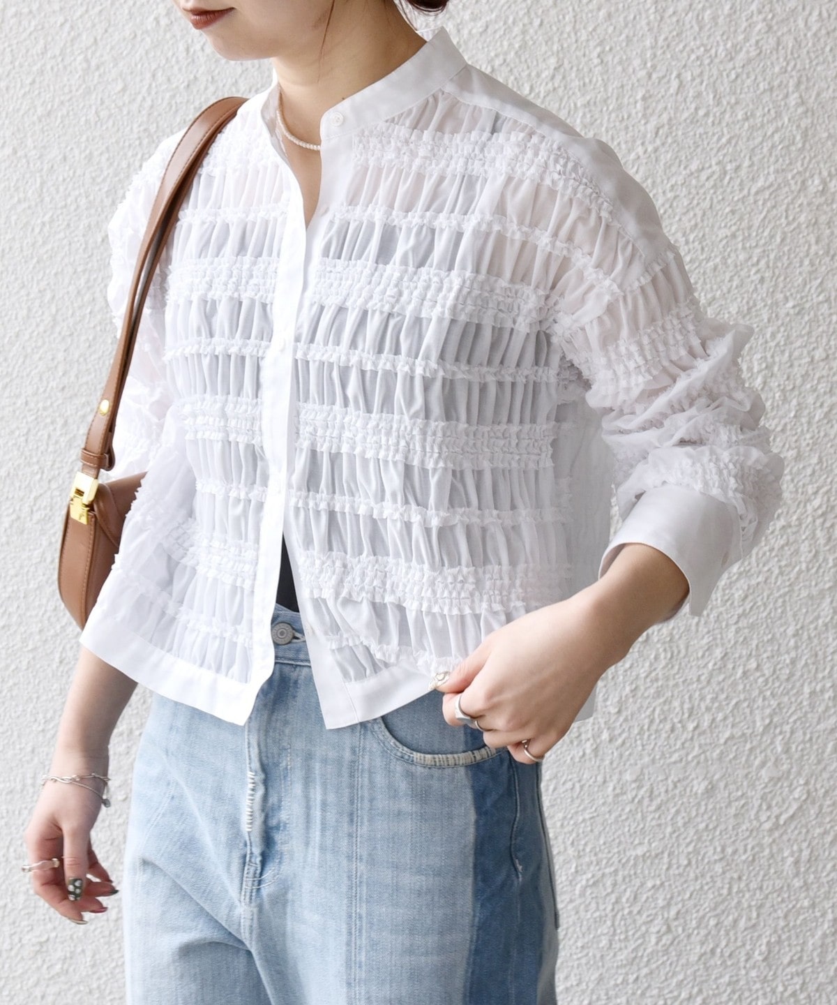 SHIPS any:〈手洗い可能〉シアー フリル バンドカラー パフ シャツ ブラウス